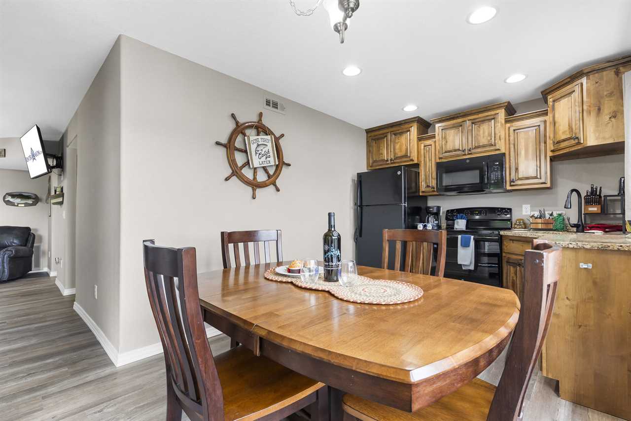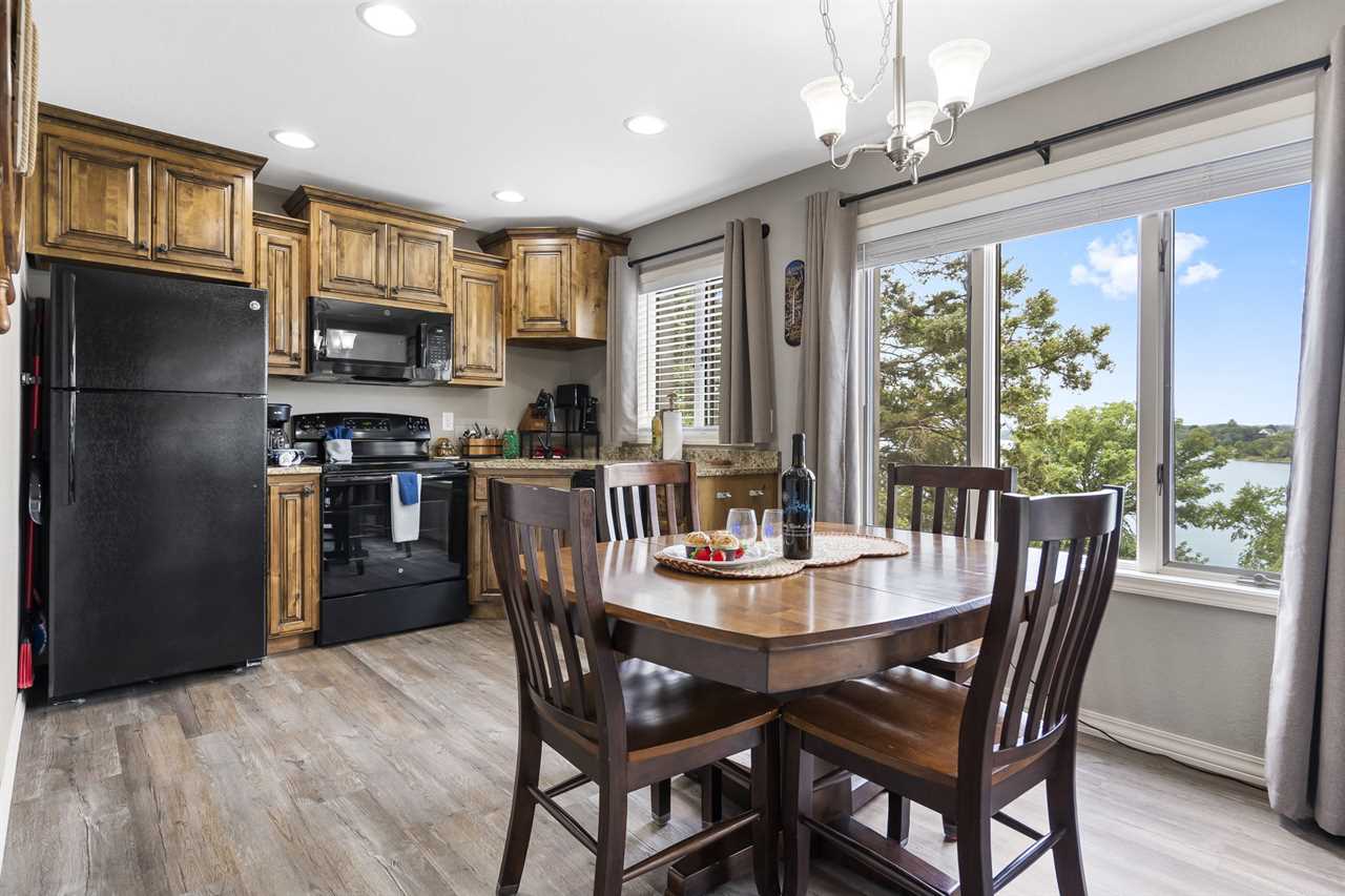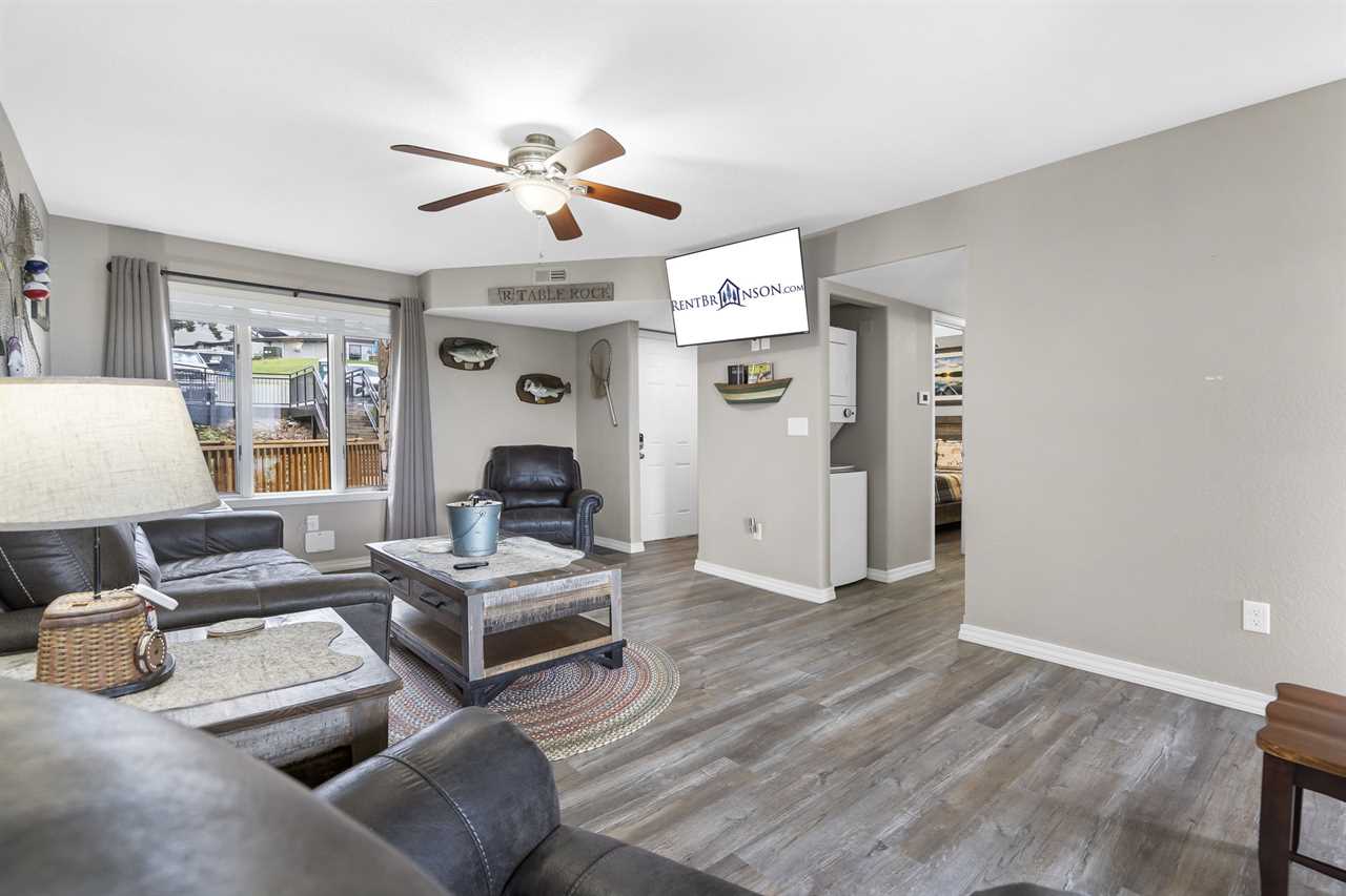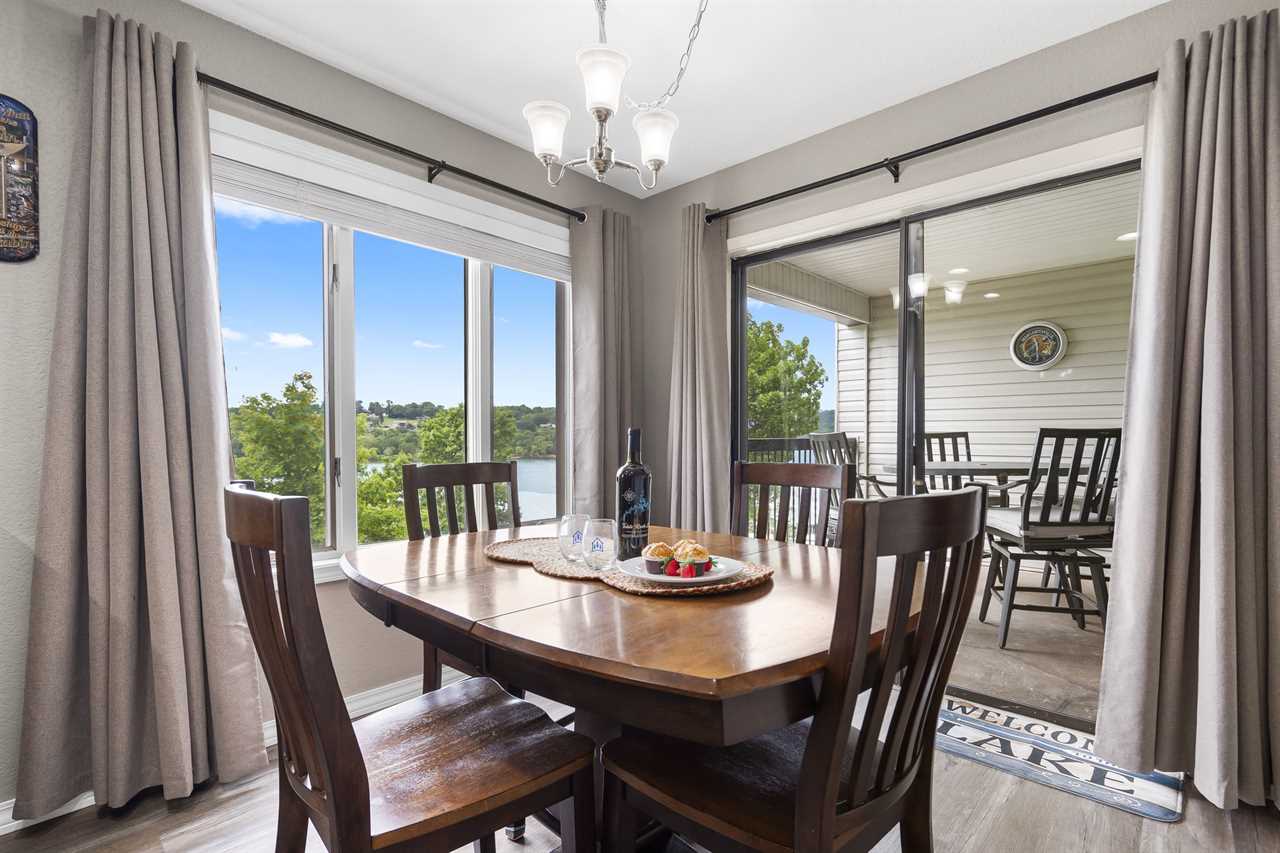 Inside you'll find a large living area to cozy up in for a movie night. The well-equipped kitchen is great for cooking up your latest catch from Table Rock Lake! Enjoy any meal at the dining table where natural light floods in from the sliding door. Out on the deck, sip on your favorite beverage with a great view of the shoreline.