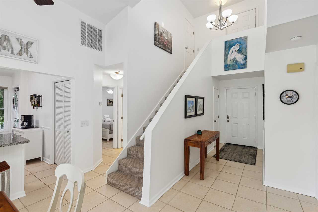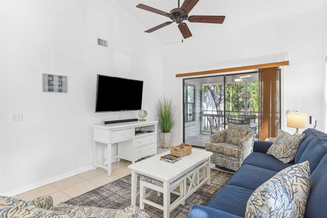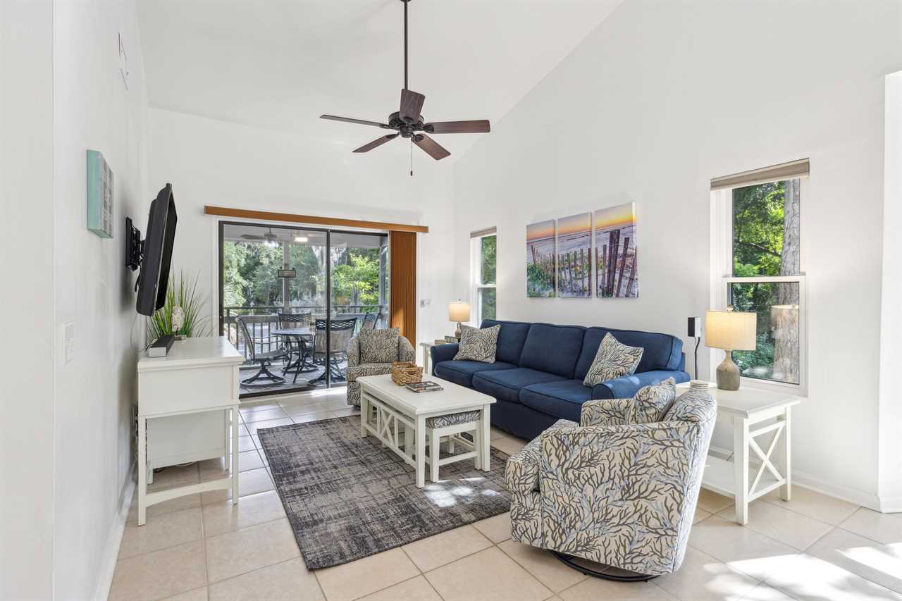 Take an easy walk up 18 steps from the parking level to reach your dreamy second-floor getaway. Step into the naturally lit coastal living room, where every detail is thoughtfully designed for perfect relaxation. Enjoy the expansive feel of the vaulted ceilings, and step out onto the covered screened patio with serene Southern nature views—ideal for post-activity get-togethers. Catch the game on TV or unwind with a beverage of your choice on the comfortable furniture, making plans and sharing stories.
