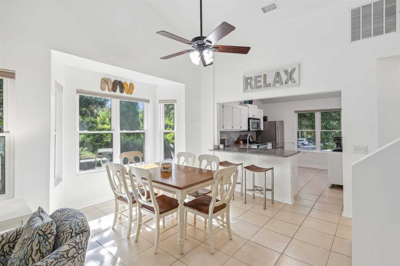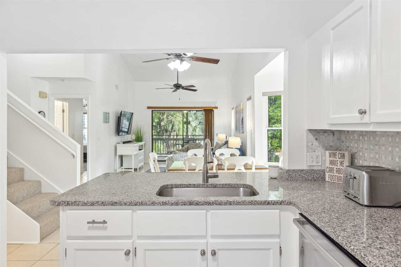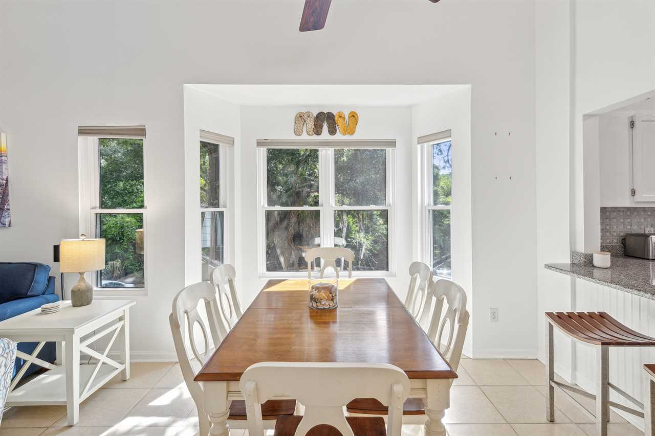 Take an easy walk up 18 steps from the parking level to reach your dreamy second-floor getaway. Step into the naturally lit coastal living room, where every detail is thoughtfully designed for perfect relaxation. Enjoy the expansive feel of the vaulted ceilings, and step out onto the covered screened patio with serene Southern nature views—ideal for post-activity get-togethers. Catch the game on TV or unwind with a beverage of your choice on the comfortable furniture, making plans and sharing stories.