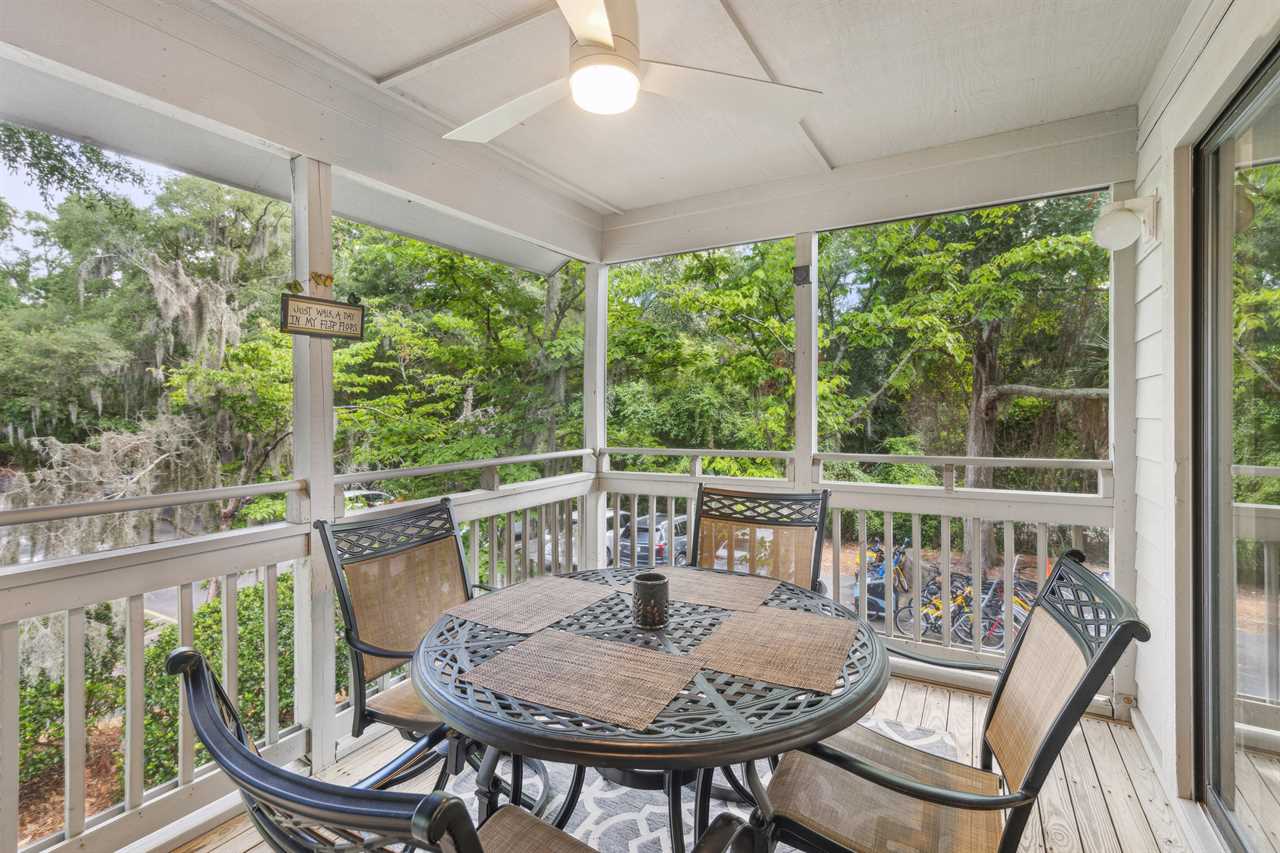 ✓ Serene covered screened patio with wooded views and seating for 4