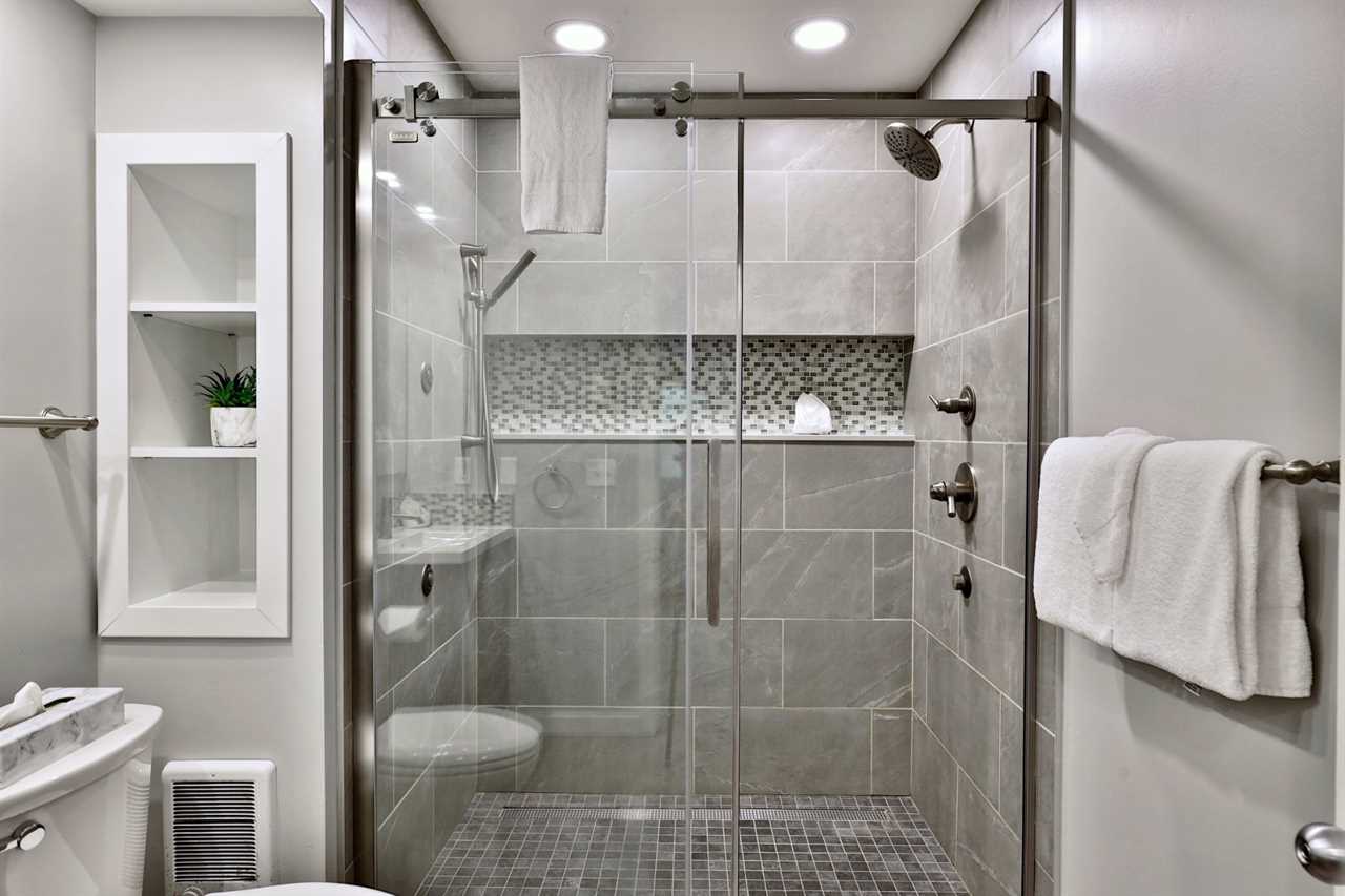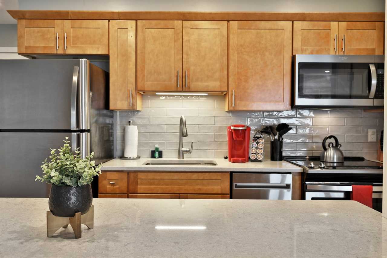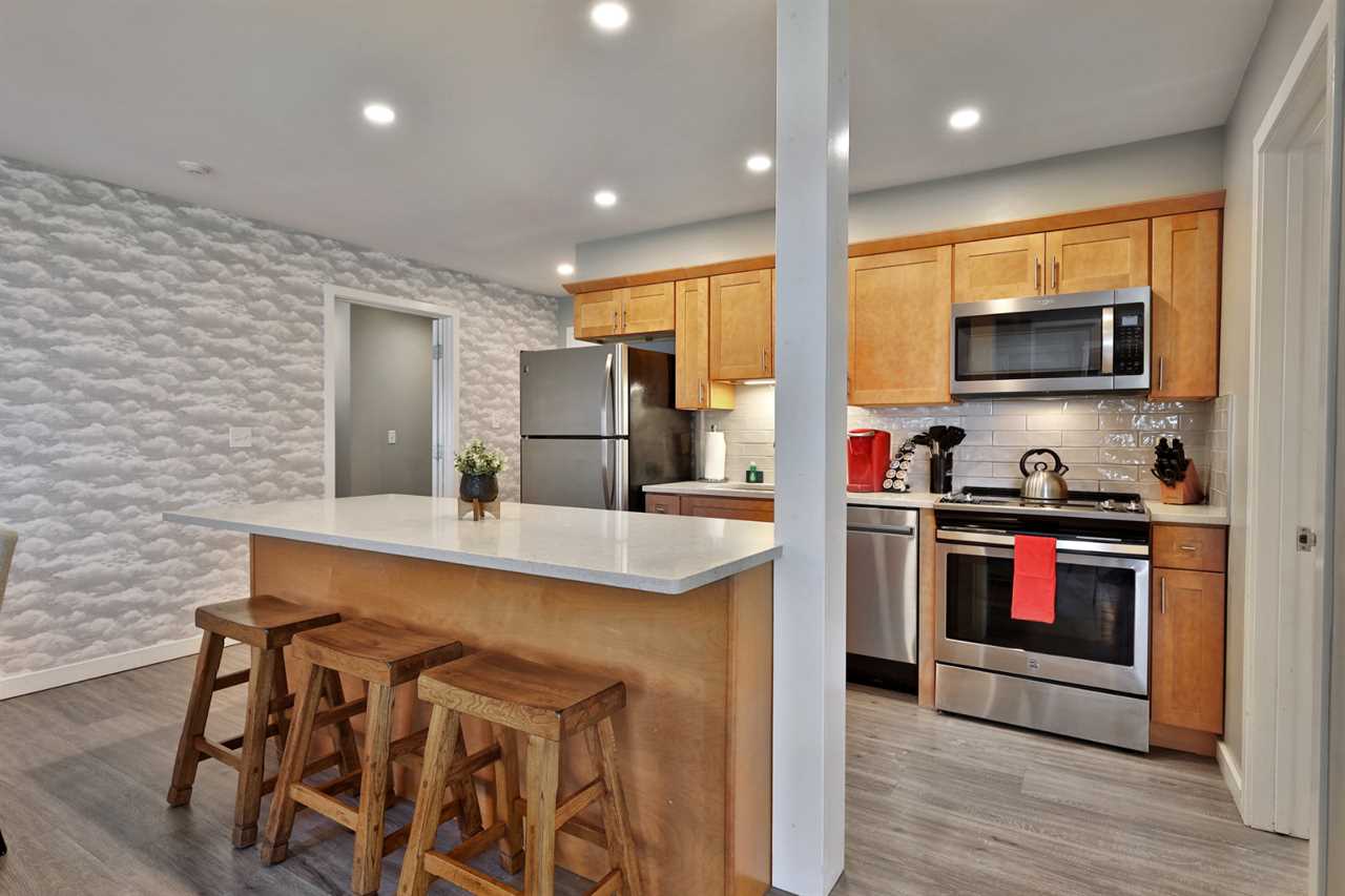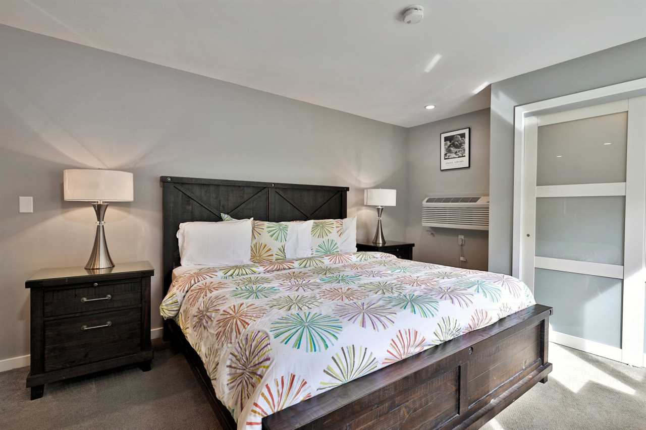 The main suite features an open-concept living area with a fully equipped kitchen, stainless steel appliances, and a kitchen island with seating for four. A high-top dining table adds space for six, and the cozy living room boasts a gas fireplace, a smart TV, high-speed Wi-Fi, a queen bed, and a sofa bed. Step into the updated bathroom, complete with a luxurious shower, or slide open the patio doors for a breath of fresh mountain air.