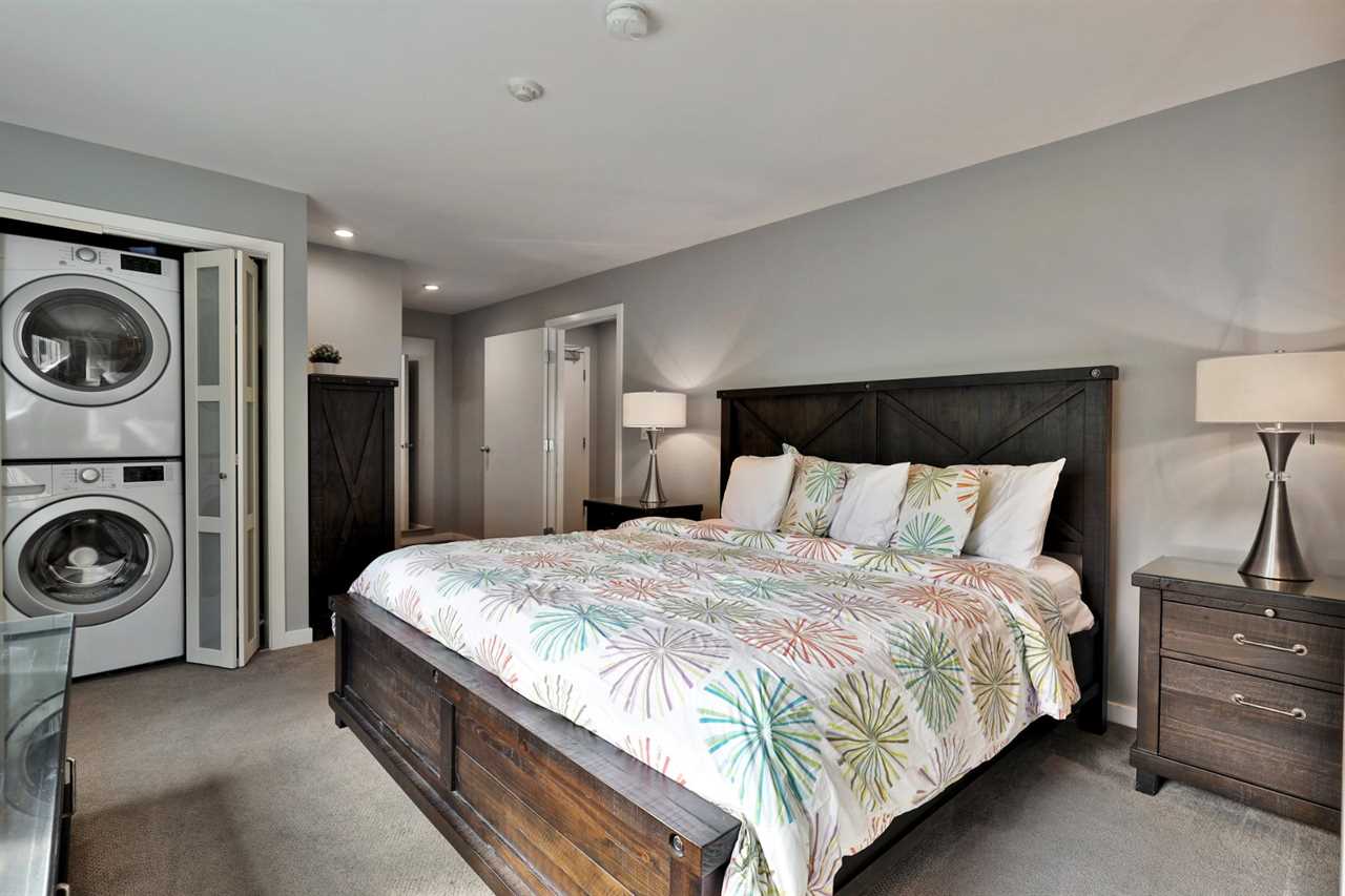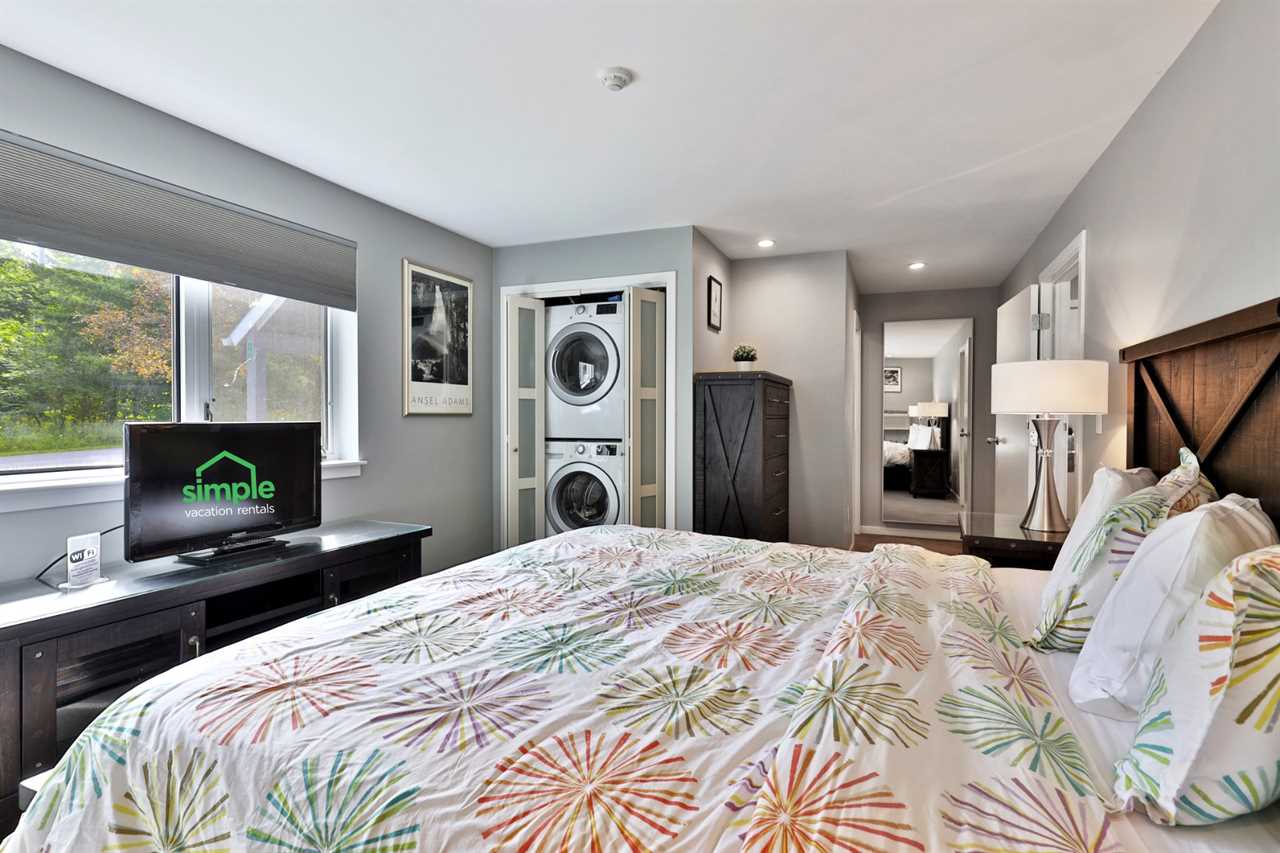 The primary bedroom offers a king bed, an ensuite bathroom with a tub/shower combo, a washer/dryer, and a second smart TV with streaming services—perfect for relaxing after a day of outdoor fun.