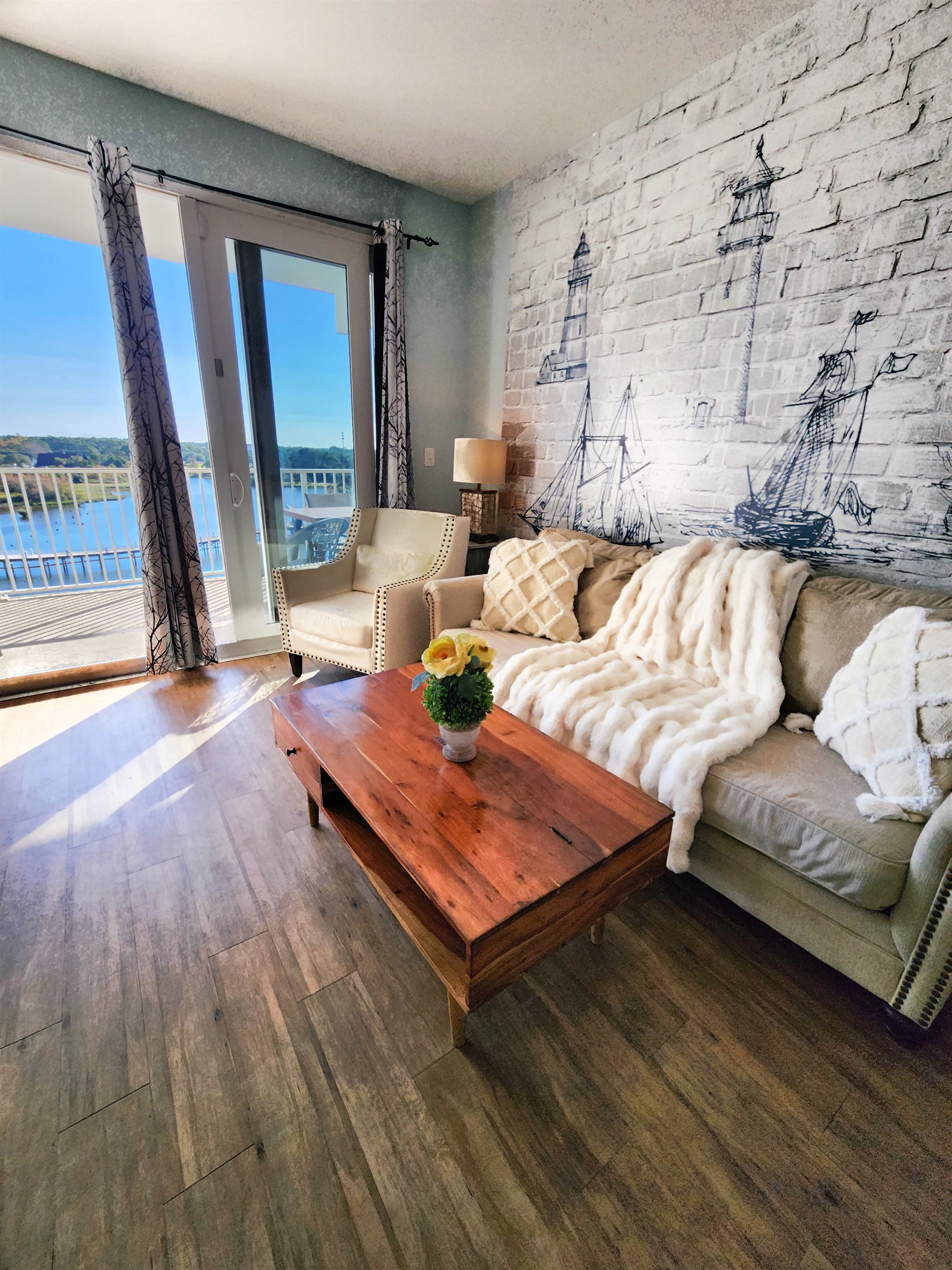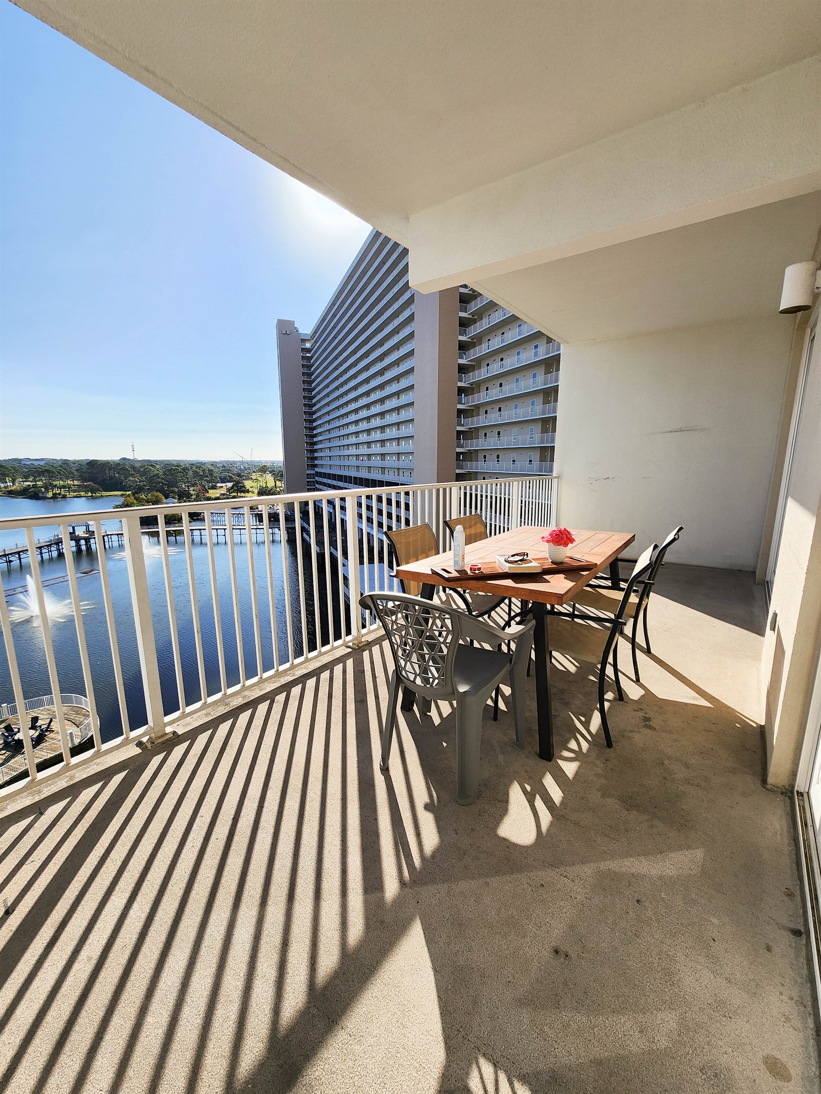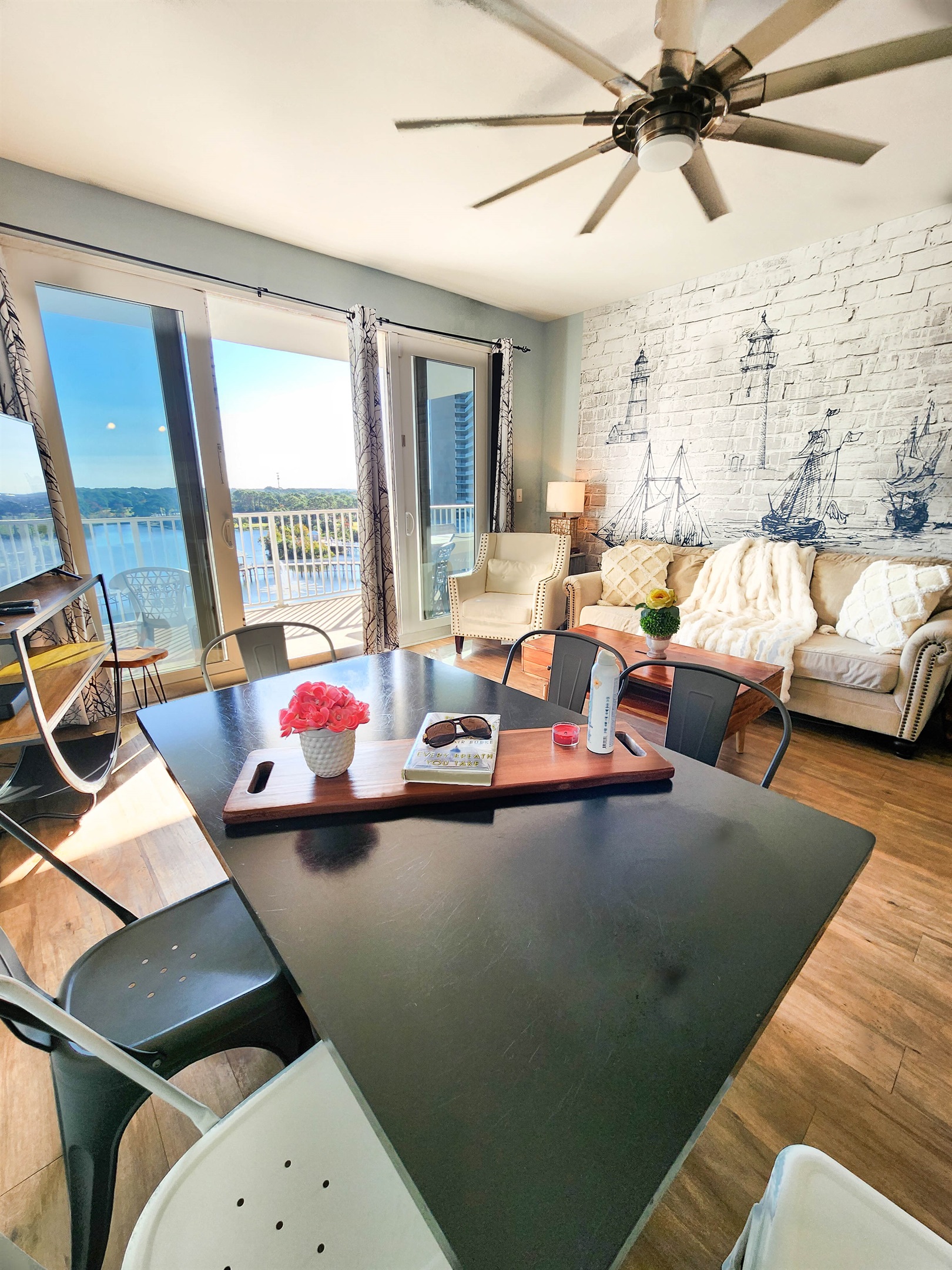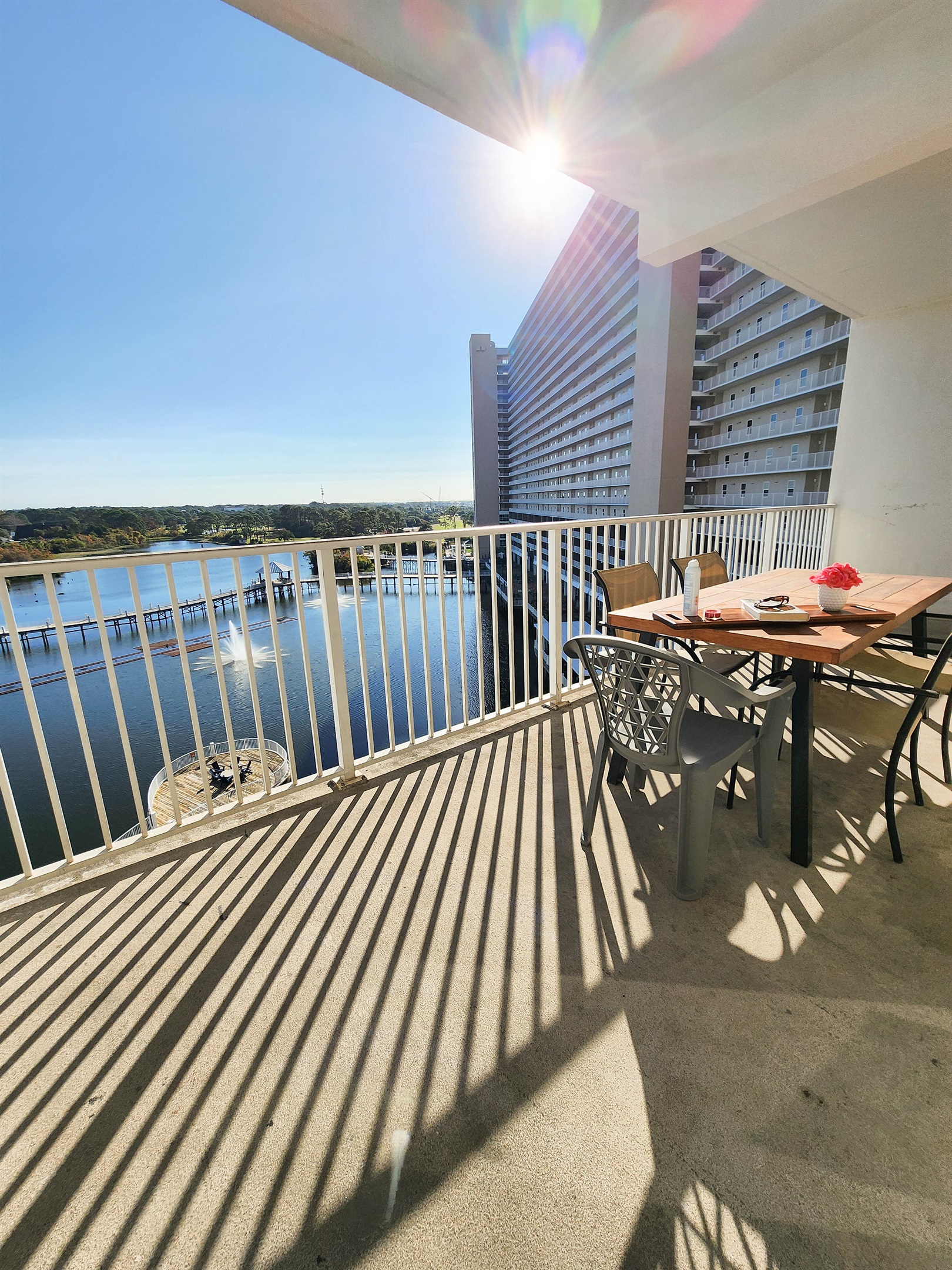 This Uniquely Designed 2 Bedroom Condo will take your breath away! Beautifully decorated with the latest design trends, it creates the ultimate comfort for your Panama City Beach Getaway! The living room is well appointed with comfortable and stylish furniture, including a sleeper sofa, smart TV with Netflix account and upgraded channels like HBO and latest apps.The kitchen is fully equipped with all necessary items to cook a meal, from high end toaster, coffee maker to the latest washer and dryers. The master bedroom is very spacious with a balcony and en suite bathroom, a very comfortable King bed and a TV. The second master also has a flat screen TV with a Netflix account and al the latest apps and upgraded channels, like HBO. The nook area offers the bunk bed, lots of storage and a fun environment for the kiddos to play in and have their own space away from adults. The unit has an extremely large balcony that overlooks the lake and the Vegas style fountain show every night. The condo is located on the 6th floor, so once you park your vehicle on the 6th floor parking level, you walk straight to your unit without needing any elevator. The putting green and kids pools are just 2 floors down.