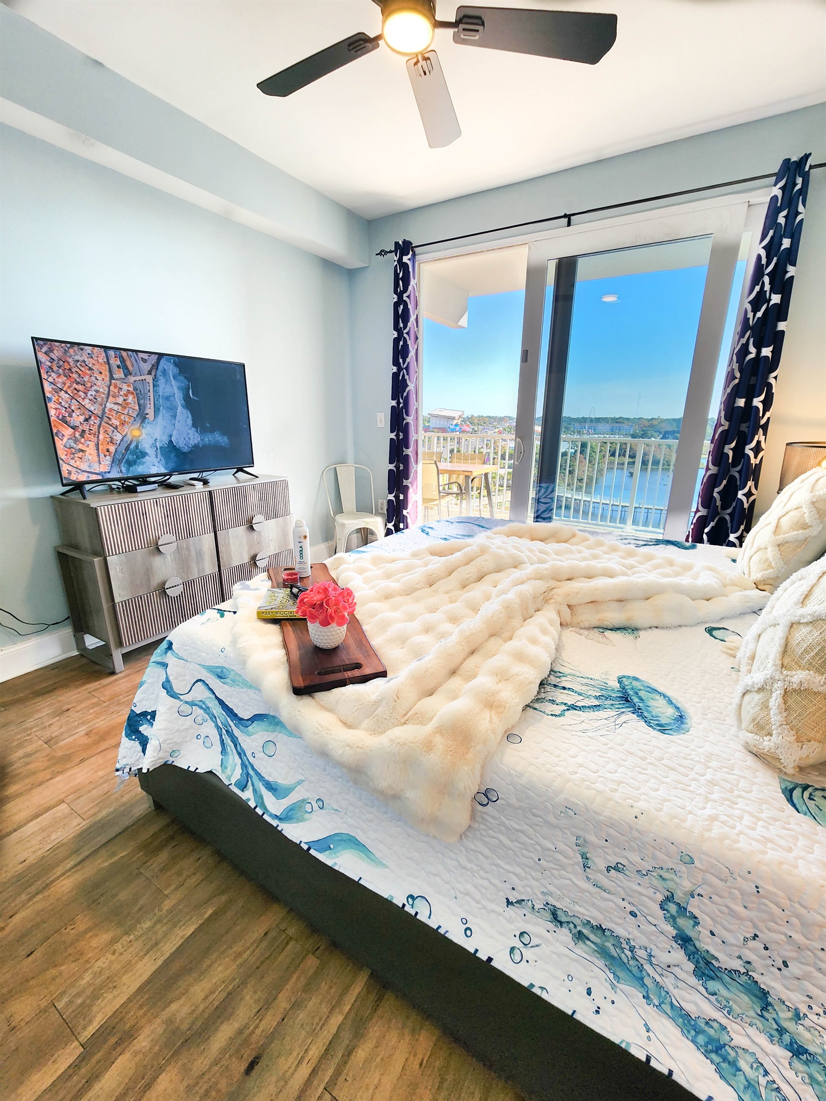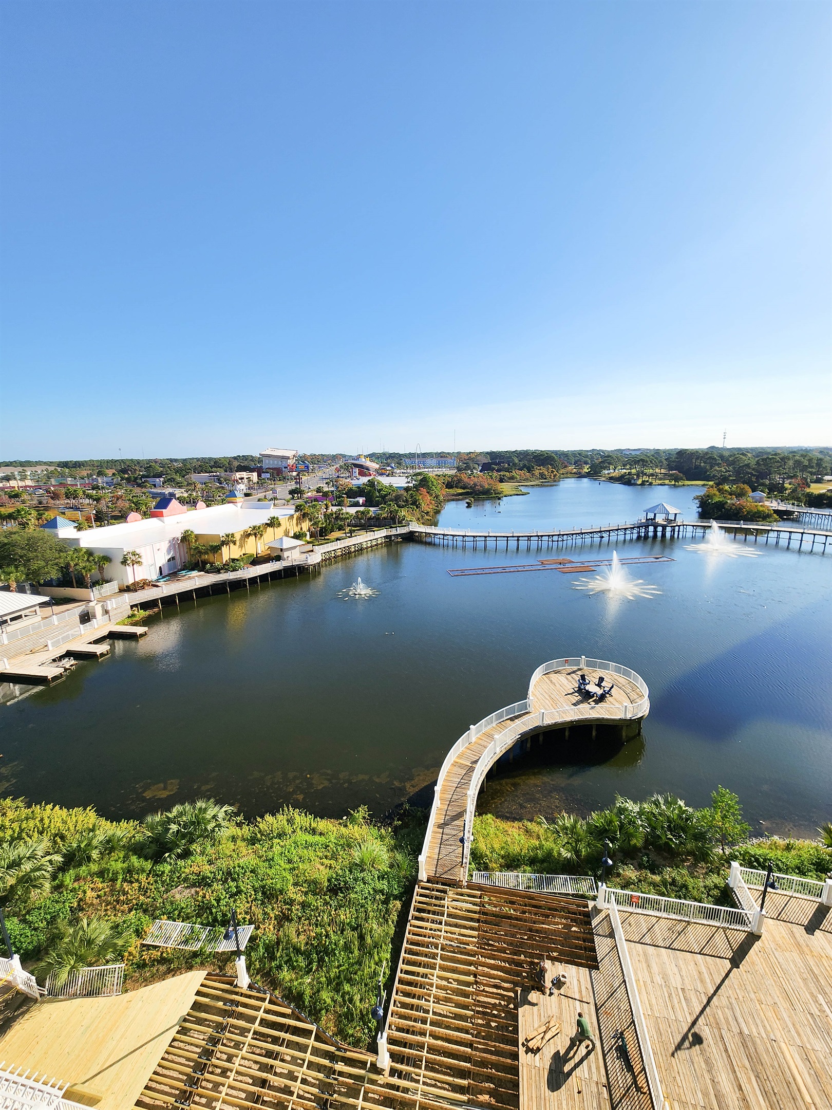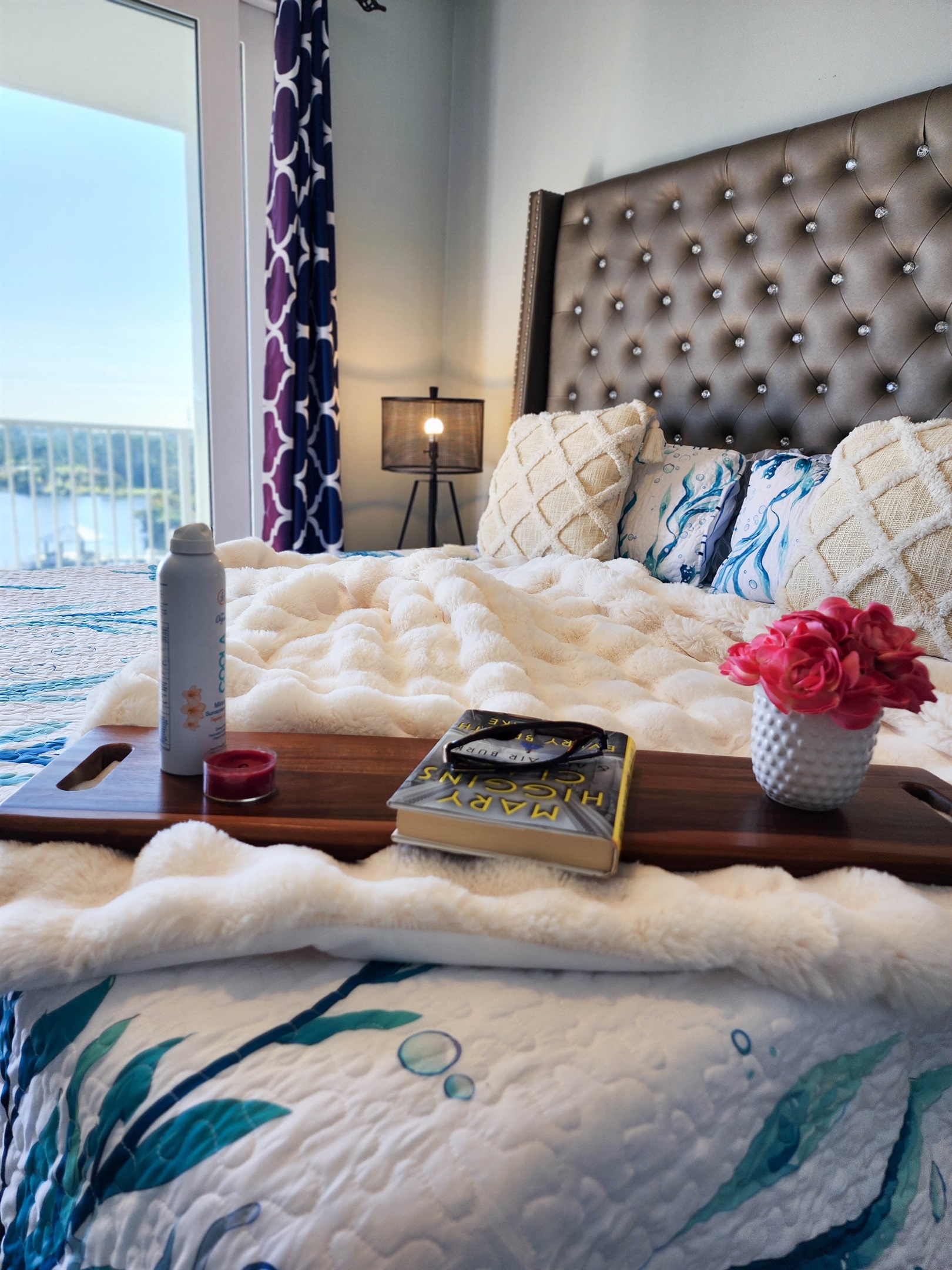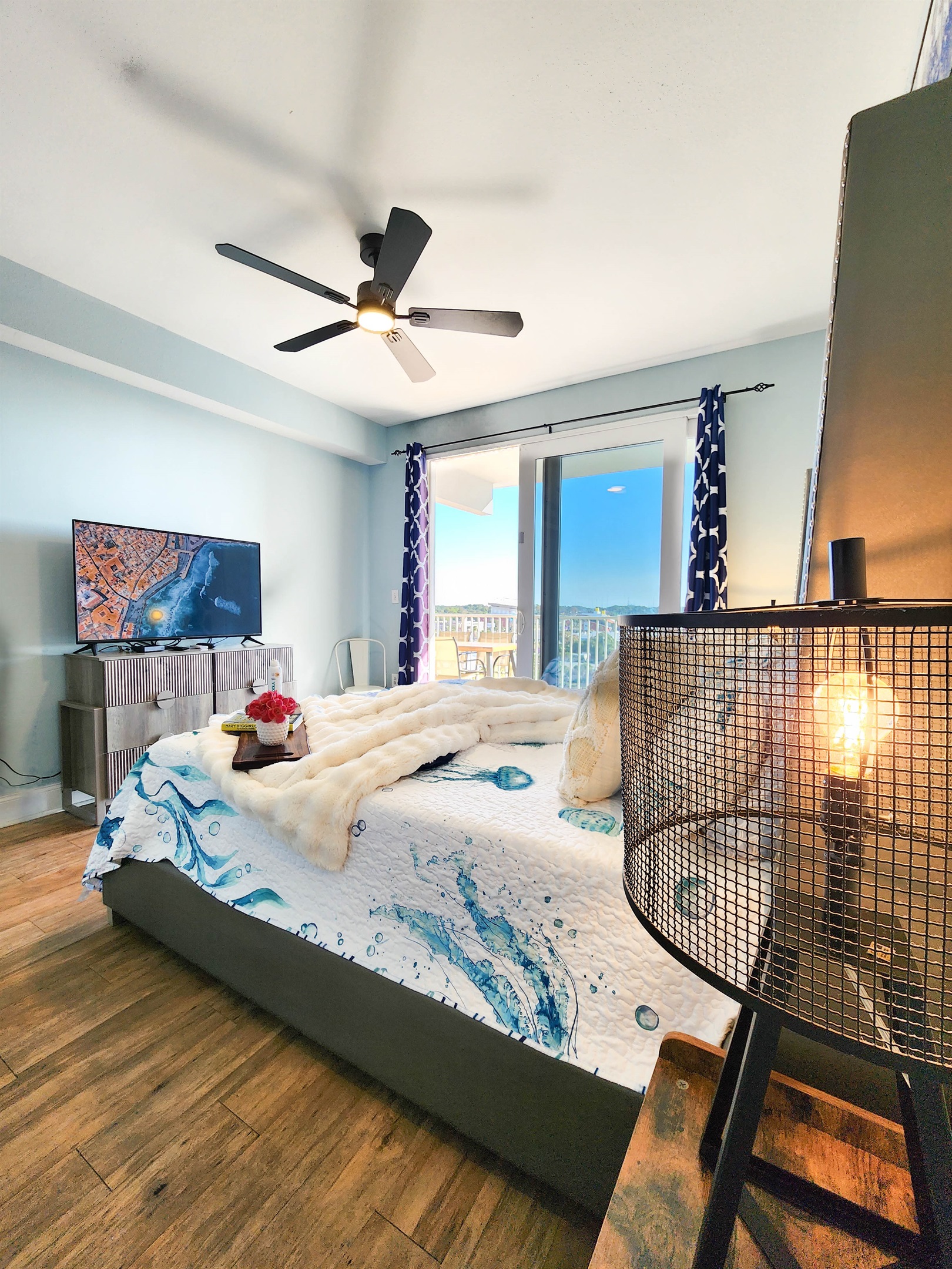 This Uniquely Designed 2 Bedroom Condo will take your breath away! Beautifully decorated with the latest design trends, it creates the ultimate comfort for your Panama City Beach Getaway! The living room is well appointed with comfortable and stylish furniture, including a sleeper sofa, smart TV with Netflix account and upgraded channels like HBO and latest apps.The kitchen is fully equipped with all necessary items to cook a meal, from high end toaster, coffee maker to the latest washer and dryers. The master bedroom is very spacious with a balcony and en suite bathroom, a very comfortable King bed and a TV. The second master also has a flat screen TV with a Netflix account and al the latest apps and upgraded channels, like HBO. The nook area offers the bunk bed, lots of storage and a fun environment for the kiddos to play in and have their own space away from adults. The unit has an extremely large balcony that overlooks the lake and the Vegas style fountain show every night. The condo is located on the 6th floor, so once you park your vehicle on the 6th floor parking level, you walk straight to your unit without needing any elevator. The putting green and kids pools are just 2 floors down.