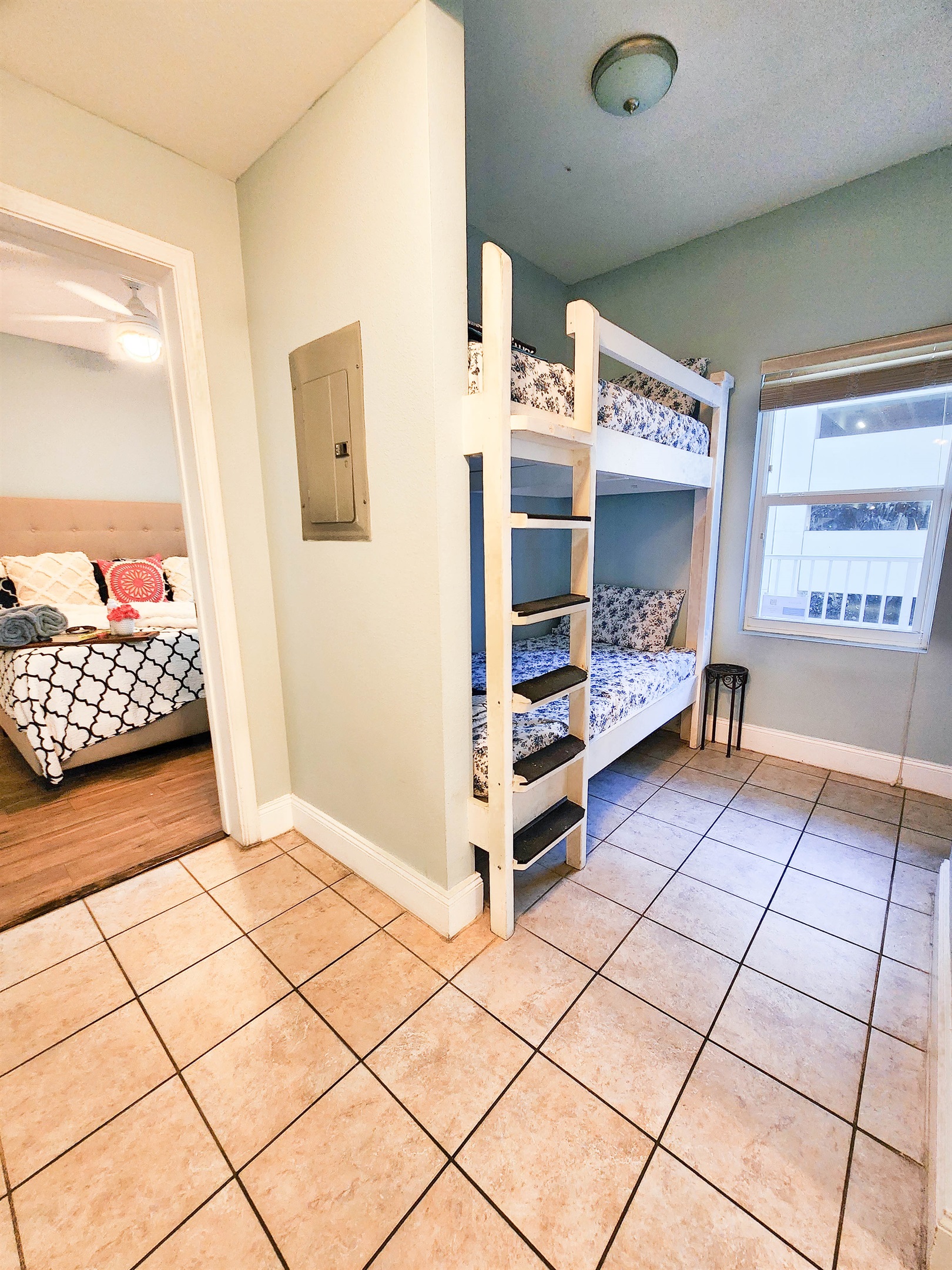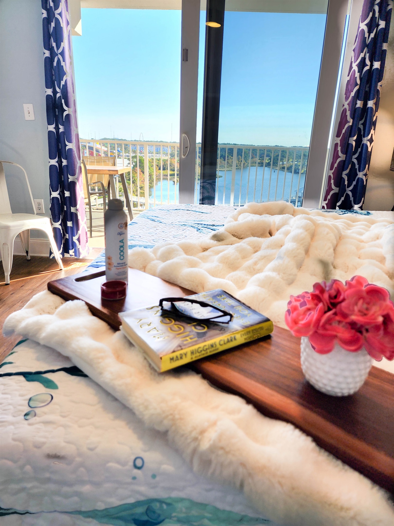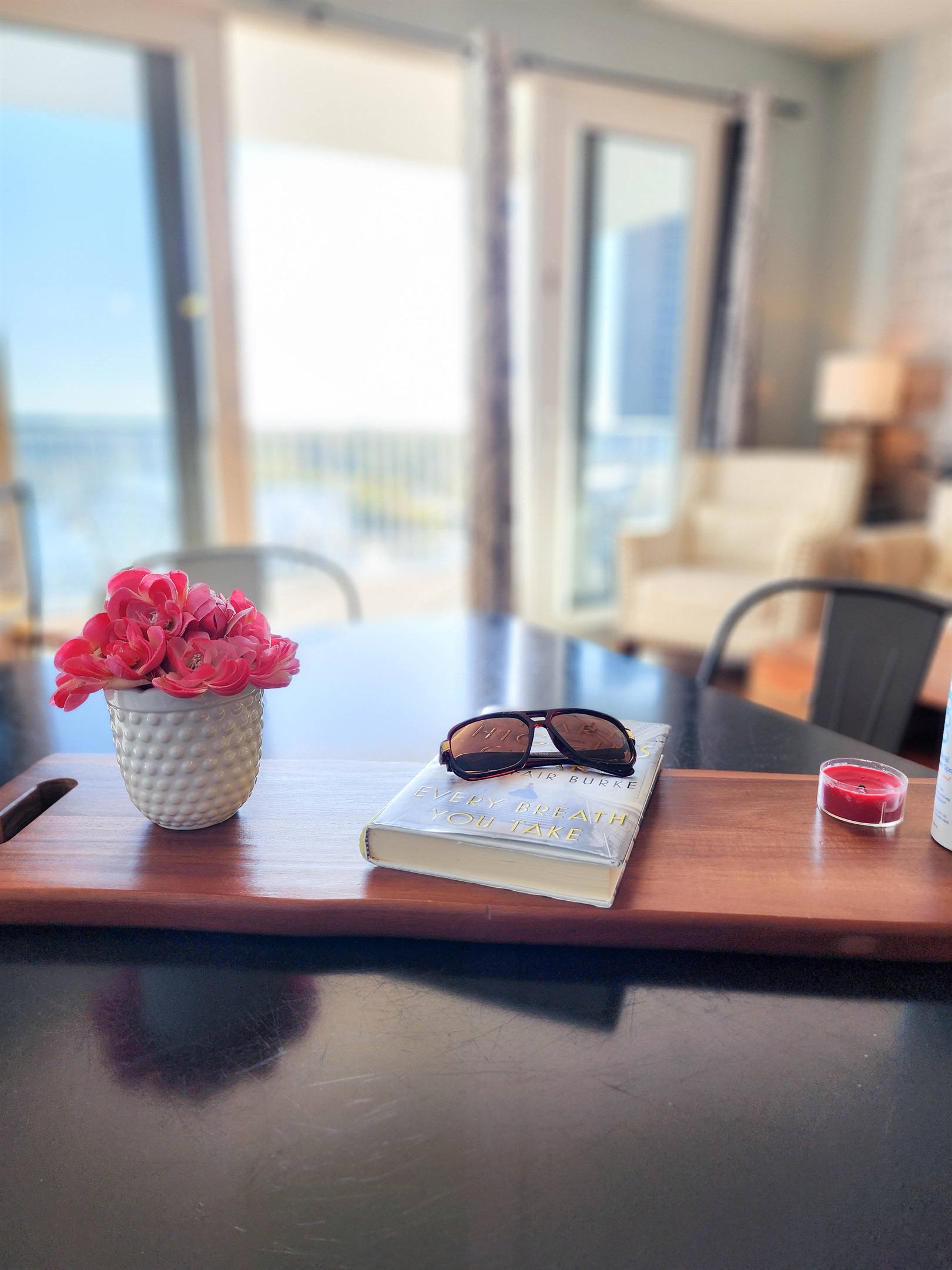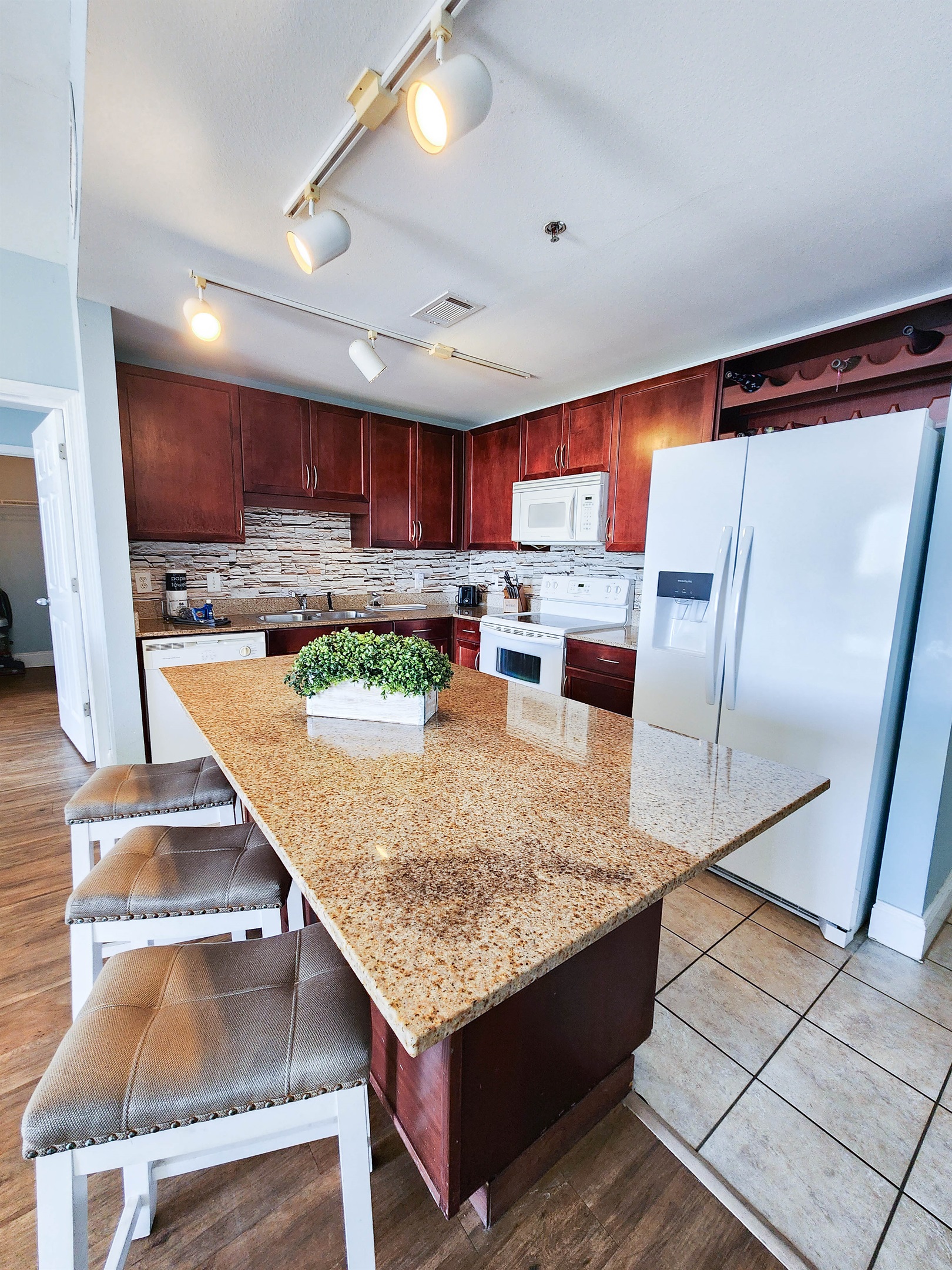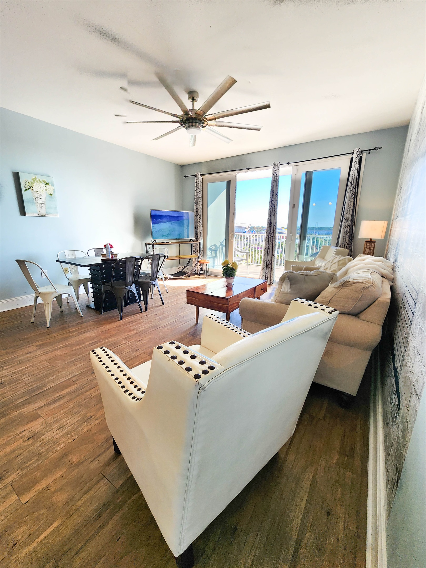 This Uniquely Designed 2 Bedroom Condo will take your breath away! Beautifully decorated with the latest design trends, it creates the ultimate comfort for your Panama City Beach Getaway! The living room is well appointed with comfortable and stylish furniture, including a sleeper sofa, smart TV with Netflix account and upgraded channels like HBO and latest apps.The kitchen is fully equipped with all necessary items to cook a meal, from high end toaster, coffee maker to the latest washer and dryers. The master bedroom is very spacious with a balcony and en suite bathroom, a very comfortable King bed and a TV. The second master also has a flat screen TV with a Netflix account and al the latest apps and upgraded channels, like HBO. The nook area offers the bunk bed, lots of storage and a fun environment for the kiddos to play in and have their own space away from adults. The unit has an extremely large balcony that overlooks the lake and the Vegas style fountain show every night. The condo is located on the 6th floor, so once you park your vehicle on the 6th floor parking level, you walk straight to your unit without needing any elevator. The putting green and kids pools are just 2 floors down.