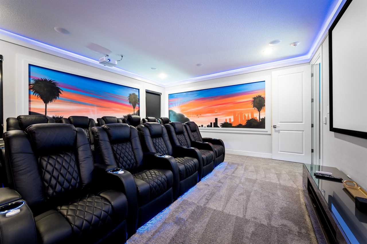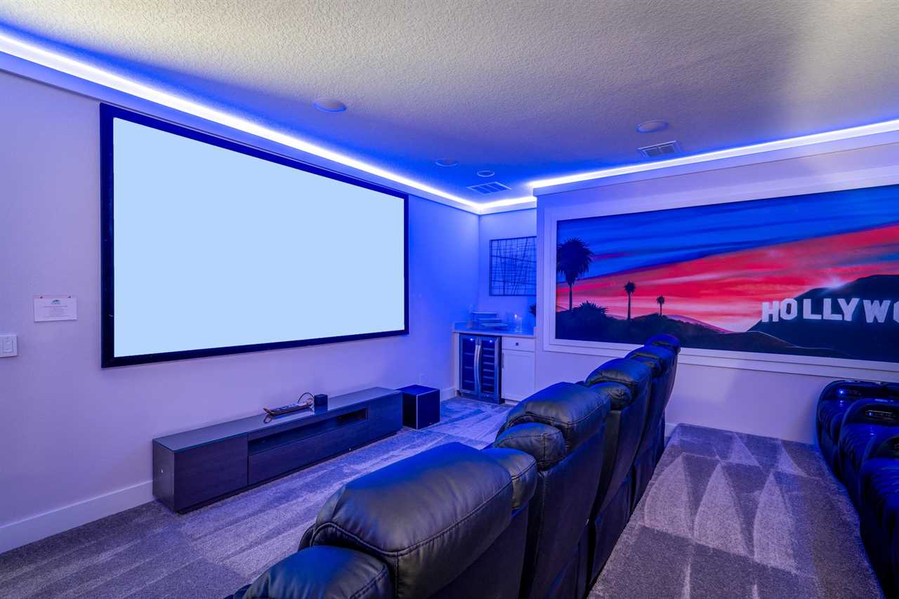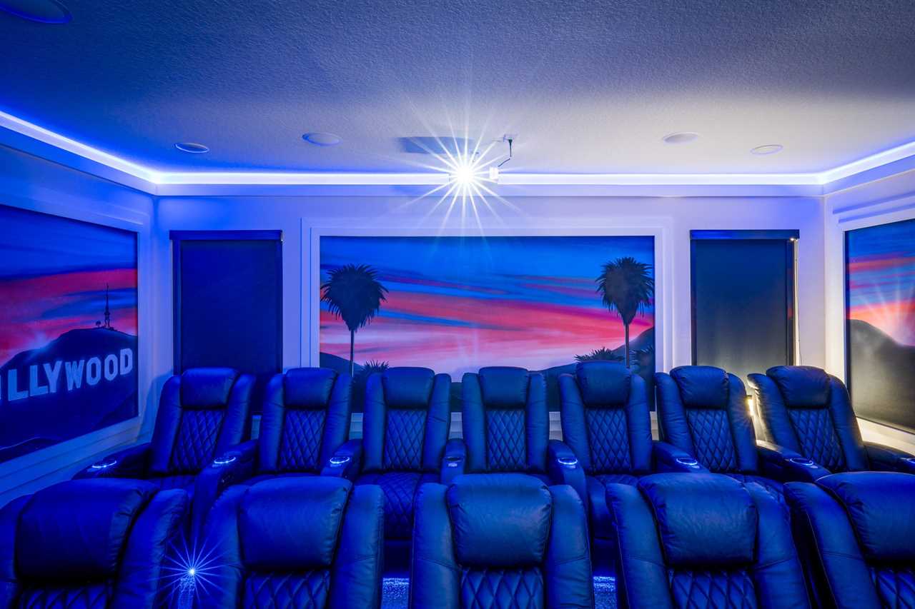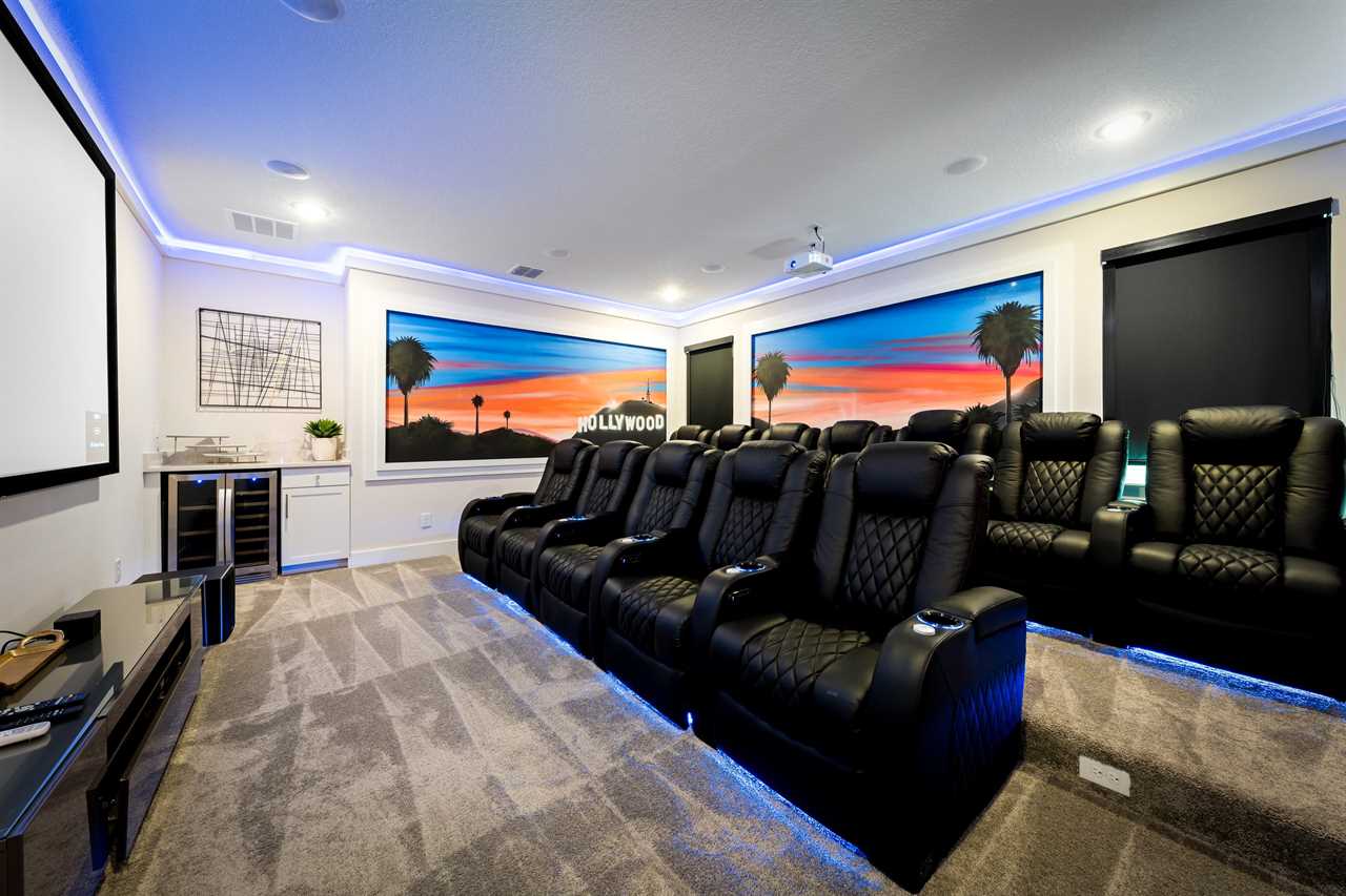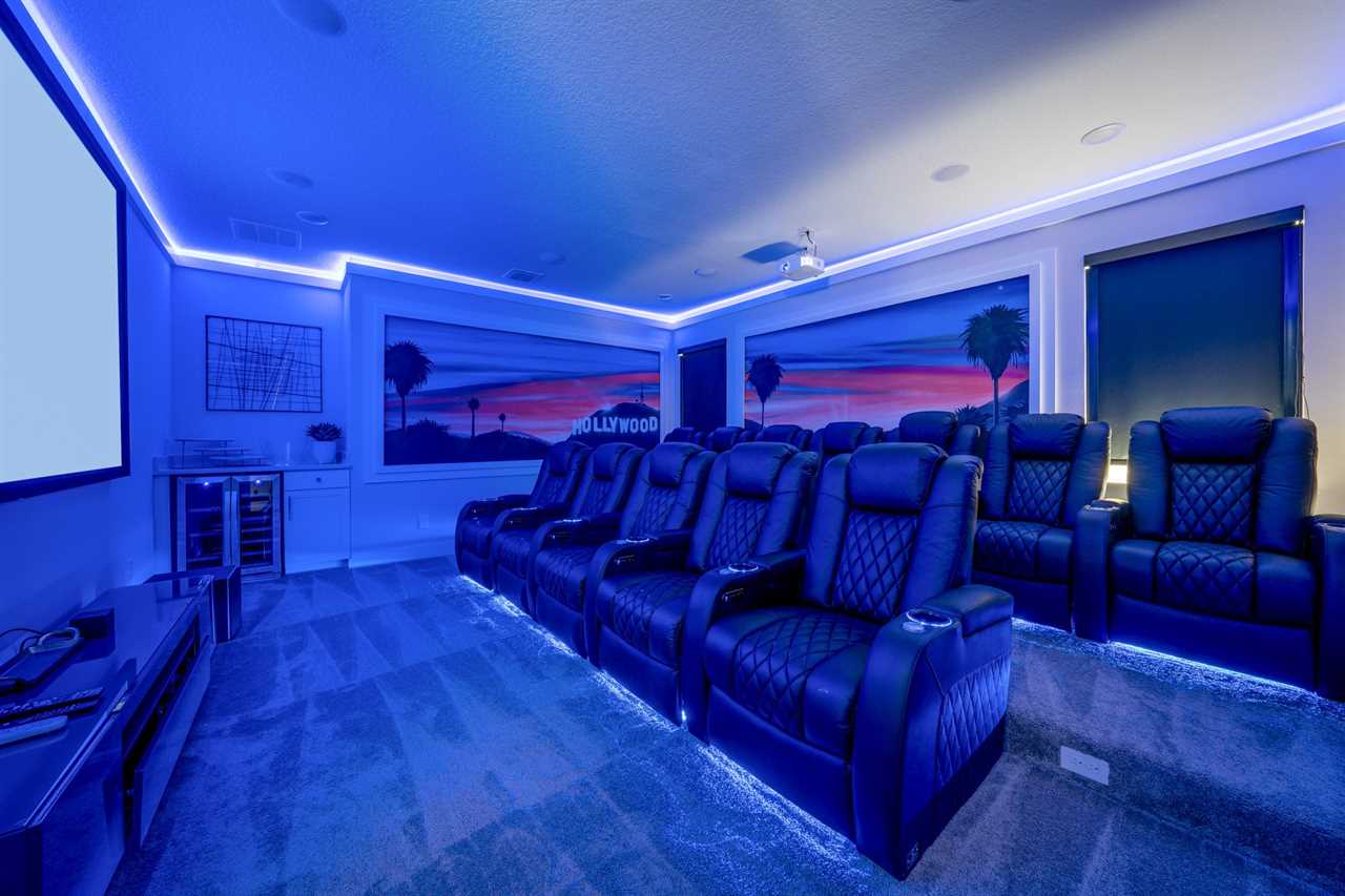For movie lovers, the Hollywood-themed theater seats 12 in plush comfort and includes a wine fridge, a 144” screen, and a dedicated gaming station.