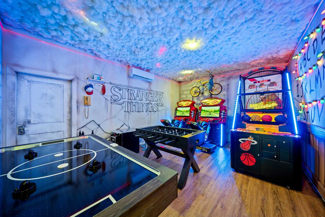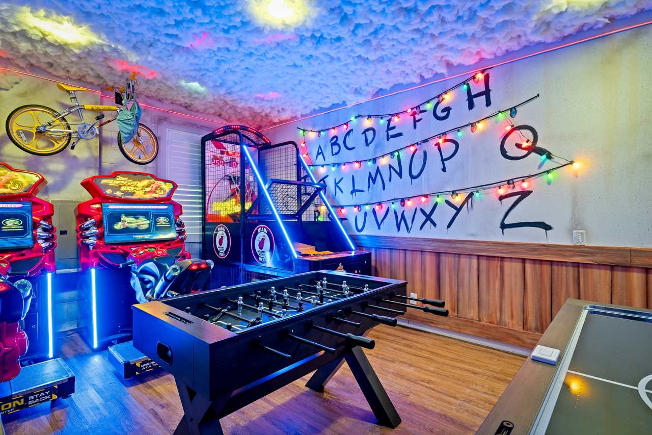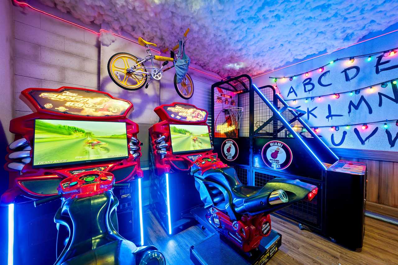 Entertainment abounds in the themed games room, featuring two side-by-side Fast and Furious racing simulators, a commercial basketball arcade, air hockey, foosball, and a tabletop arcade game.
