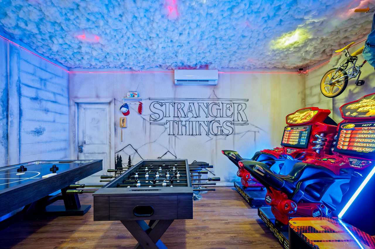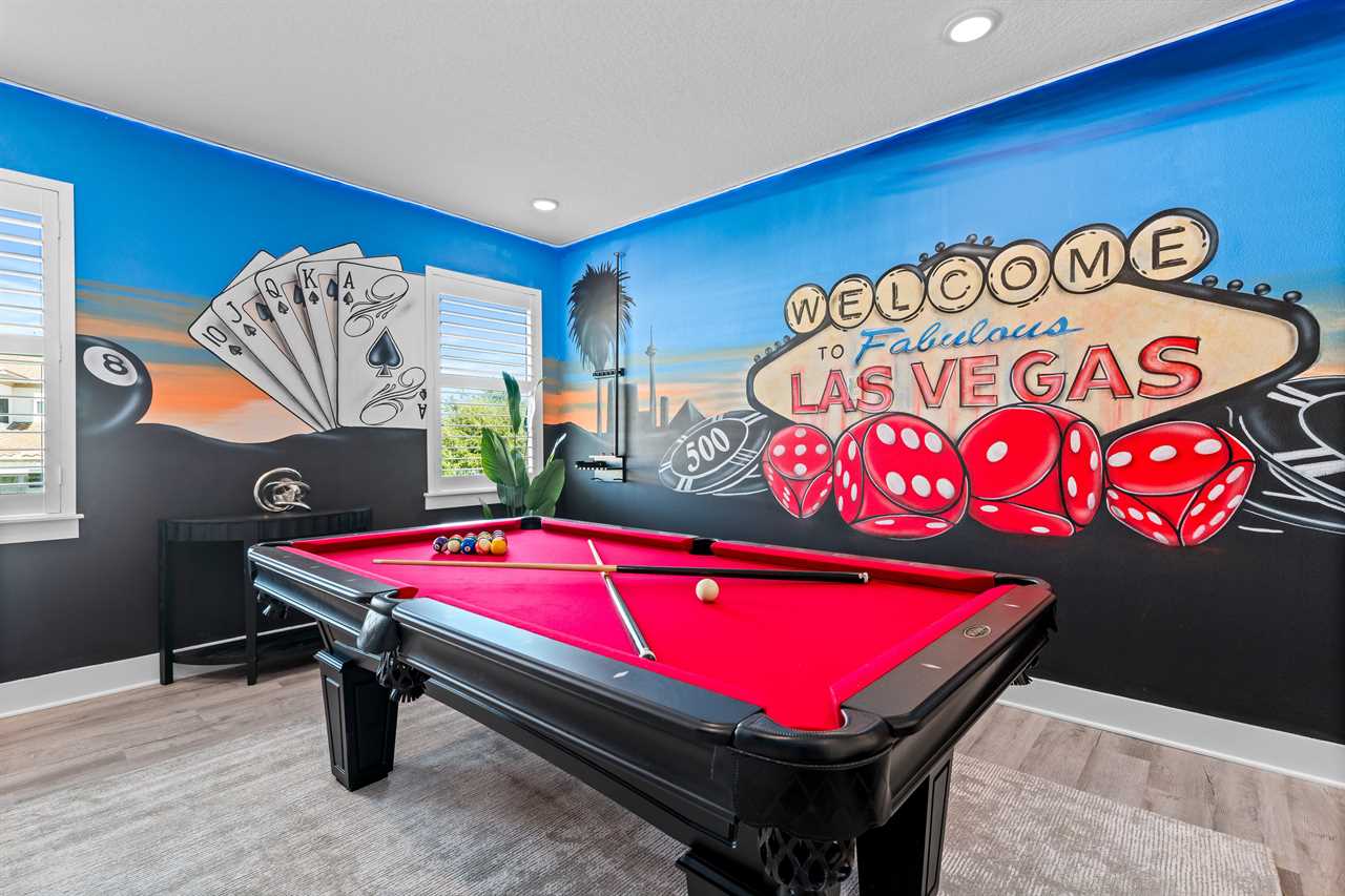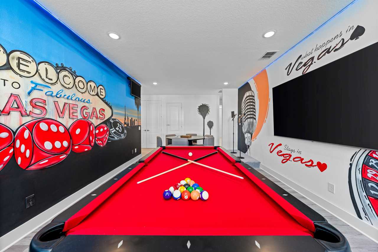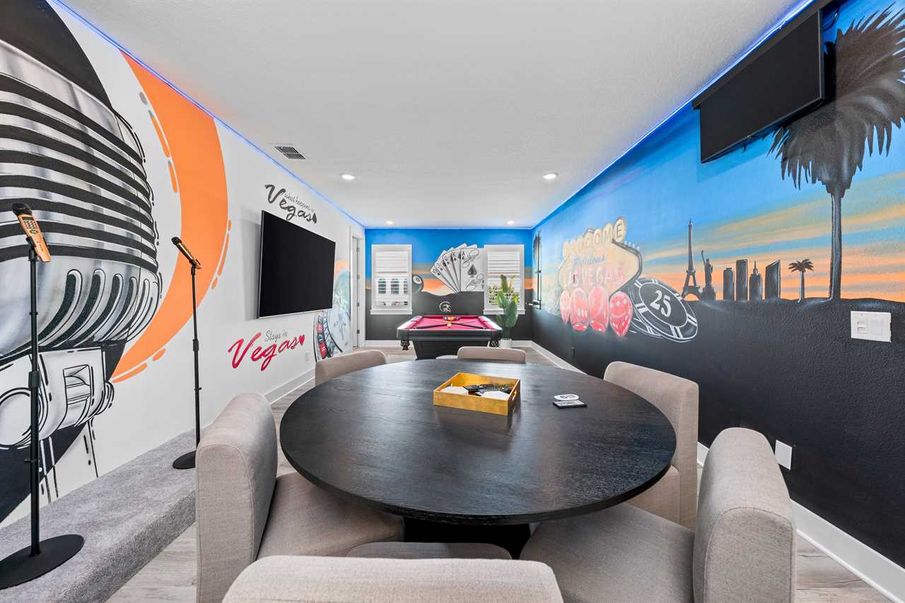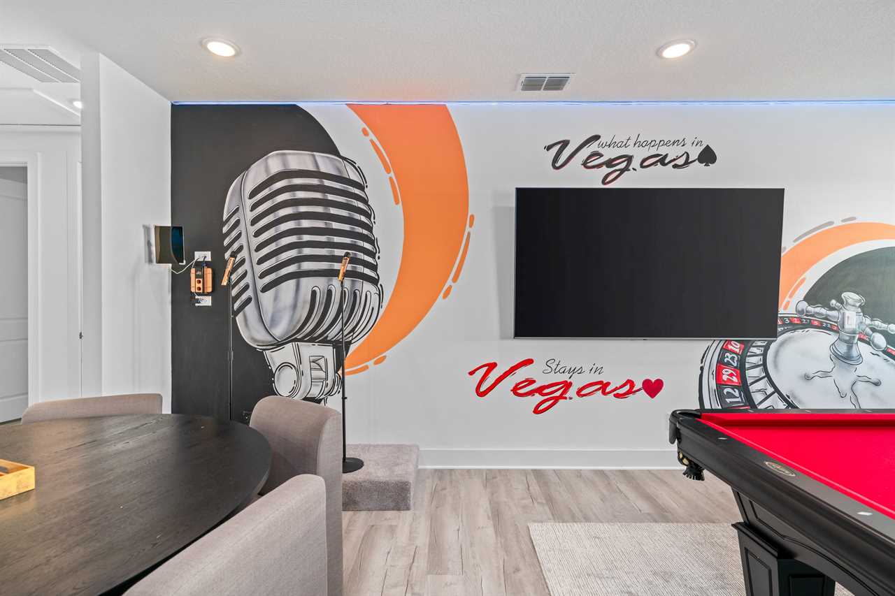 Upstairs, the Las Vegas-themed loft provides even more fun with a pool table, game table, karaoke setup, and another large wall-mounted smart TV.