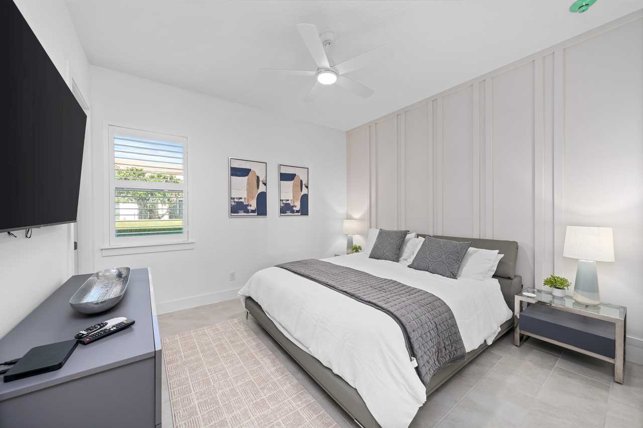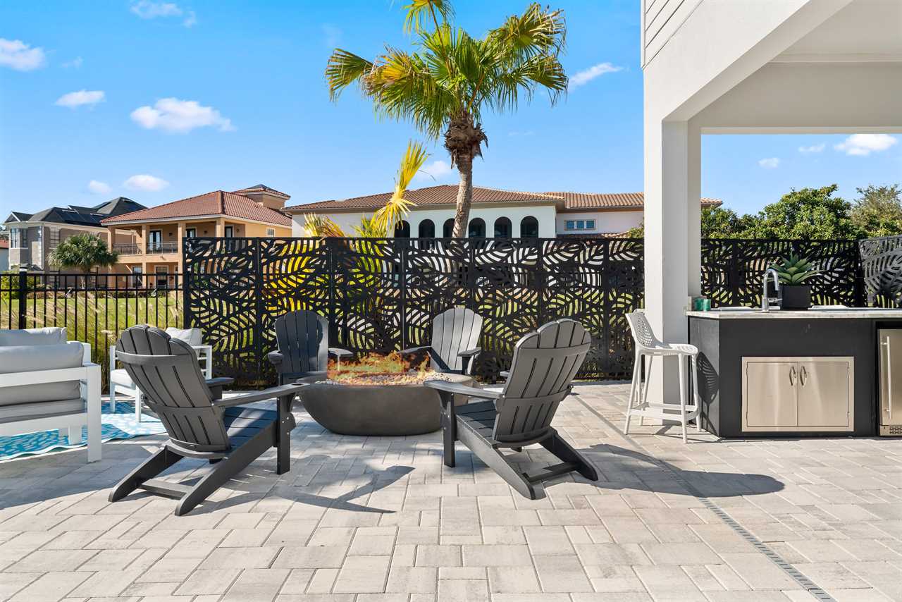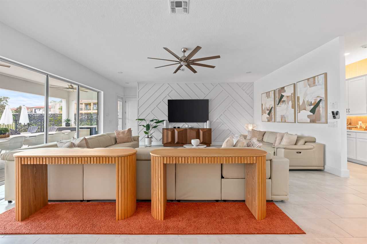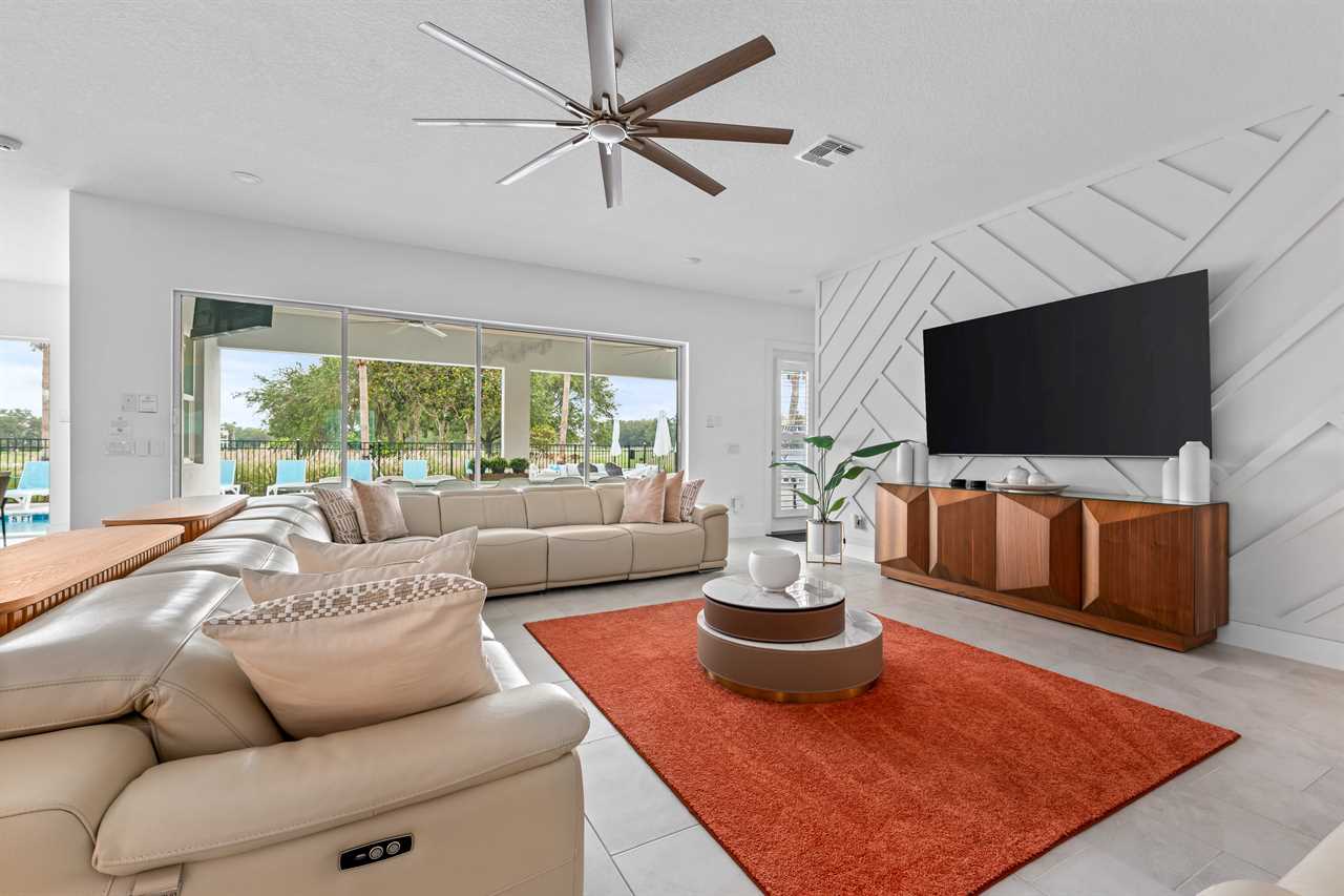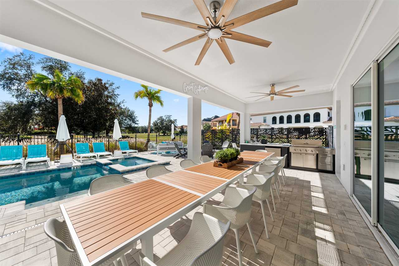 The outdoor area is equally impressive. The private pool with a spillover spa is complemented by two luxurious cabana beds and 10 sun loungers. The patio features a built-in gas grill with a fridge, outdoor dining for 14, two ceiling fans for added comfort, and a wall-mounted outdoor TV. Perimeter LED lights create a magical atmosphere, while the outdoor seating area offers stunning views of the golf course.