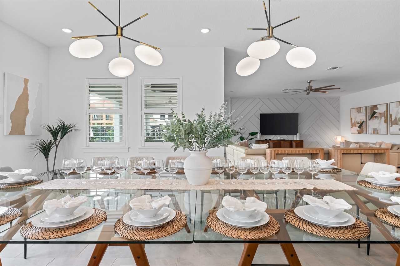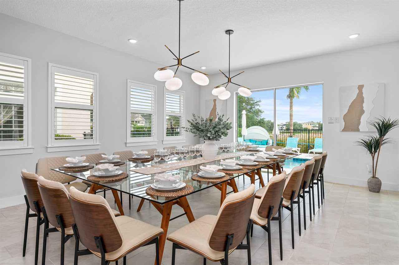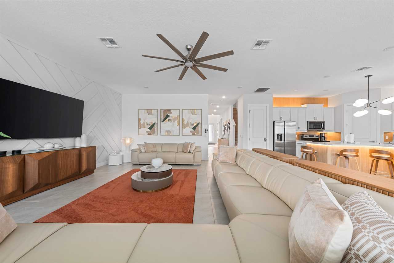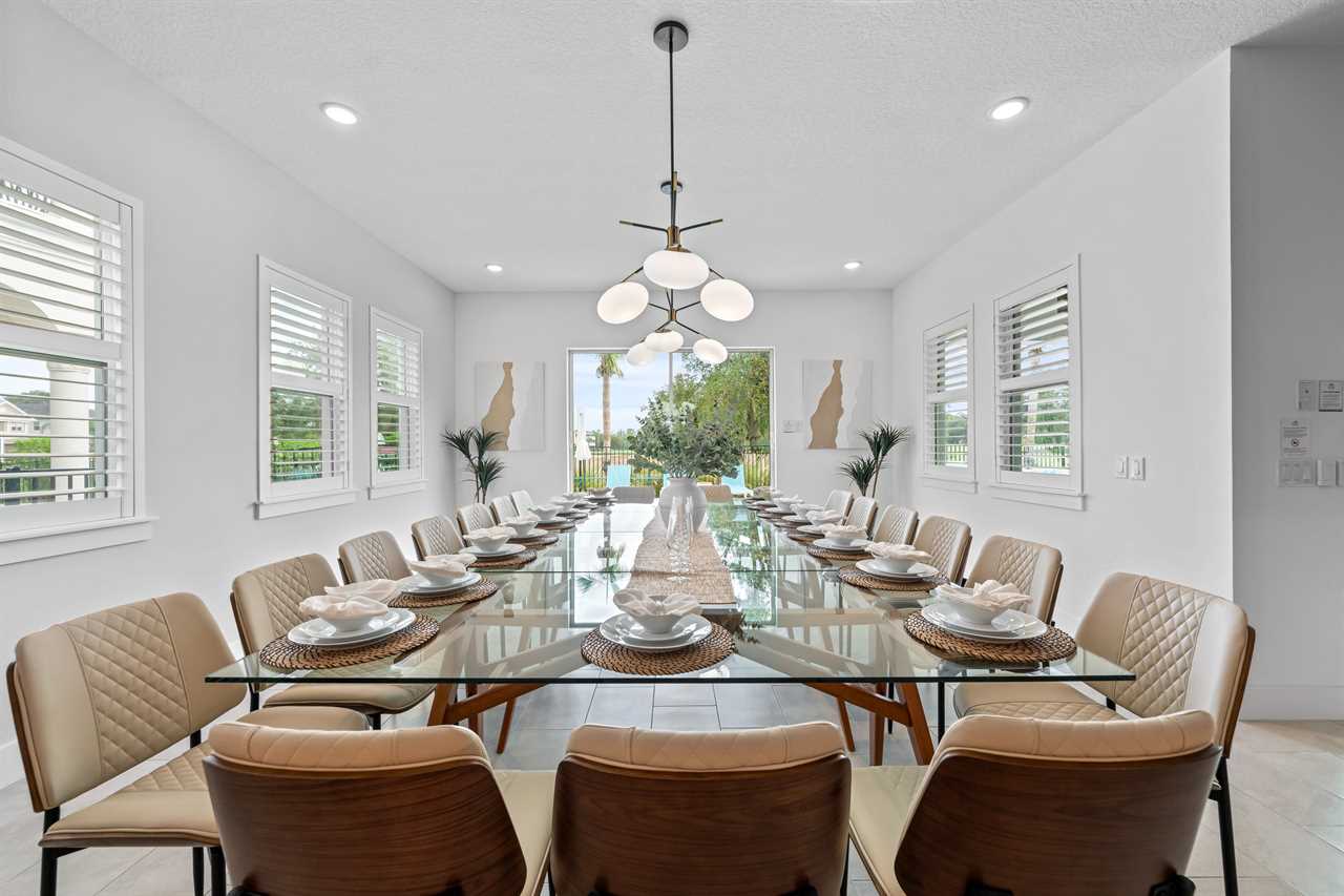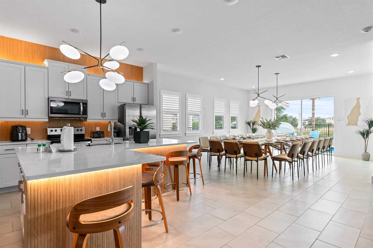 The expansive dining area features a grand table that seats 18, perfect for family gatherings or group dinners. Adjacent to the dining area, the open living space includes a large sectional and sofa facing a large wall-mounted smart TV, creating a comfortable space for relaxation. The kitchen is equipped with bar seating for six, offering additional casual dining options.