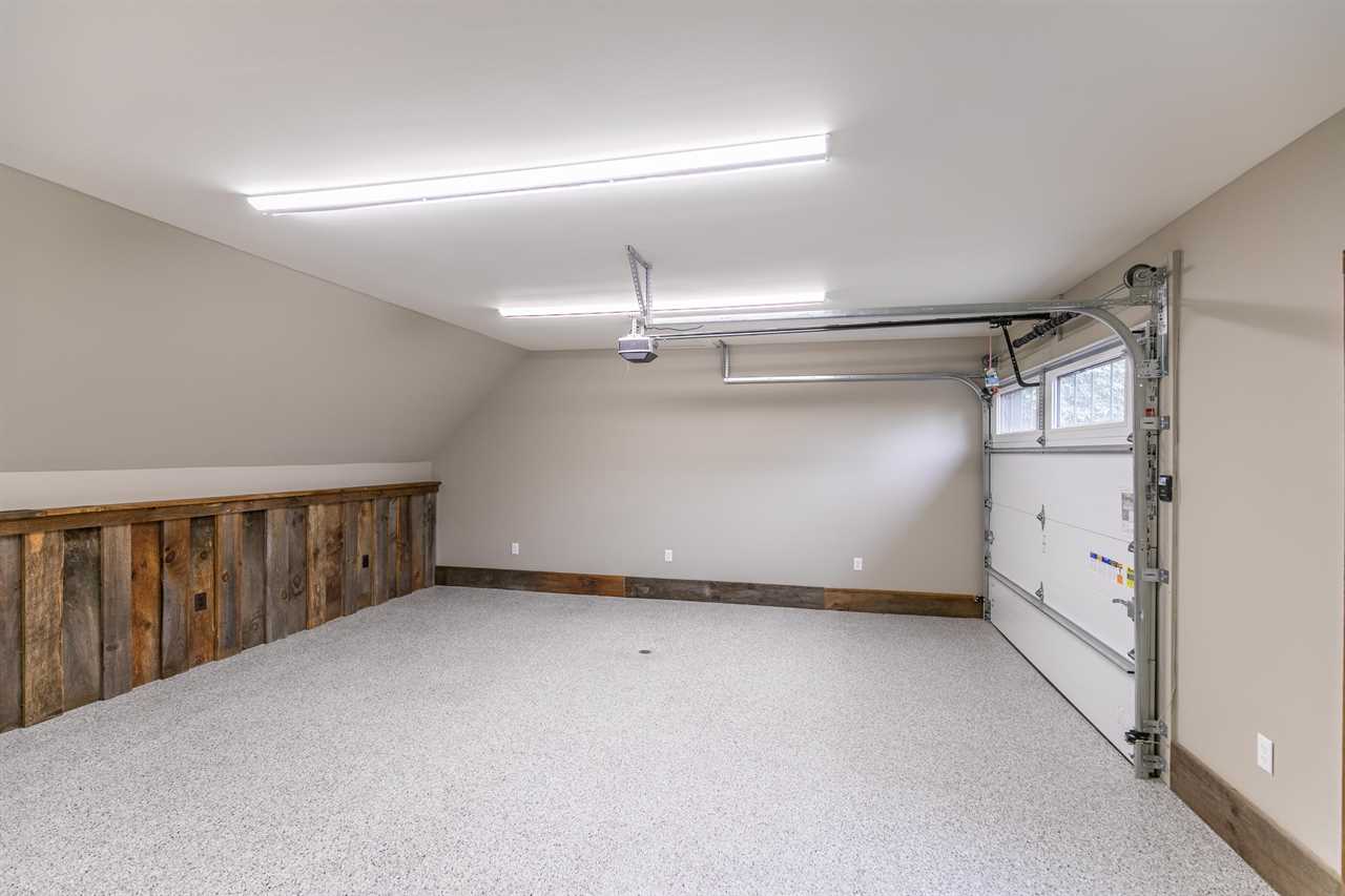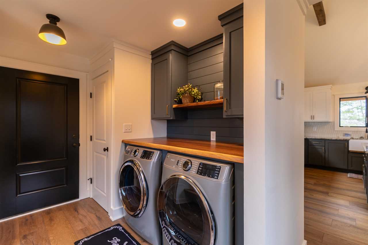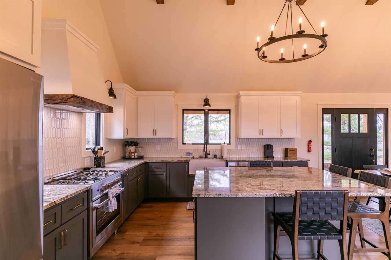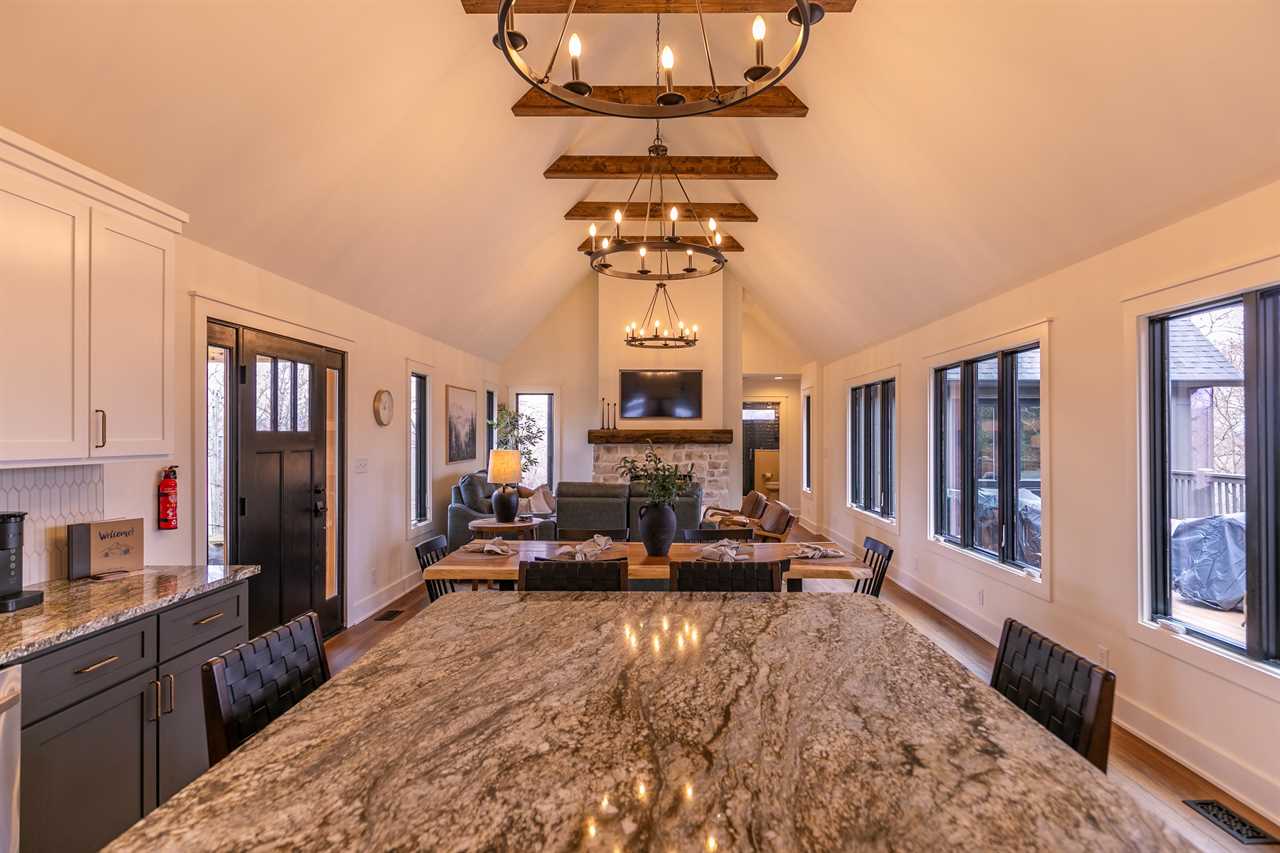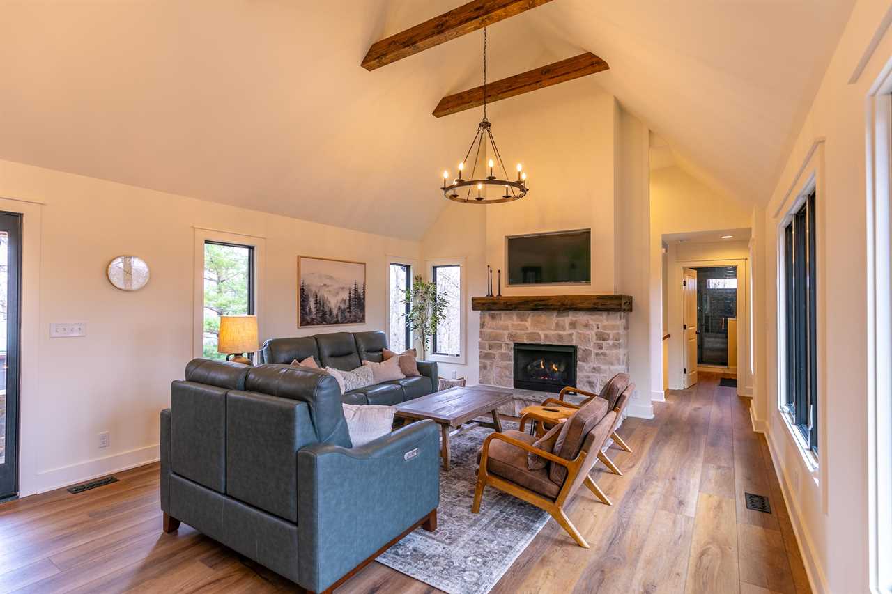 The main level has an open and airy great room with exposed beams, gas fireplace, leather furniture, and TV over the mantle. At the end of the great room is a chef's dream kitchen with yards of granite counters, an eat-in island with 4 bar chairs, stainless appliances including a gas range, two-toned custom cabinets, and a dining table with room for 6. Off the great room is a laundry nook as well.