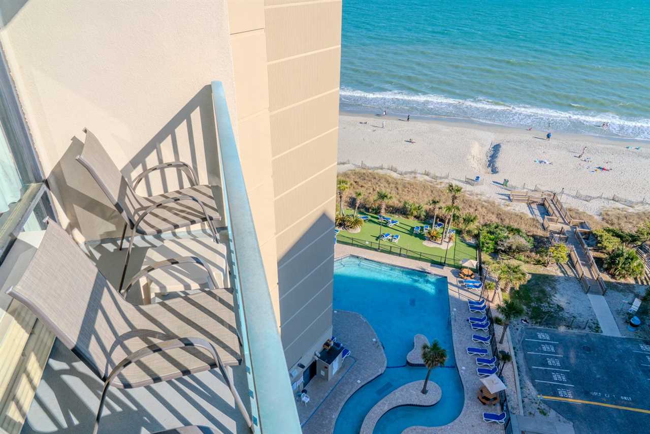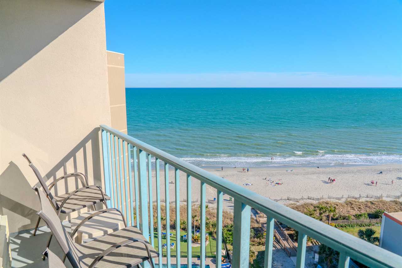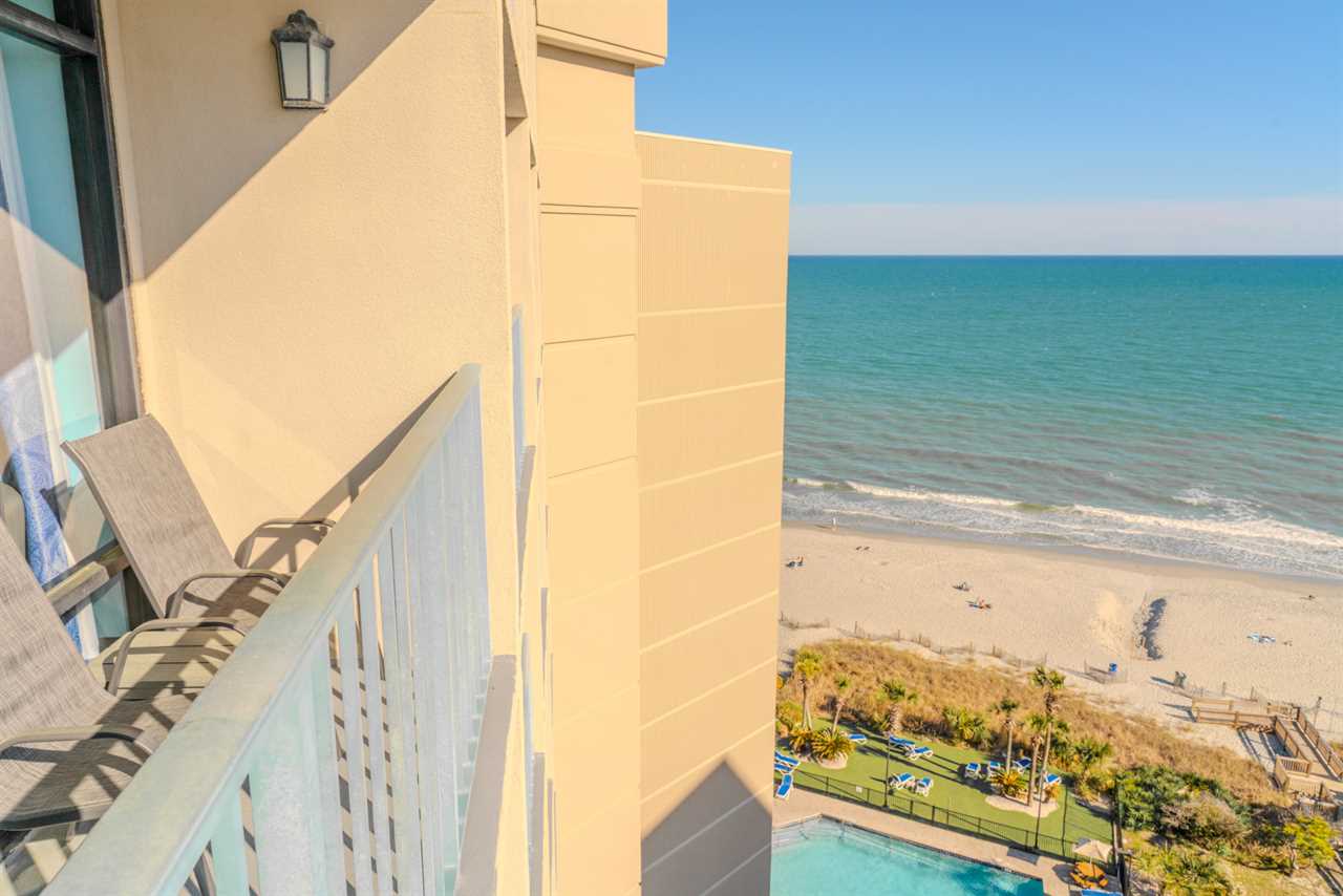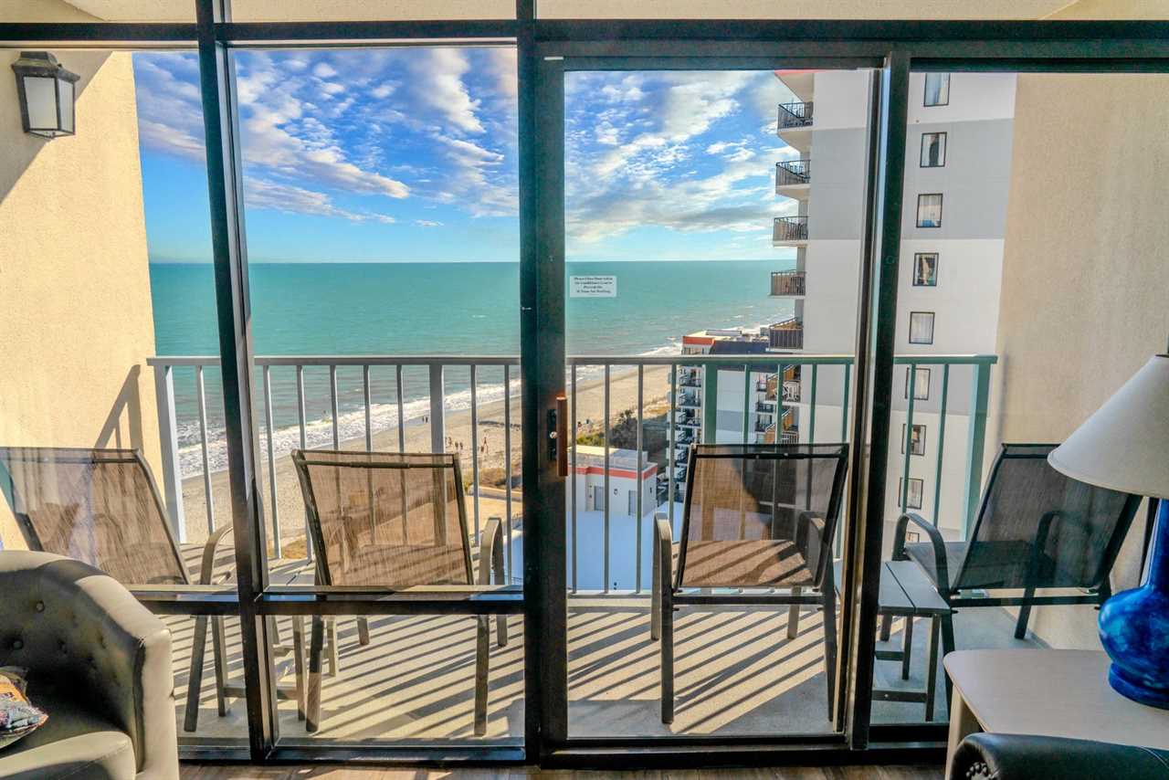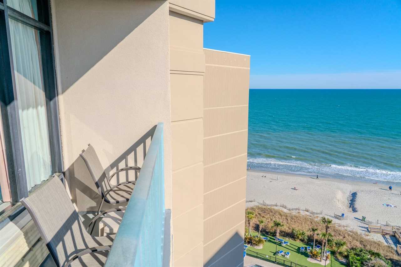 Both units feature private balconies, offering breathtaking views of the Atlantic Ocean and glimpses of Myrtle Beach. Whether you're sipping morning coffee or unwinding after a day of adventure, these balconies provide the perfect spot to soak in the beauty of the coastline.
