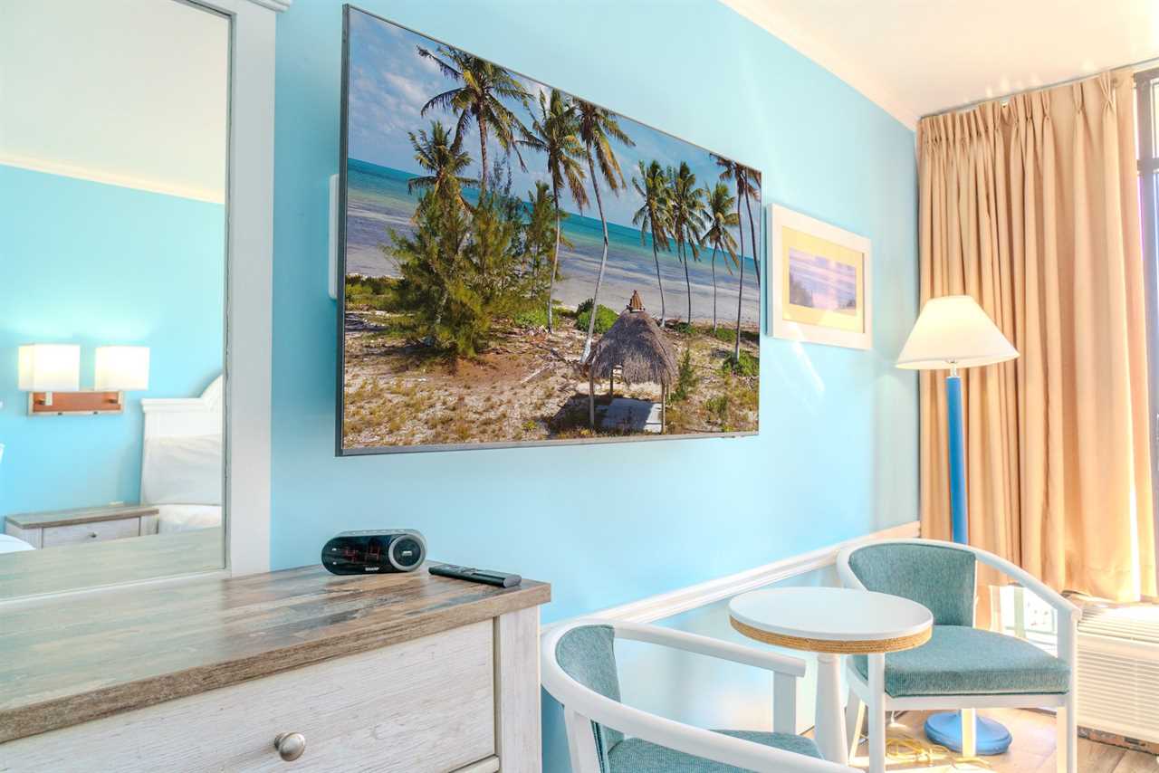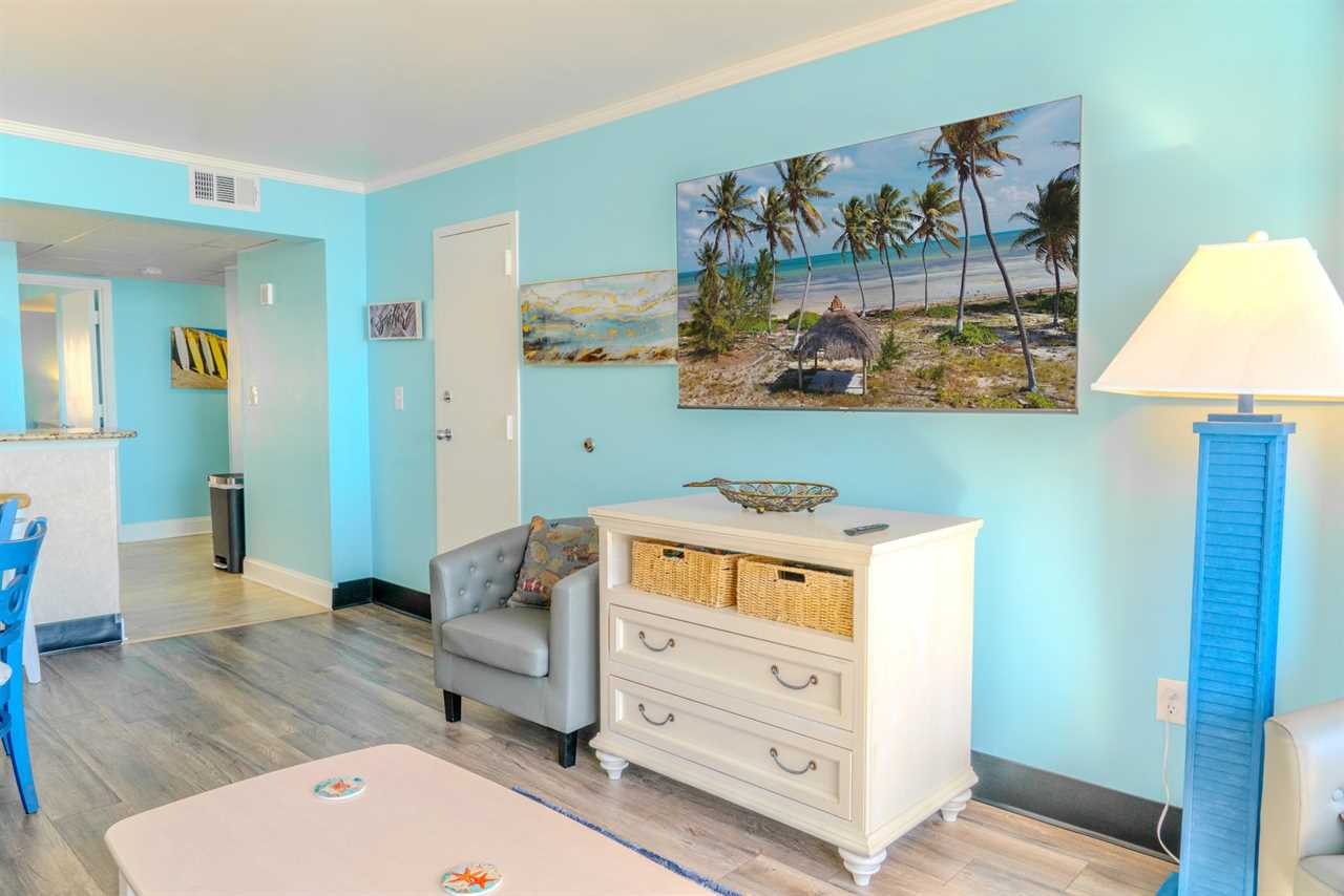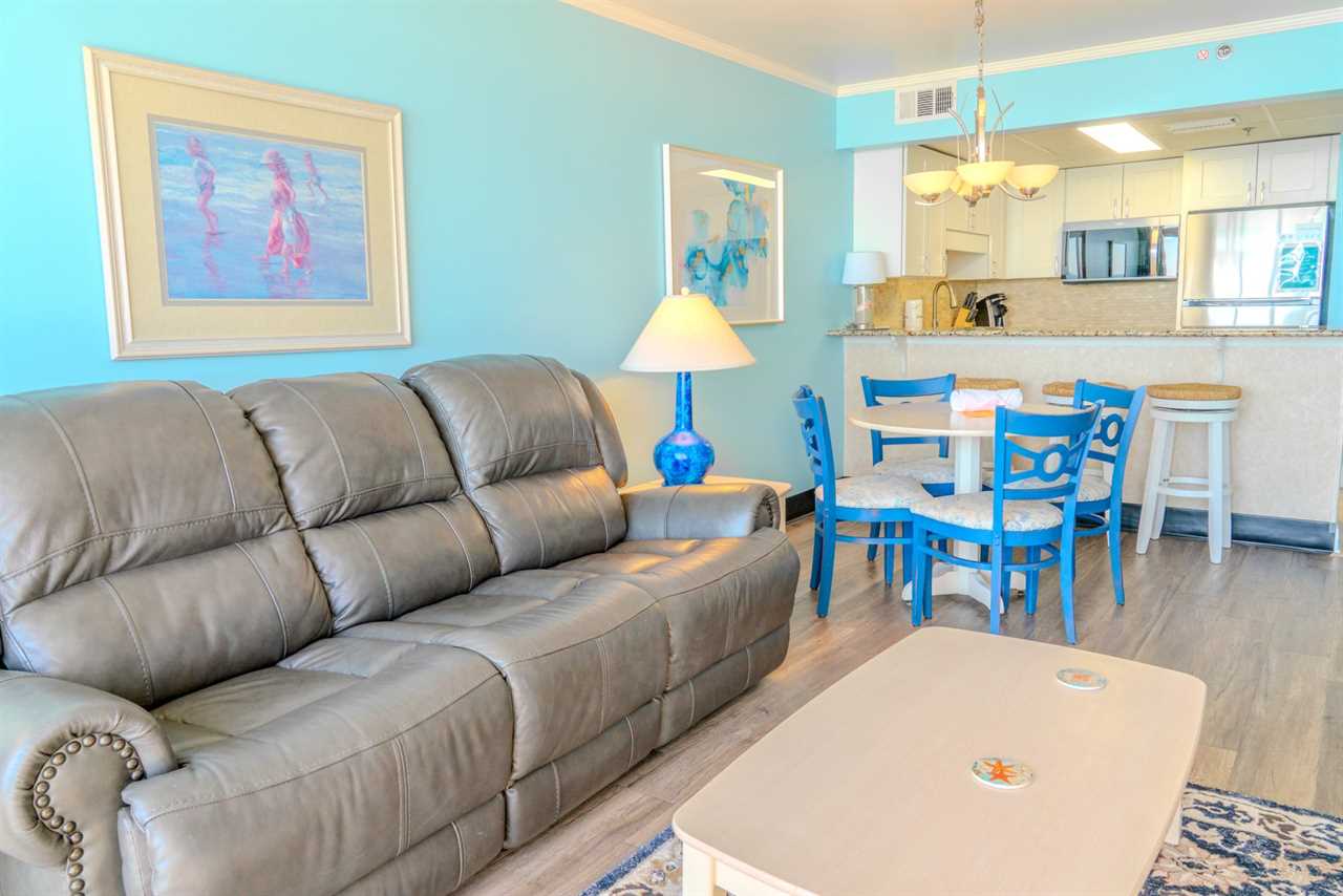Through the adjoining door in the living/sleeping area of 1245, guests can seamlessly access 1246. Step into this spacious and welcoming unit, starting with its open living room area, perfect for gathering together. Relax on the large reclining sofa or the two accent chairs while enjoying your favorite shows on the 65in wall-mounted flat-screen smart TV.