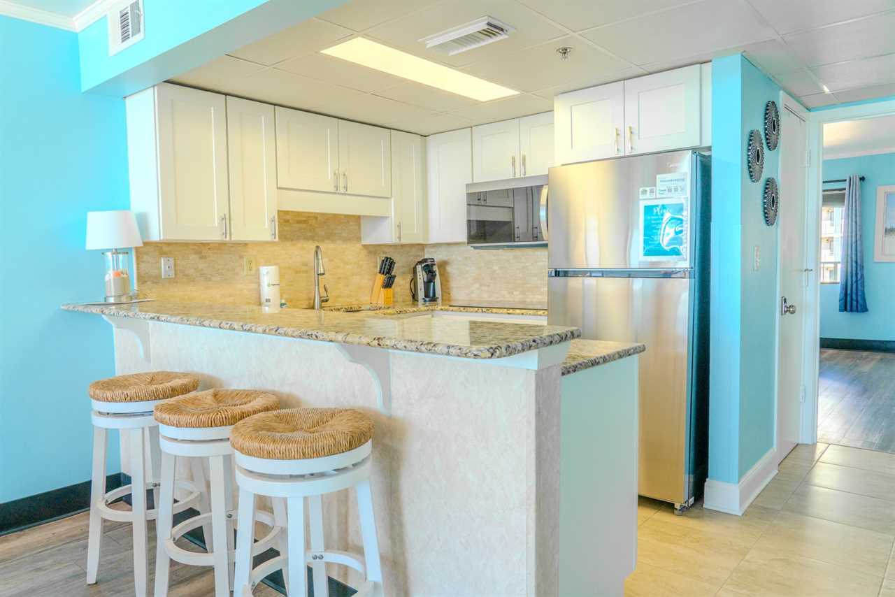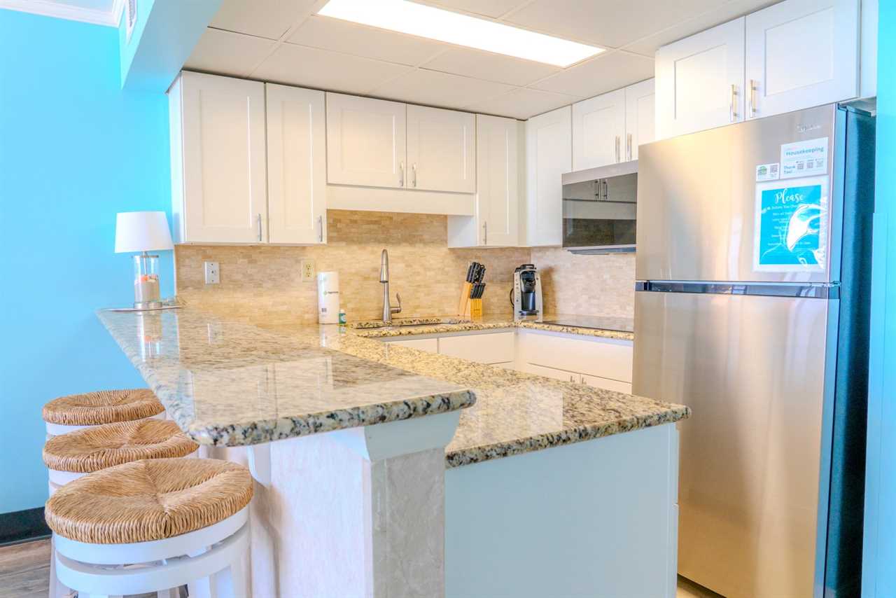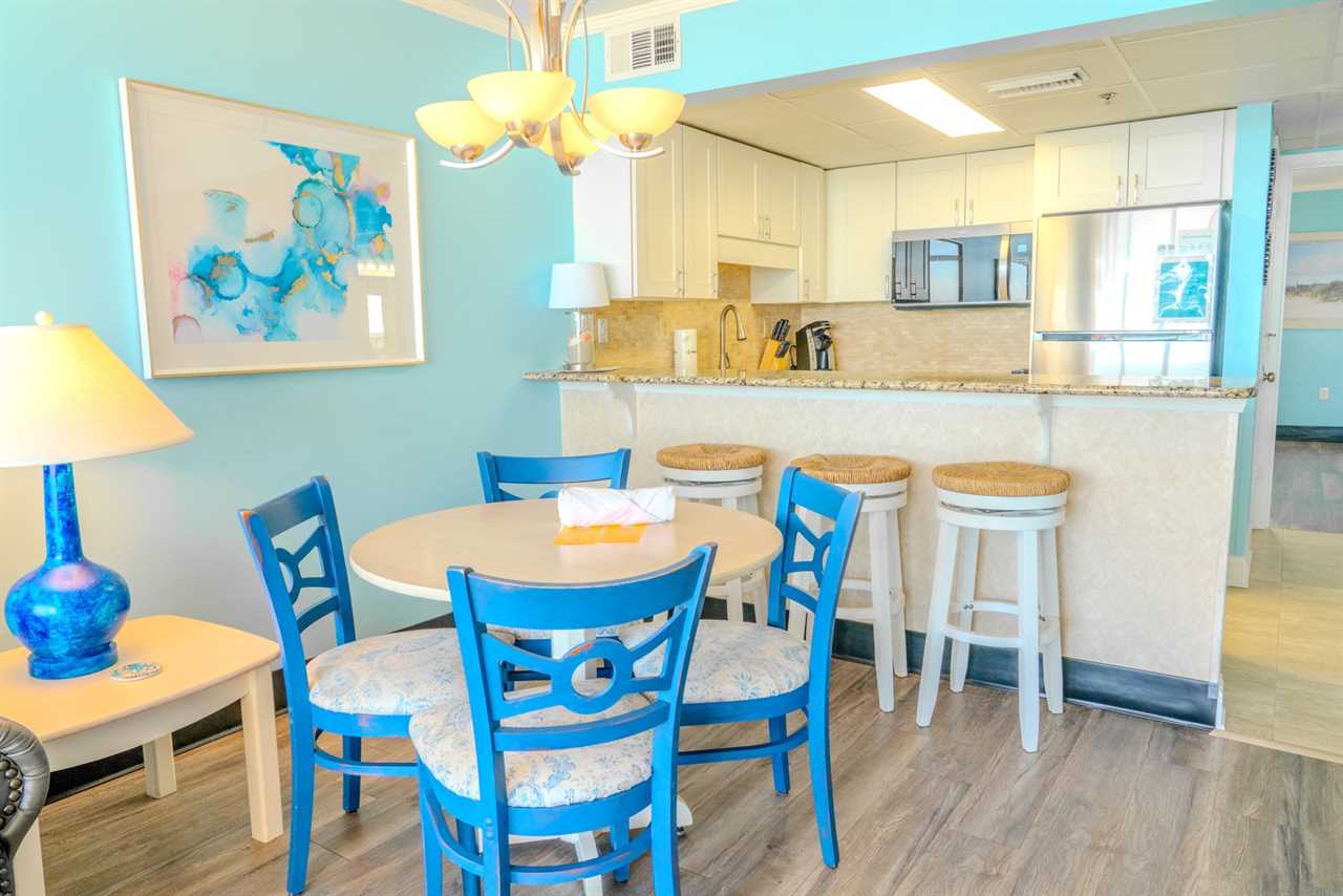 This unit also boasts a dining table with seating for four and additional barstool seating at the kitchen island. The fully equipped kitchen includes all new stainless steel appliances, including a stovetop, refrigerator, microwave, and dishwasher. While there is no oven, the kitchen provides plenty of counter space and all the essentials—dishes, cookware, and utensils—for preparing delicious meals. For those who prefer dining out, Myrtle Beach is home to countless amazing restaurants, many just a short walk or drive from Sand Dunes Resort. On-site, River City Café is a must-visit, while nearby options include Outback Steakhouse, Fiesta Mexican Restaurant, and the upscale Flamingo Grill (availability subject to change).