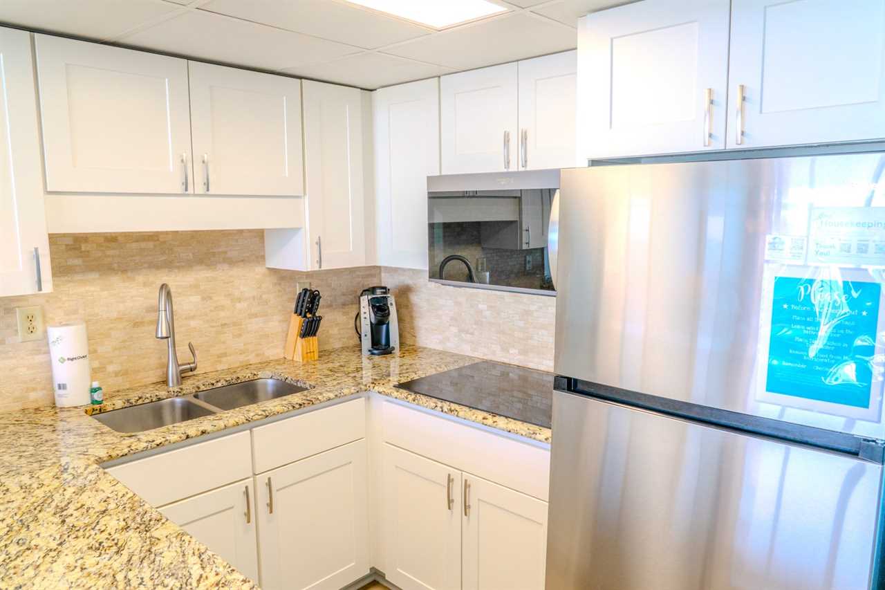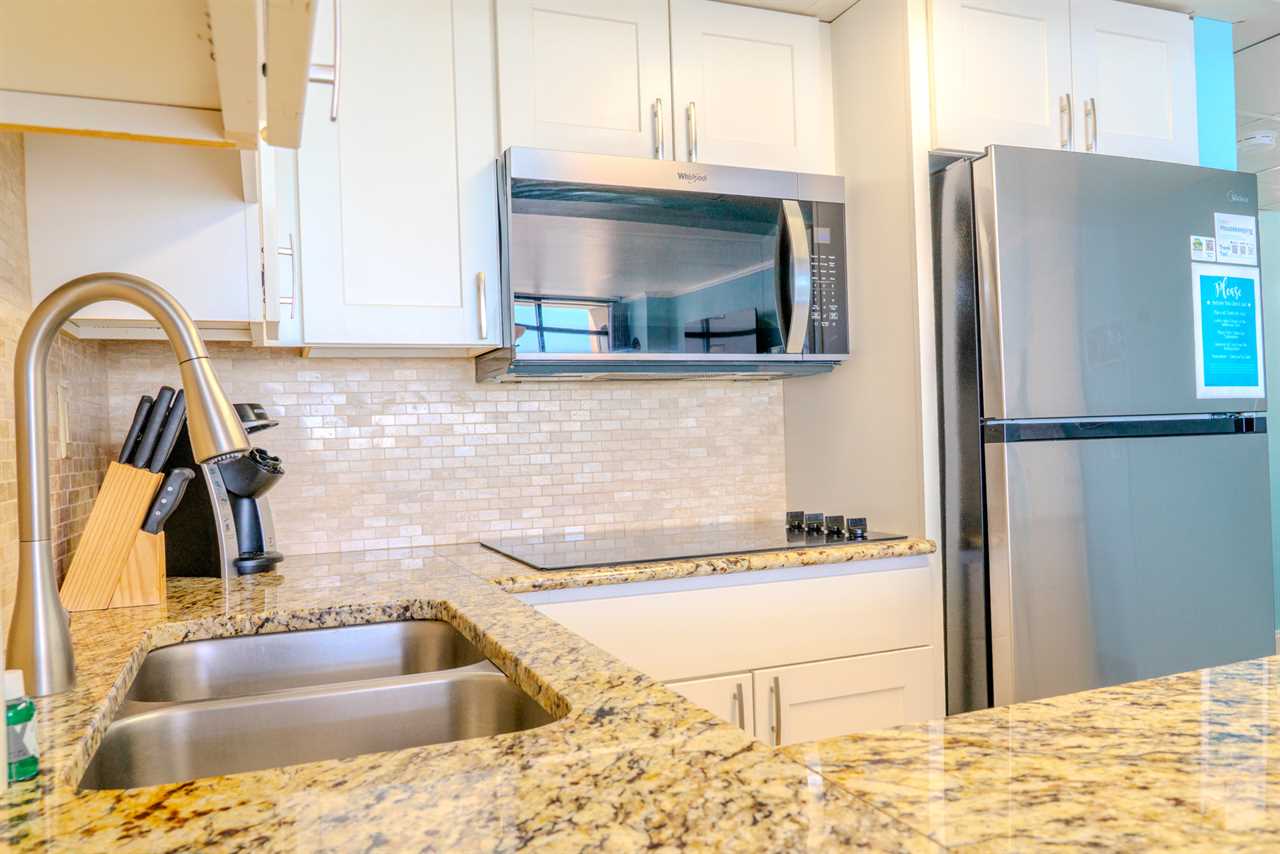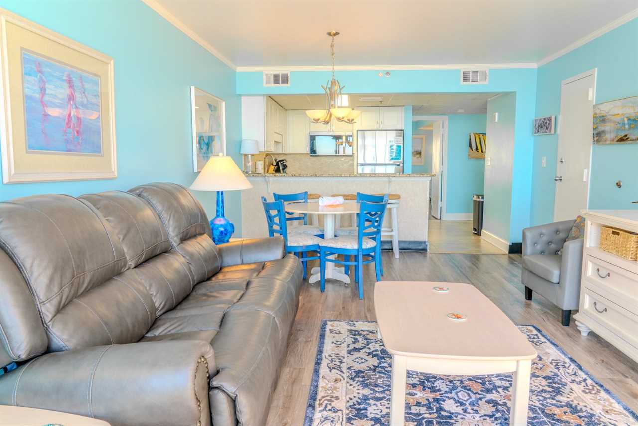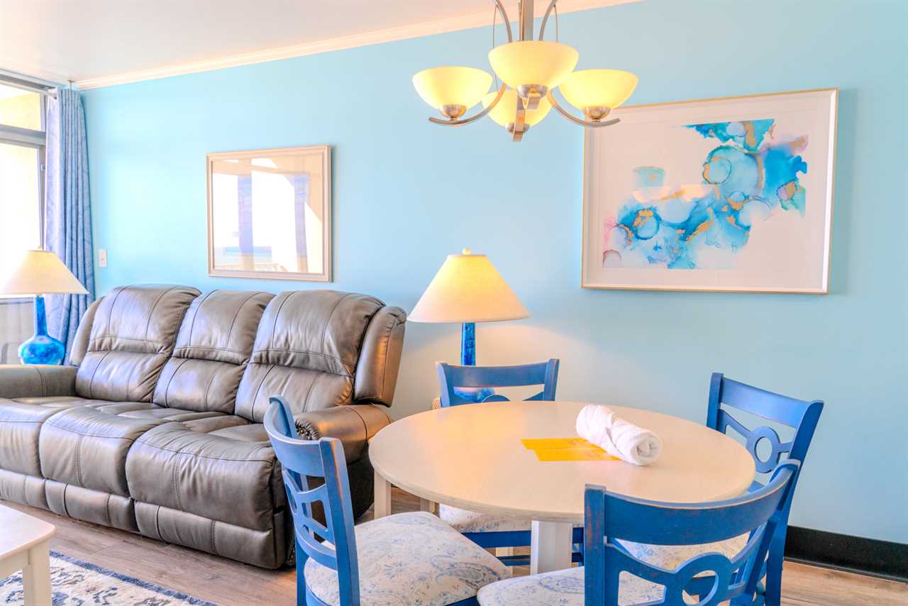 This unit also boasts a dining table with seating for four and additional barstool seating at the kitchen island. The fully equipped kitchen includes all new stainless steel appliances, including a stovetop, refrigerator, microwave, and dishwasher. While there is no oven, the kitchen provides plenty of counter space and all the essentials—dishes, cookware, and utensils—for preparing delicious meals. For those who prefer dining out, Myrtle Beach is home to countless amazing restaurants, many just a short walk or drive from Sand Dunes Resort. On-site, River City Café is a must-visit, while nearby options include Outback Steakhouse, Fiesta Mexican Restaurant, and the upscale Flamingo Grill (availability subject to change).