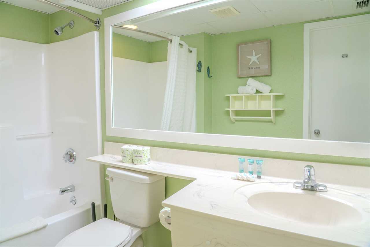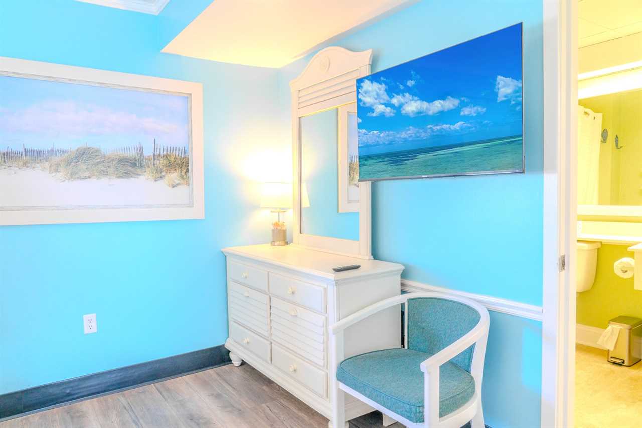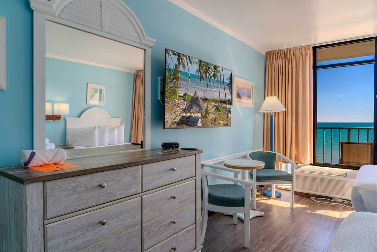 Let's begin with 1245, a cozy studio designed for your ultimate Myrtle Beach retreat. Upon entering, you'll be welcomed by its open and inviting layout, featuring two comfortable extra long double beds, perfect for up to 4 guests. To ensure you feel right at home, there's ample storage in the large dresser and private closet. The space also includes a 55in wall-mounted flat-screen smart TV and a small dining table for enjoying meals or snacks after a day of fun in the sun. This unit has LVP flooring in the main living space, and ceramic tile in the bathroom. The same can be found in 1246, with ceramic tile in the kitchen as well!