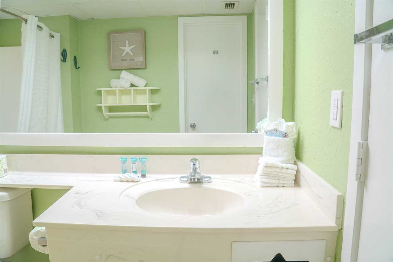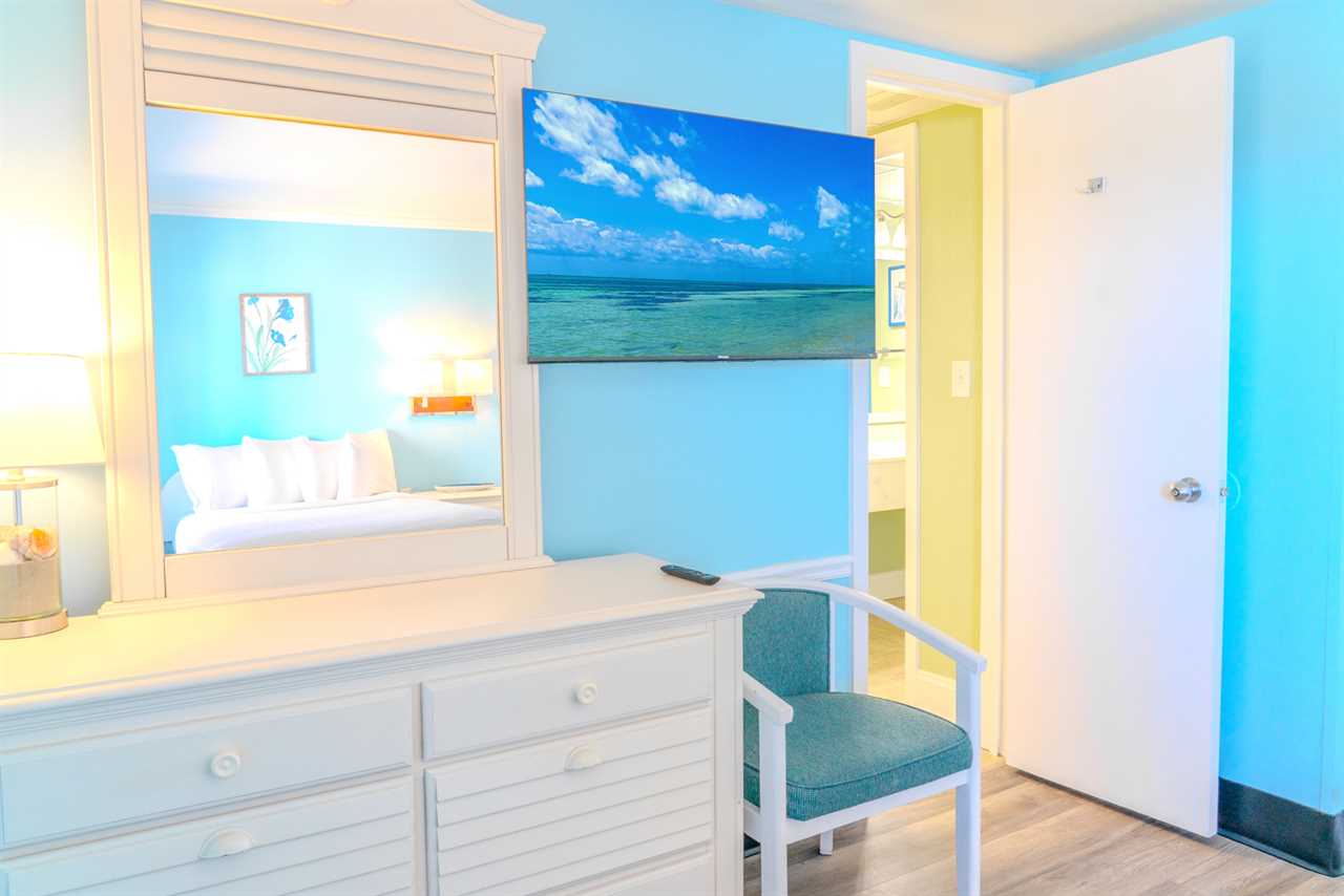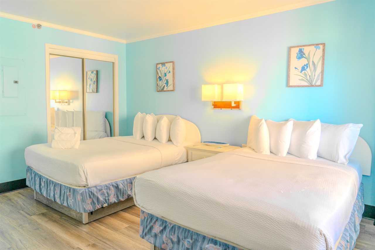 Let's begin with 1245, a cozy studio designed for your ultimate Myrtle Beach retreat. Upon entering, you'll be welcomed by its open and inviting layout, featuring two comfortable extra long double beds, perfect for up to 4 guests. To ensure you feel right at home, there's ample storage in the large dresser and private closet. The space also includes a 55in wall-mounted flat-screen smart TV and a small dining table for enjoying meals or snacks after a day of fun in the sun. This unit has LVP flooring in the main living space, and ceramic tile in the bathroom. The same can be found in 1246, with ceramic tile in the kitchen as well!