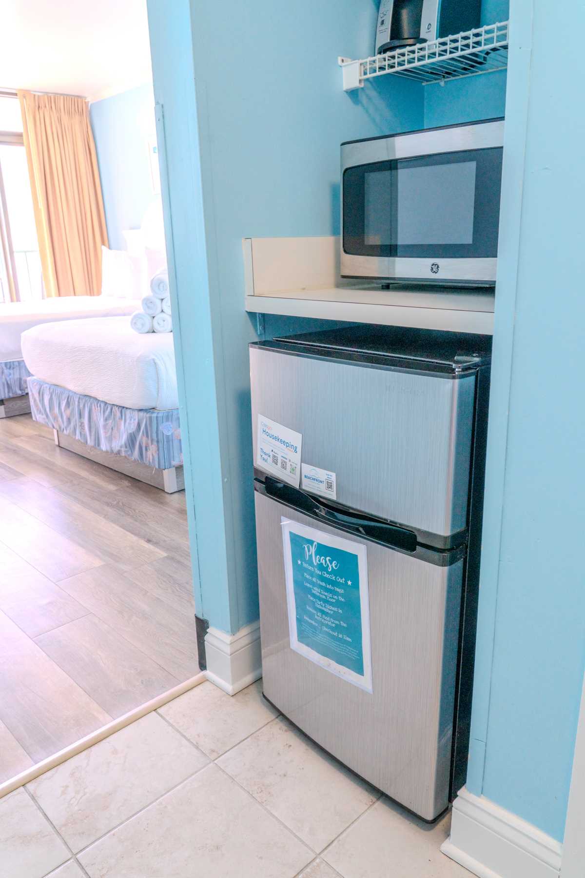The kitchenette in 1245 is compact yet efficient, offering a mini fridge, microwave, and coffee maker—perfect for preparing quick and easy meals or morning coffee before heading out to explore.