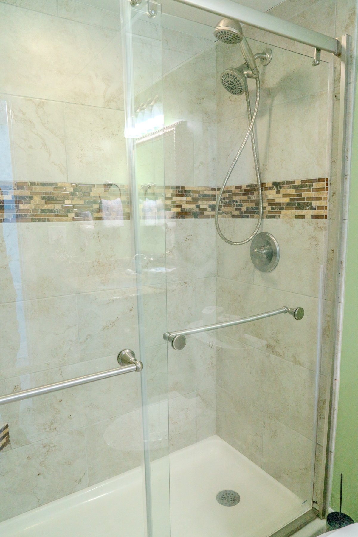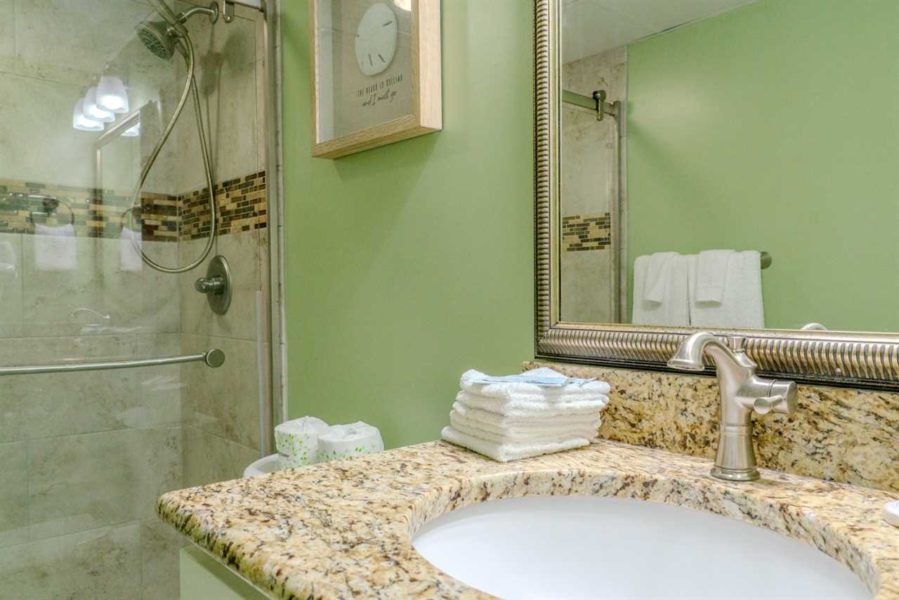 Adjacent to the kitchenette is the bathroom, thoughtfully designed with a tiled walk in shower with a detachable showerhead for added convenience. The granite vanity provides plenty of countertop space, with additional cabinet storage below.