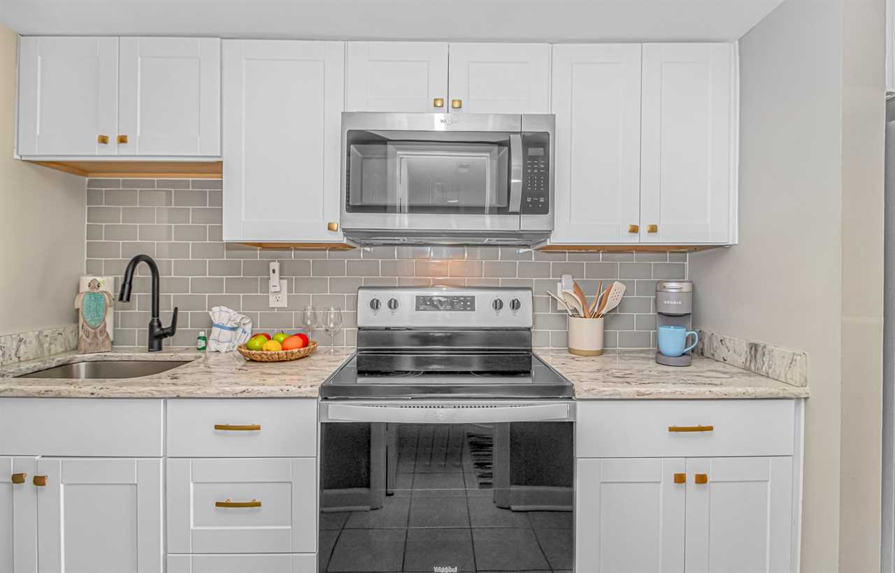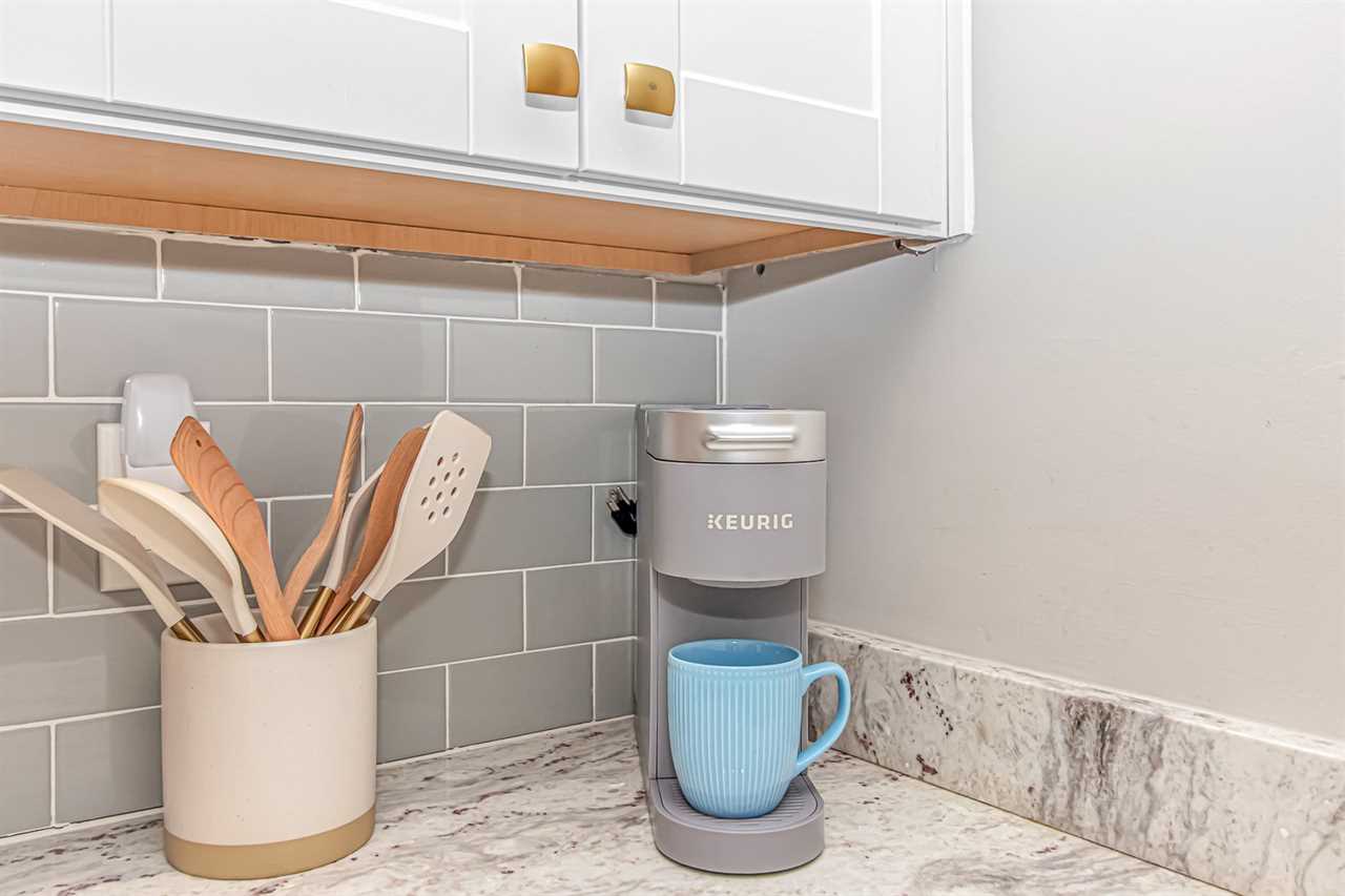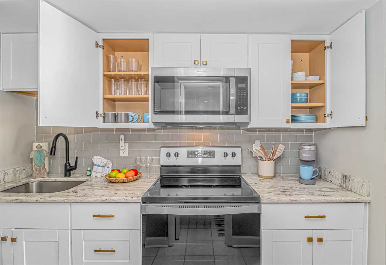 The fully equipped kitchen is a chef's dream, complete with beautiful custom backsplash, light cabinetry with gold pulls, and plenty of counter space to prepare meals. You'll have everything you need with full-sized, stainless steel appliances, including a refrigerator, stove, oven, freezer, and a mounted microwave. There's also a selection of cookware, dishes, and utensils, as well as smaller appliances like a coffee maker and toaster. Whether you're whipping up breakfast before heading to the beach or enjoying a relaxing dinner in, this kitchen is ready for it all. If cooking isn't on the agenda, you'll find plenty of excellent dining options nearby, and food delivery services like Uber Eats and DoorDash are just a click away.