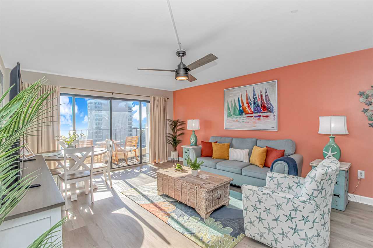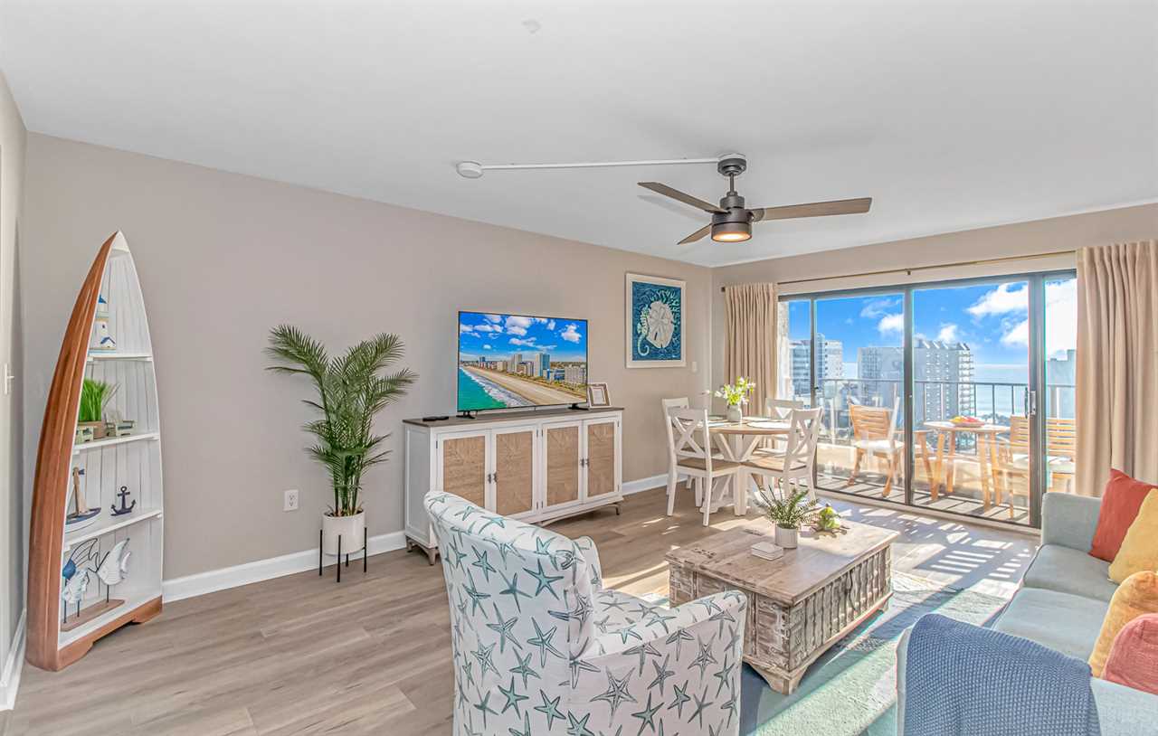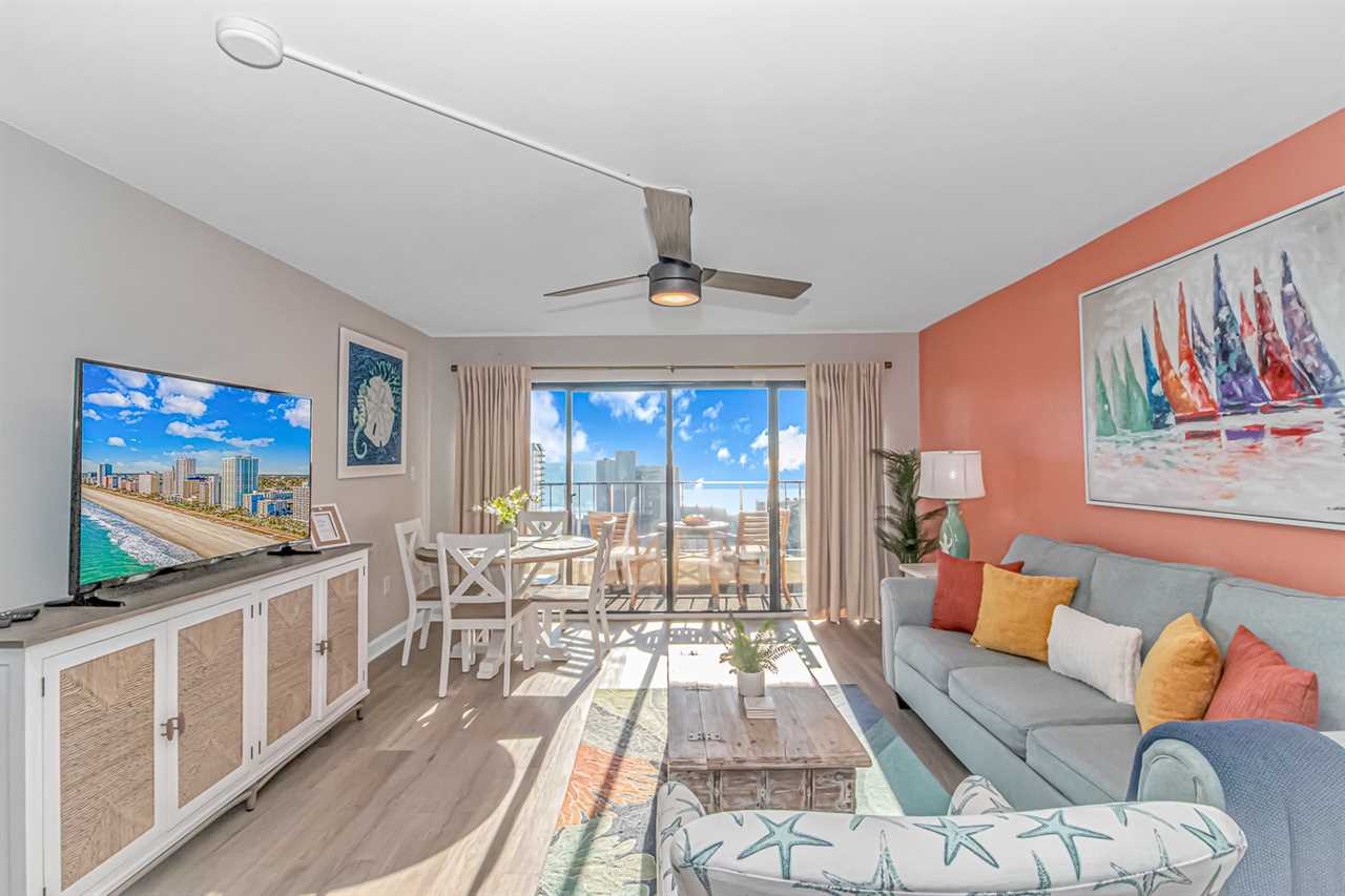 The main living area is perfect for unwinding after a fun day on the beach. Relax on the queen-sized sleeper sofa or accent chair, enjoy a movie on the large flat-screen TV, or simply take in the ocean breeze from the private balcony. The ocean views from the balcony are absolutely stunning—whether you're watching the sunrise, spotting dolphins, or simply taking in the beauty of the coast, it's the perfect place to relax and recharge.