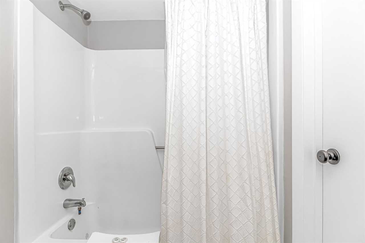 As you step inside, you'll be greeted by a hallway leading to the bedroom, which features a queen-sized bed, two nightstands, a dresser, and a mounted flat-screen TV for your convenience. The bedroom also includes access to the ensuite bathroom, which has a tub/shower combo, vanity, and a hairdryer. The bathroom also has a separate space with the toilet, providing extra privacy with a door separating it from the rest of the bathroom. For added convenience, there's another entry to the bathroom just across from the kitchen.
