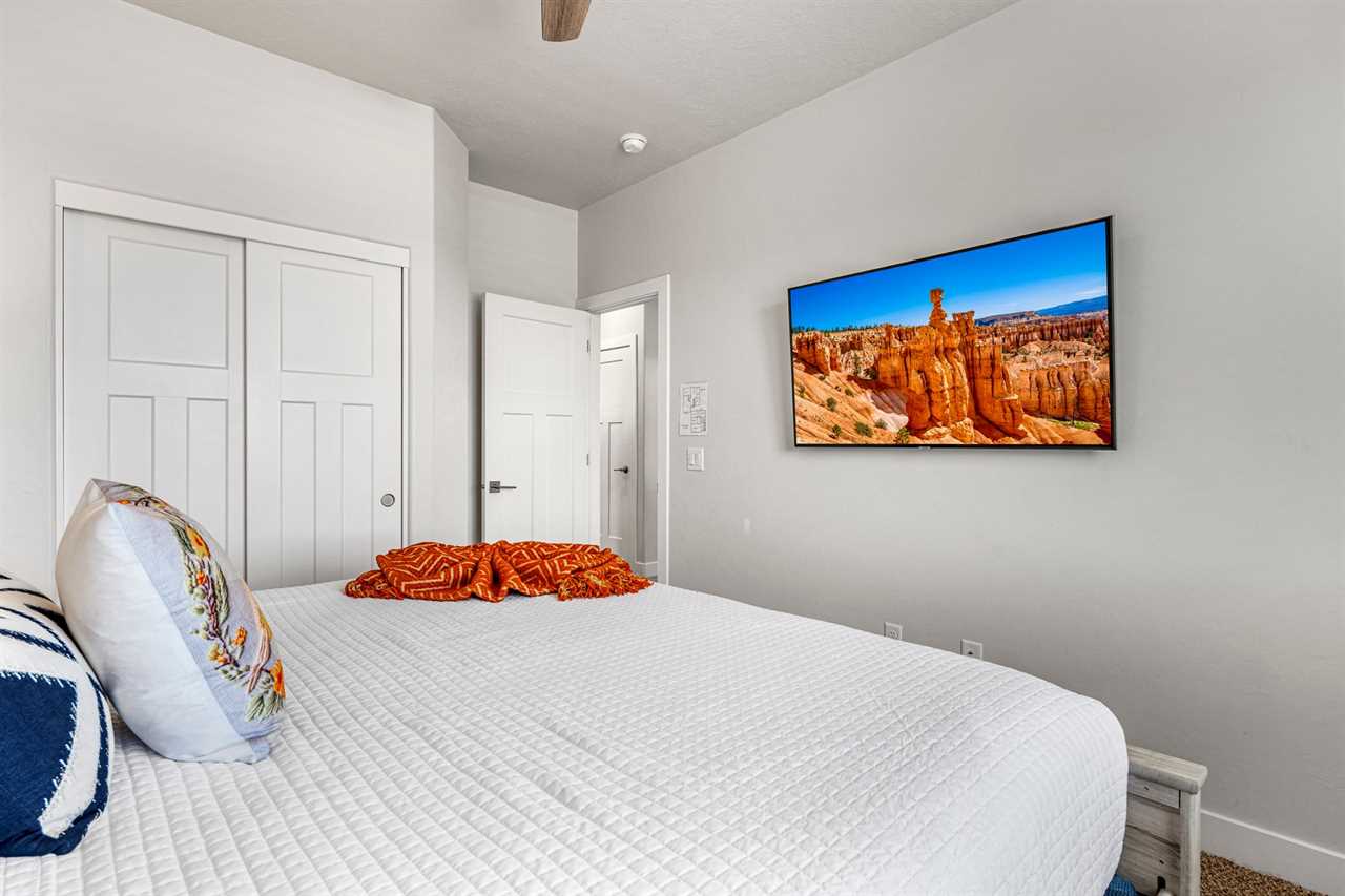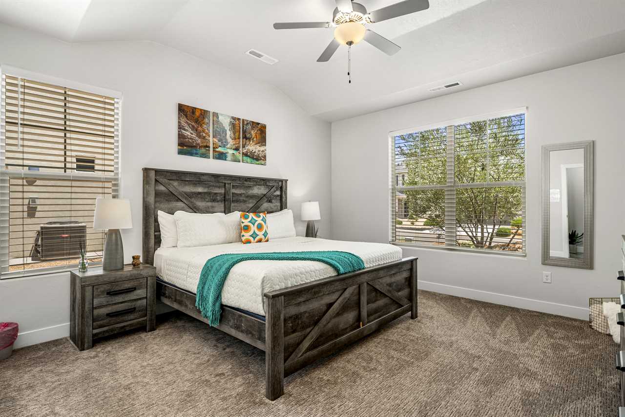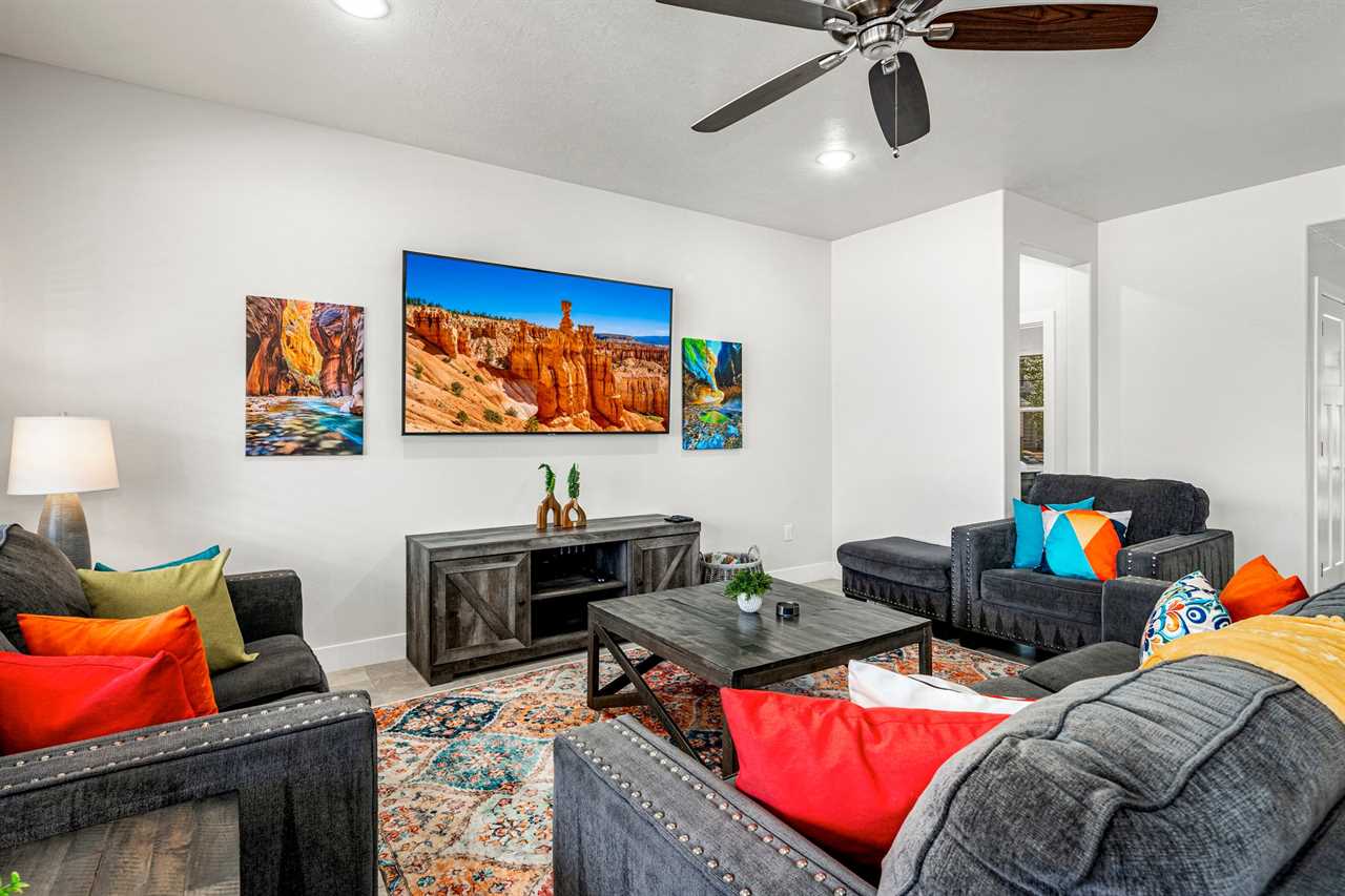Get ready to experience the thrill of Southern Utah's outdoor beauty while staying in this private home that's packed with comfort and fun for your whole family! Perfectly situated in St. George, The Narrows Escape is your gateway to stunning hiking, biking, and outdoor adventures right outside your door. The spacious living room is designed for downtime, featuring plush seating where you can kick back and relax after a day of hiking the red rocks. And with a 75" flat screen TV, family movie nights just got an upgrade. Every bedroom also comes with its own TV, so everyone gets their own screen time. Whether you're gearing up for a day of exploring or relaxing after an action-packed adventure, this home has everything you need.