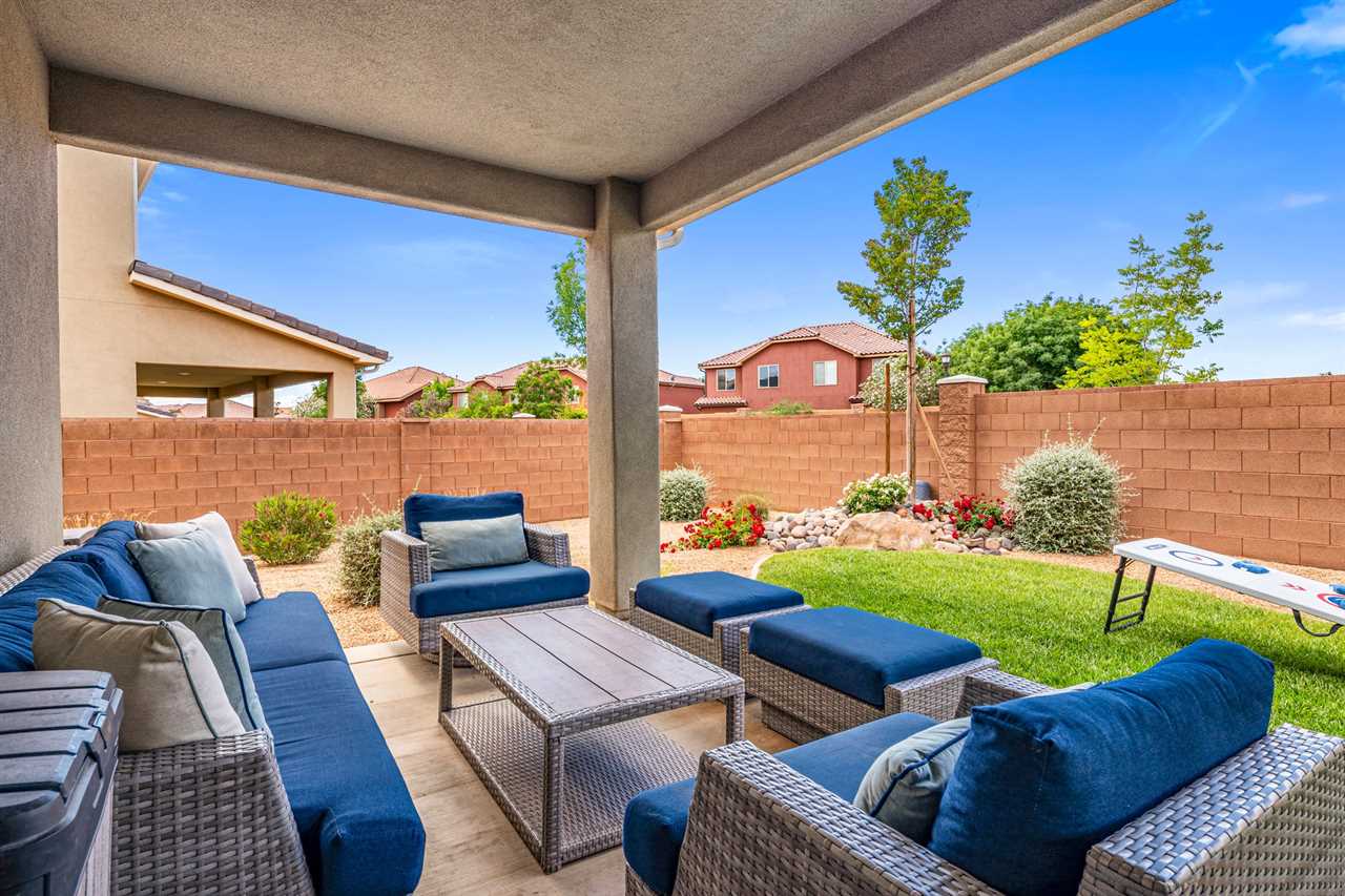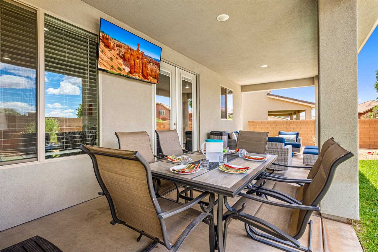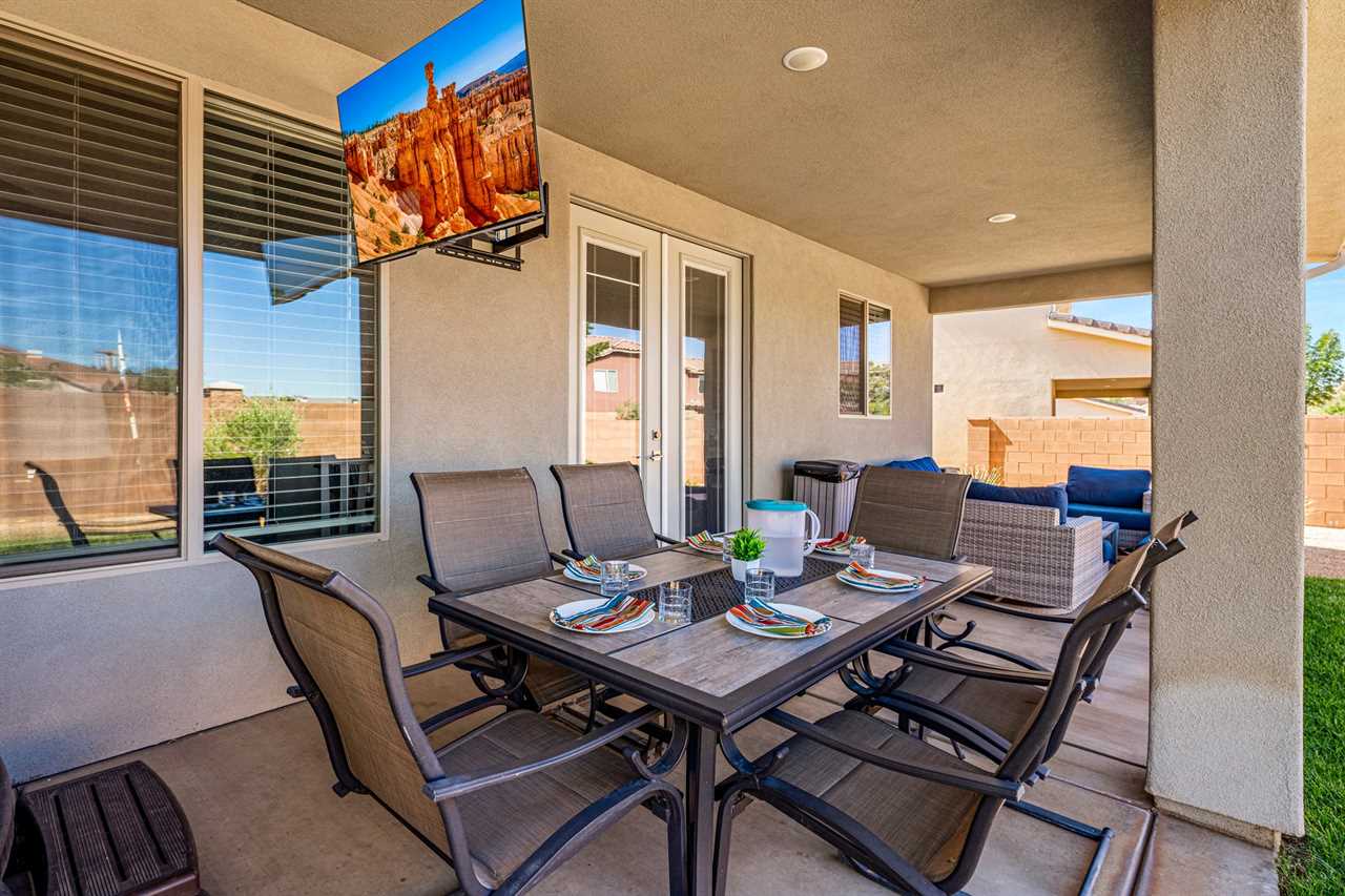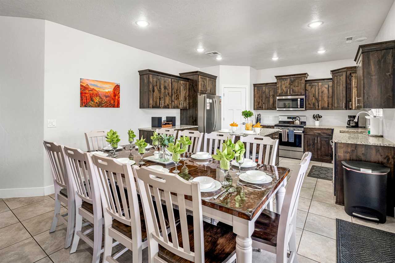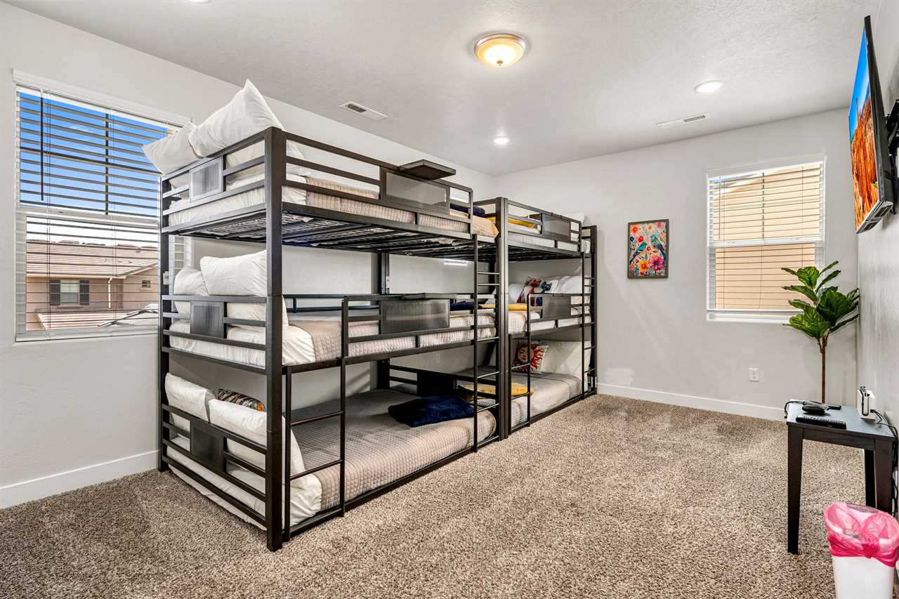 When it's time to eat, the fully stocked kitchen has all the essentials for preparing meals after your outdoor adventures. Stainless steel appliances, including a gas-burning stove, make meal prep a breeze, while the huge dining table seats up to 10 people, with extra seating at the counter for more fun. The spacious layout also includes a laundry room with full-size washer and dryer. Step outside to your own personal outdoor paradise. With Southern Utah's endless blue skies and breathtaking landscapes, this covered patio is the perfect spot to unwind. Enjoy the view while lounging on cushioned chairs, ottomans, and a sofa, or fire up the grill or Traeger smoker for a delicious outdoor feast. Upstairs, you'll find 4 additional bedrooms and 2 full bathrooms, each designed for comfort and fun. Three of the rooms feature new king beds, and the bunk room, with two sets of full-size bunk beds, is the perfect spot for kids to hang out and have some fun. You're not just staying in any vacation home – you're stepping into the heart of Southern Utah's outdoor playground! Ladera at Sienna Hills is surrounded by incredible local hiking and biking trails, so you can dive right into exploring the rugged beauty of the area. If you're bringing along your RV or trailer, you're in luck – the community has parking available. Start your next adventure today! Book your stay at The Narrows Escape and make Southern Utah your playground.