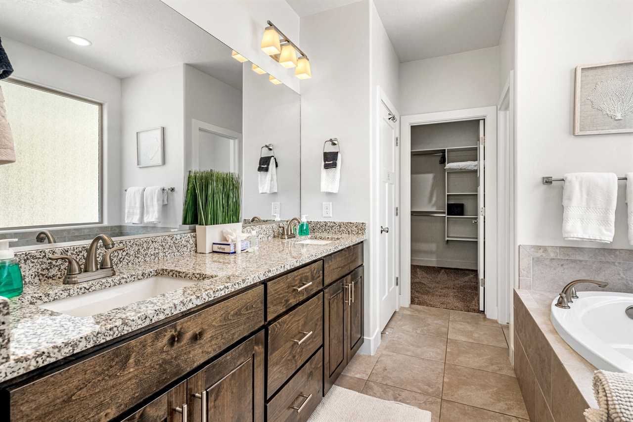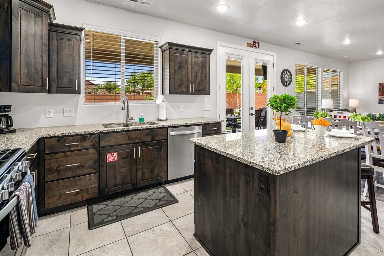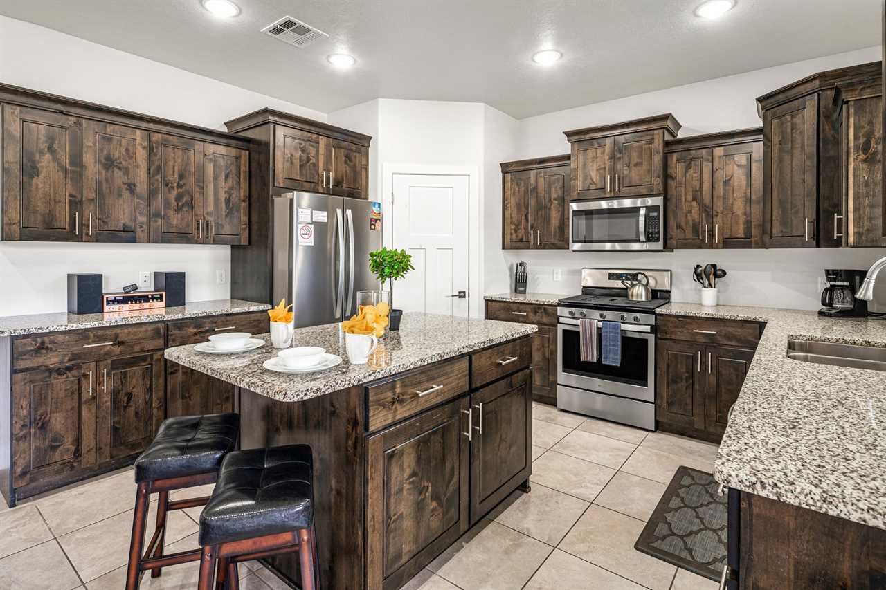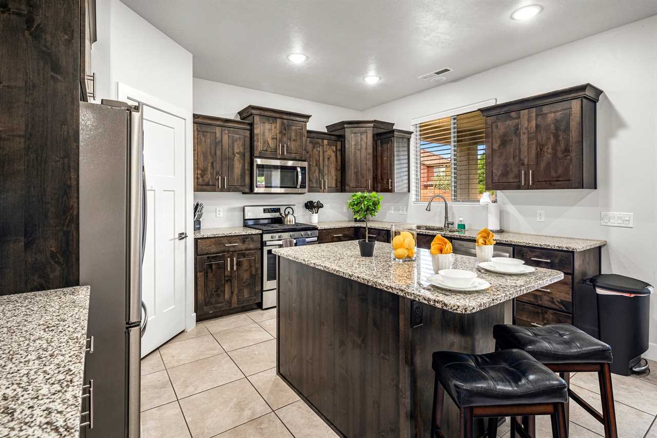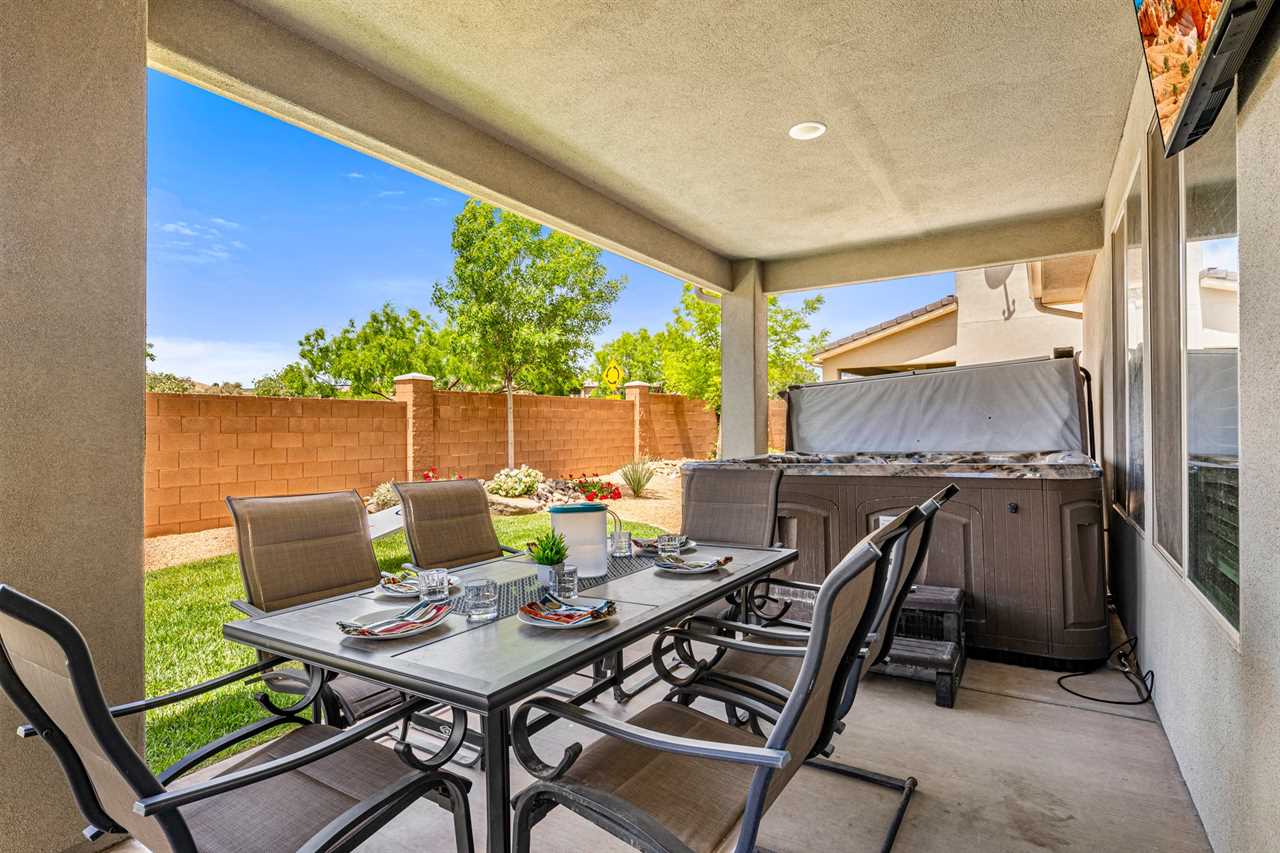 When it's time to eat, the fully stocked kitchen has all the essentials for preparing meals after your outdoor adventures. Stainless steel appliances, including a gas-burning stove, make meal prep a breeze, while the huge dining table seats up to 10 people, with extra seating at the counter for more fun. The spacious layout also includes a laundry room with full-size washer and dryer. Step outside to your own personal outdoor paradise. With Southern Utah's endless blue skies and breathtaking landscapes, this covered patio is the perfect spot to unwind. Enjoy the view while lounging on cushioned chairs, ottomans, and a sofa, or fire up the grill or Traeger smoker for a delicious outdoor feast. Upstairs, you'll find 4 additional bedrooms and 2 full bathrooms, each designed for comfort and fun. Three of the rooms feature new king beds, and the bunk room, with two sets of full-size bunk beds, is the perfect spot for kids to hang out and have some fun. You're not just staying in any vacation home – you're stepping into the heart of Southern Utah's outdoor playground! Ladera at Sienna Hills is surrounded by incredible local hiking and biking trails, so you can dive right into exploring the rugged beauty of the area. If you're bringing along your RV or trailer, you're in luck – the community has parking available. Start your next adventure today! Book your stay at The Narrows Escape and make Southern Utah your playground.