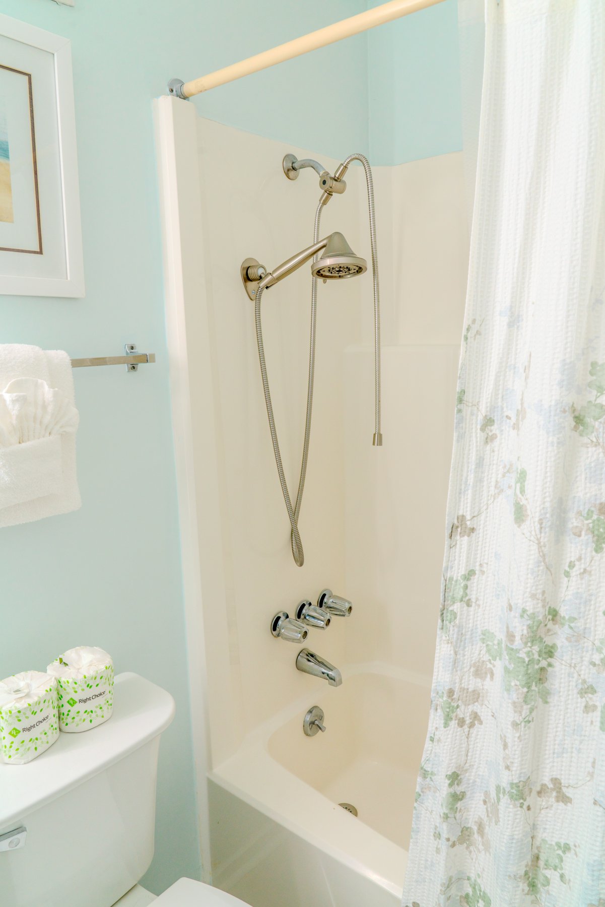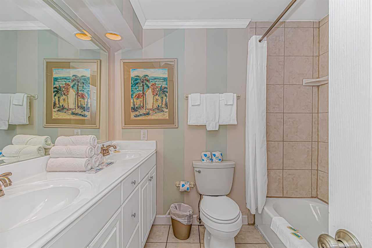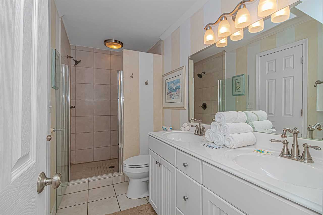 The second bedroom offers a queen bed, a dresser, a TV with cable, and a closet. Guests have easy access to the guest bathroom, which features a walk-in, tiled shower and a double vanity sink.