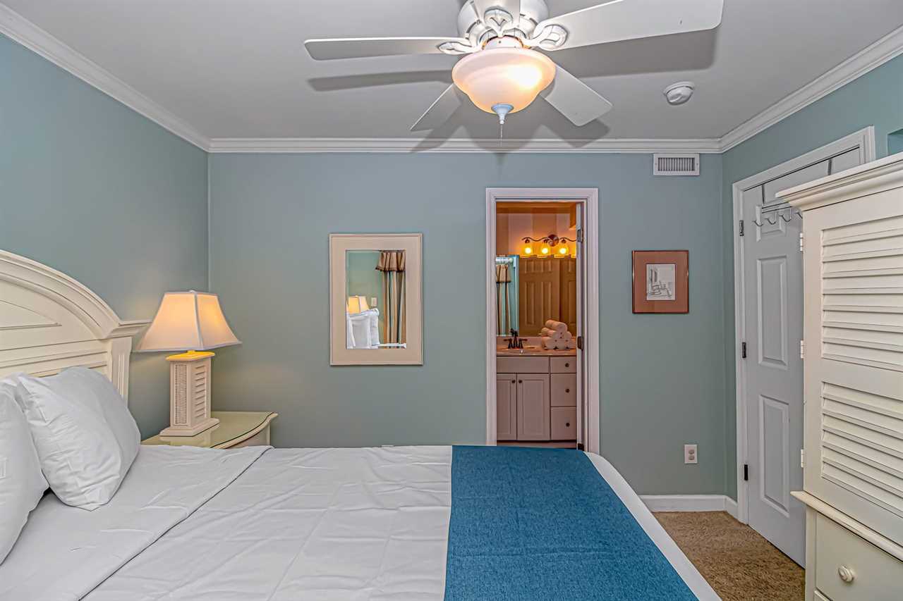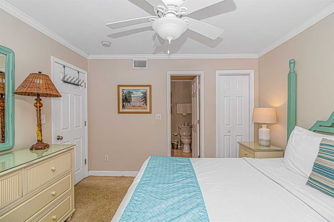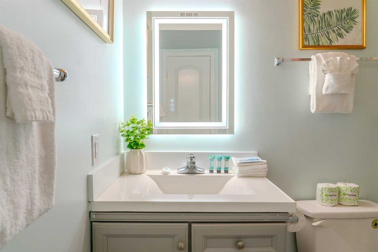Now, let's move on to the bedrooms. The first bedroom is a luxurious master suite, featuring a king-sized bed, a dresser and mirror, a flat-screen TV, a closet for extra storage, and access to the master bathroom. The en-suite bathroom includes a tub/shower combo, a toilet, and a double vanity sink for added convenience. For your convenience, we provide bath towels, washcloths, toiletries, and all the bedding you need for a comfortable stay. You'll also find a set of “starter toiletries” like toilet paper, paper towels, dish soap, shampoo, lotion, and conditioner, to ensure you have everything you need to settle in and enjoy your stay.