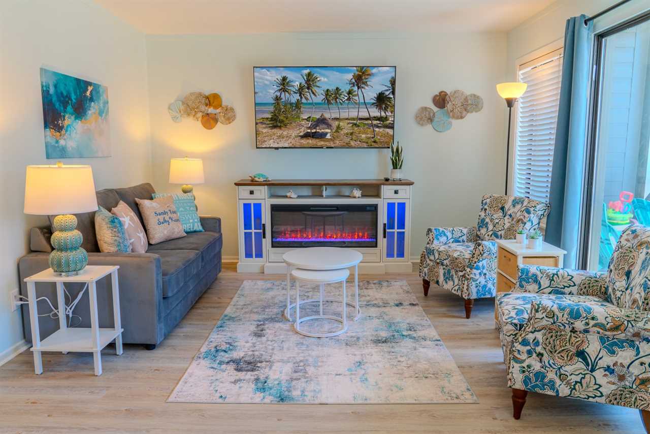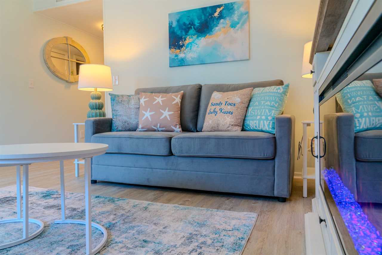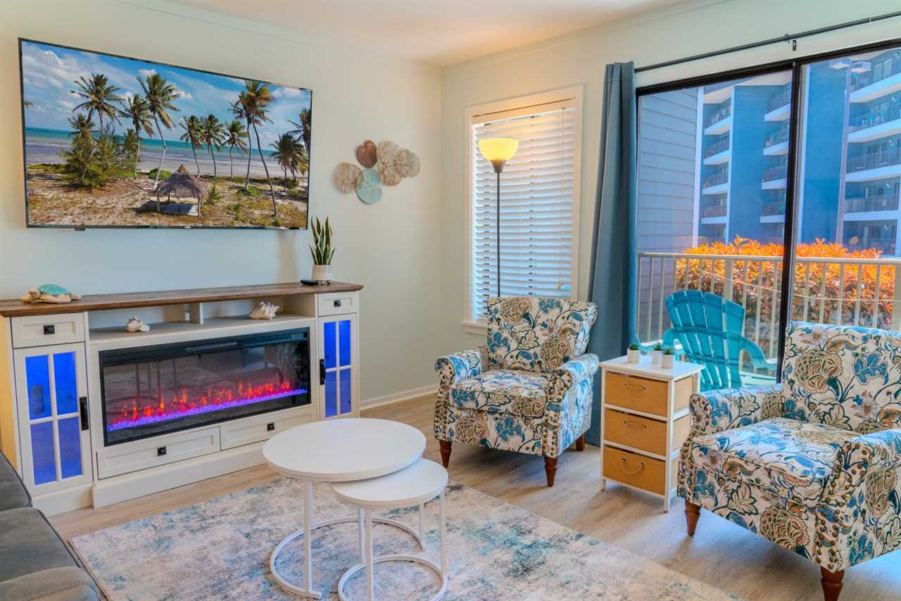 Across from the kitchen, the dining area features a large table with seating for your entire group, making it easy to enjoy meals together. This space flows seamlessly into the living room, which is furnished with brand-new, comfortable pieces, including a sofa that folds out into a full-sized bed and two accent chairs. After a day of fun and adventure, unwind on the couch and enjoy the cozy warmth of the LED electric fireplace, or catch up on your favorite shows on the oversized flat-screen TV. When you're ready to embrace the outdoors, step out onto the private balcony and take in the refreshing ocean breeze as you relax and savor the perfect Myrtle Beach escape.