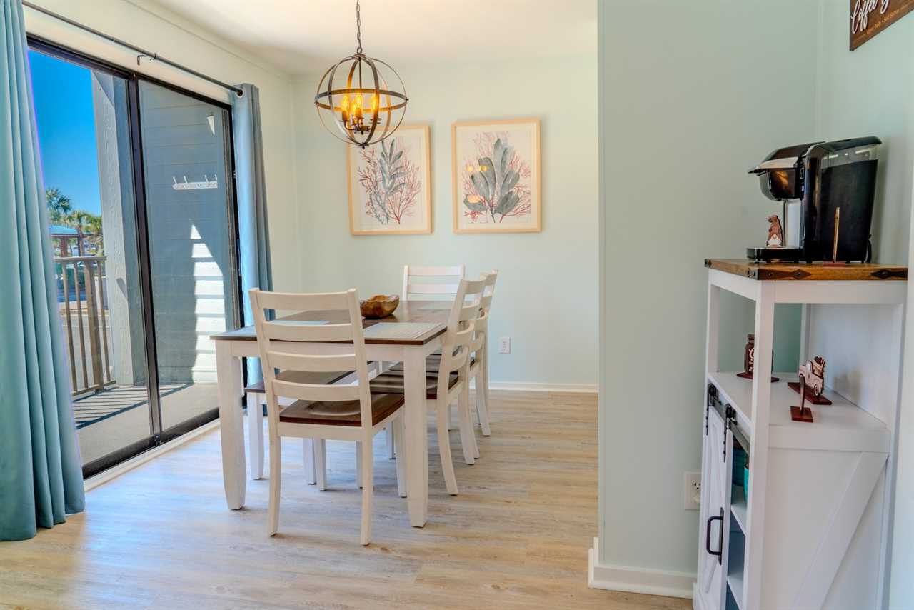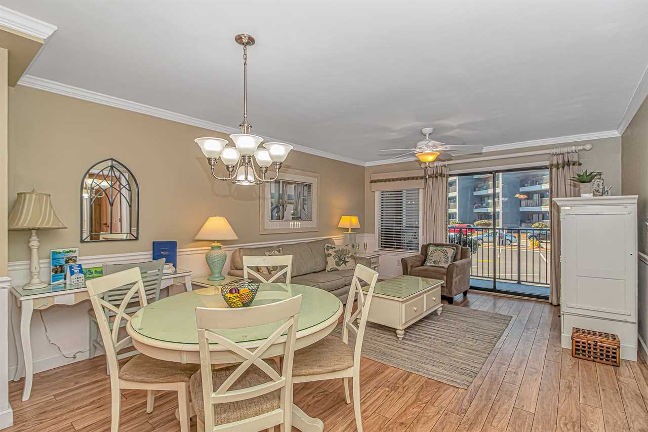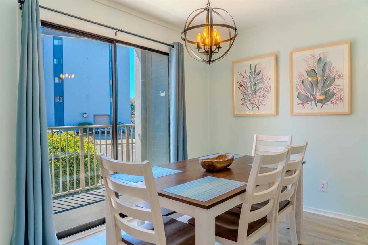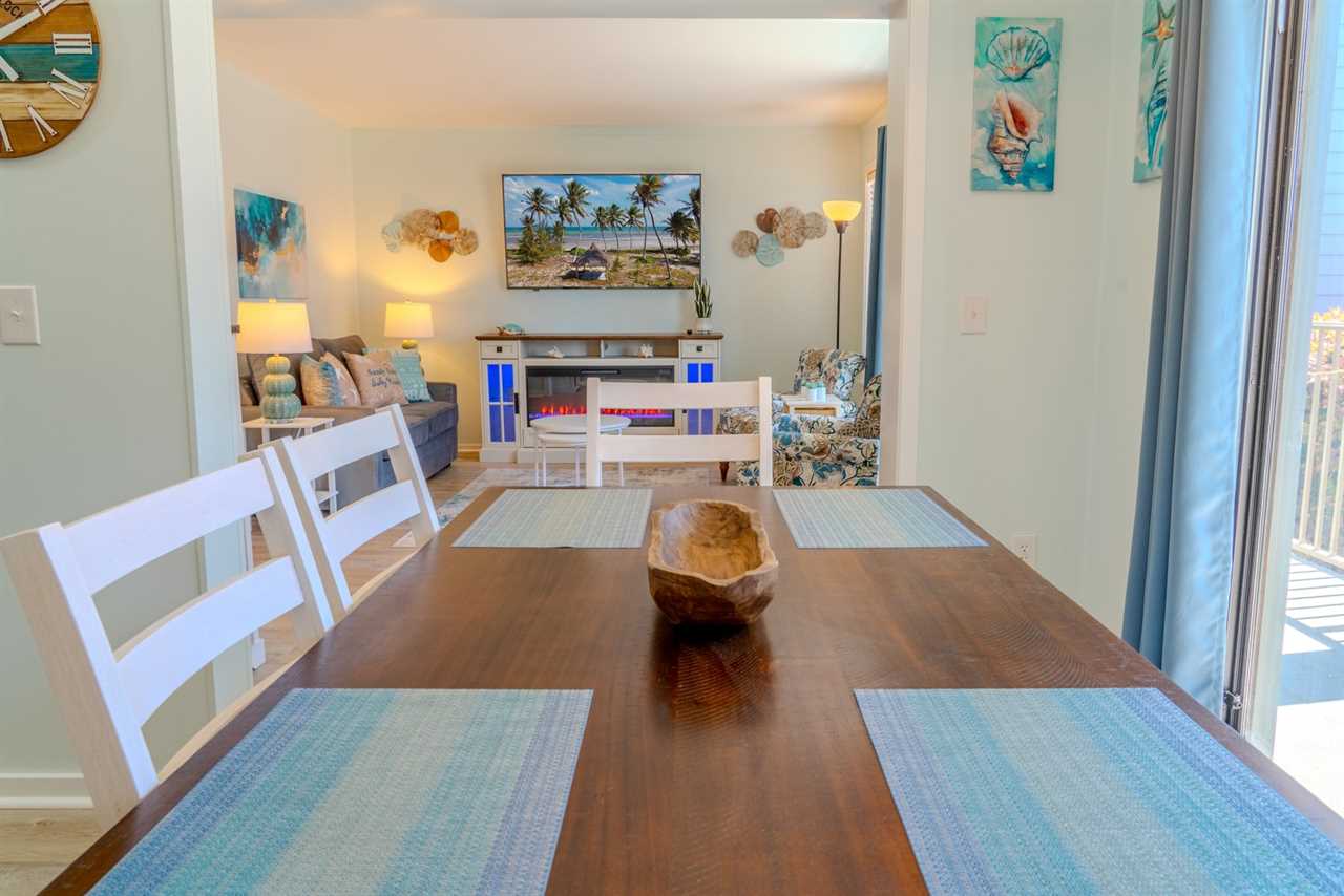 Across from the kitchen, the dining area features a large table with seating for your entire group, making it easy to enjoy meals together. This space flows seamlessly into the living room, which is furnished with brand-new, comfortable pieces, including a sofa that folds out into a full-sized bed and two accent chairs. After a day of fun and adventure, unwind on the couch and enjoy the cozy warmth of the LED electric fireplace, or catch up on your favorite shows on the oversized flat-screen TV. When you're ready to embrace the outdoors, step out onto the private balcony and take in the refreshing ocean breeze as you relax and savor the perfect Myrtle Beach escape.
