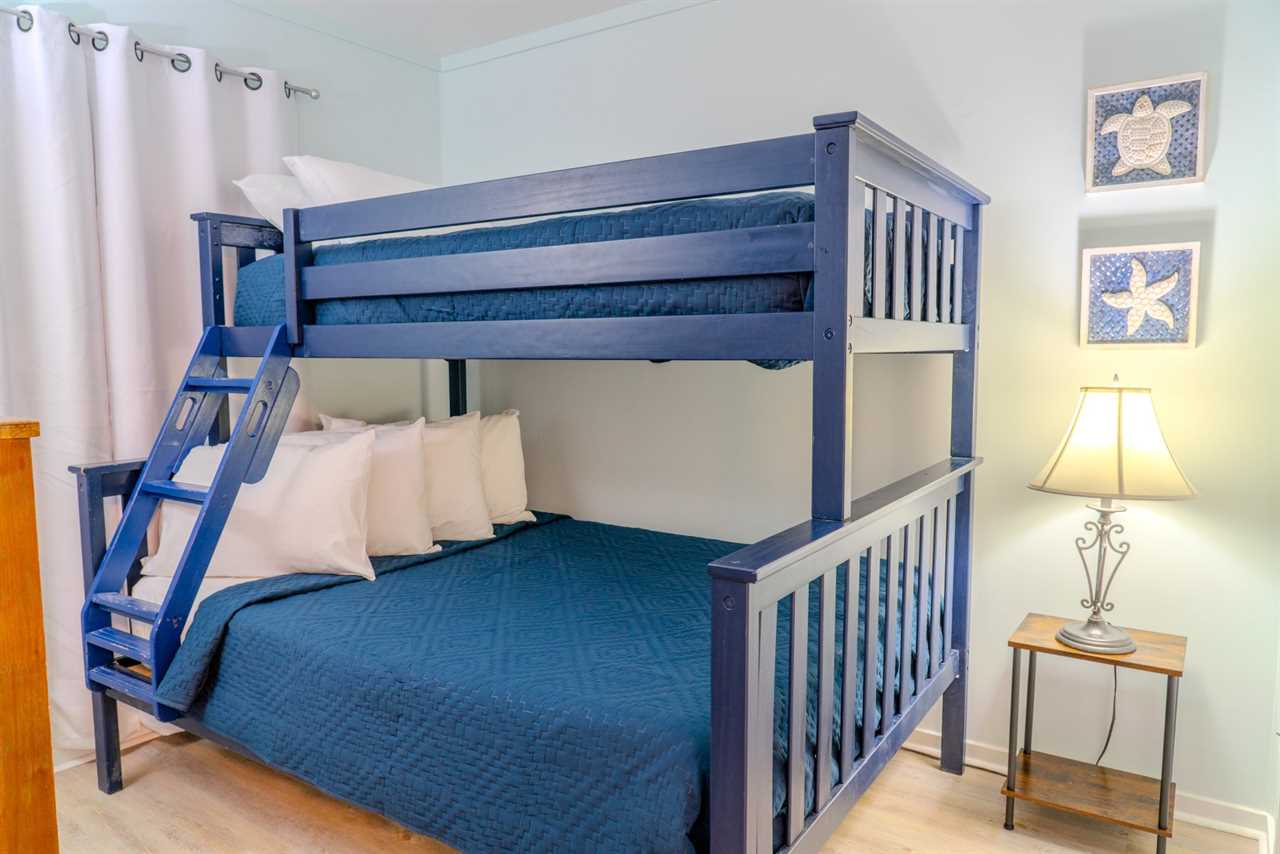 The second bedroom is ideal for children or friends, featuring a fun twin-over-full bunk bed. A cozy end table with a lamp and a dresser for storage complete the room, while another wall-mounted flat-screen TV ensures everyone has their own space to unwind.