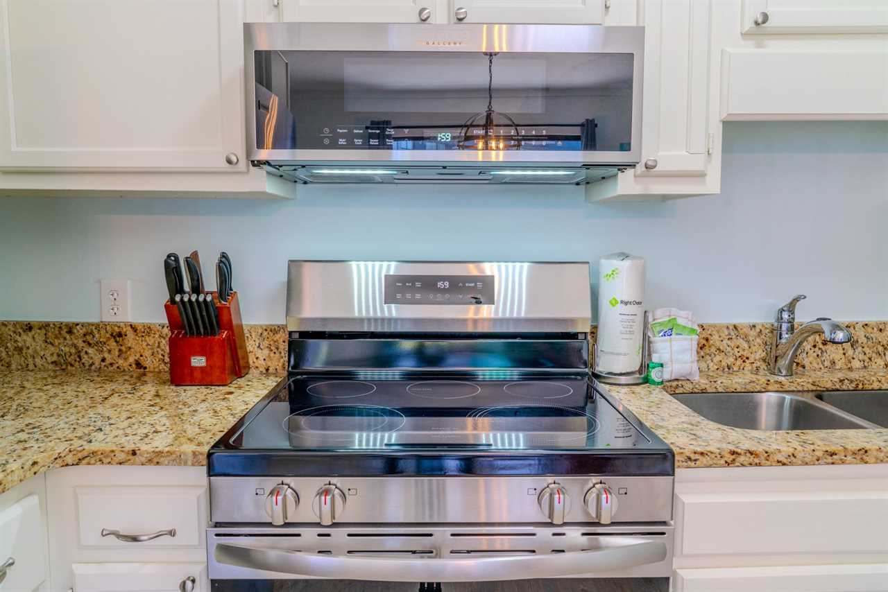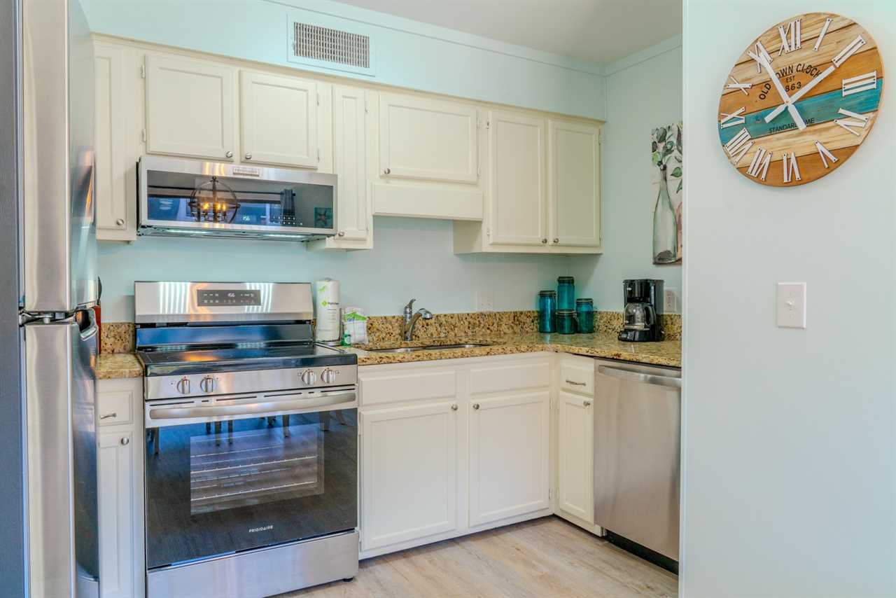 As you move into the heart of the condo, the kitchen shines with its brand-new stainless steel appliances, including a stove and oven, a mounted microwave, refrigerator, and dishwasher. The granite countertops provide plenty of space to prepare meals, while the cabinets offer ample storage for groceries. The kitchen is fully stocked with everything you need to cook up your favorite dishes.