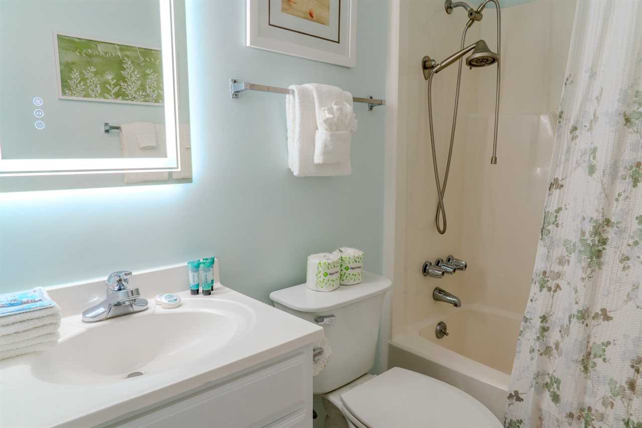Next door in unit 148, guests will find themselves greeted by a welcoming hallway that leads to two more beautiful bedrooms. The master bedroom is a peaceful retreat, furnished with a plush queen-sized bed, two stylish end tables with lamps, a spacious dresser, and a wall-mounted flat-screen TV. Natural light pours in through a large window, creating a warm and inviting atmosphere. The master suite also includes a private bathroom with a vanity sink, ample storage, an LED mirror with adjustable settings, a shower/tub combo with a detachable showerhead, and a toilet.