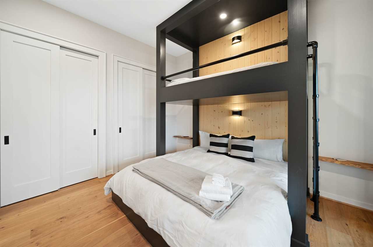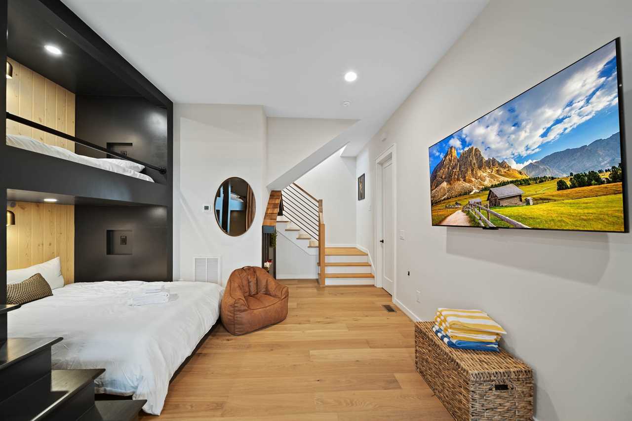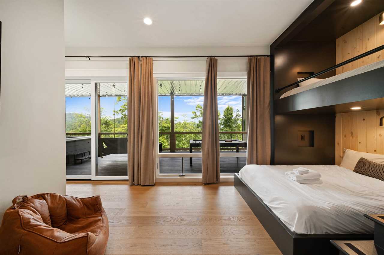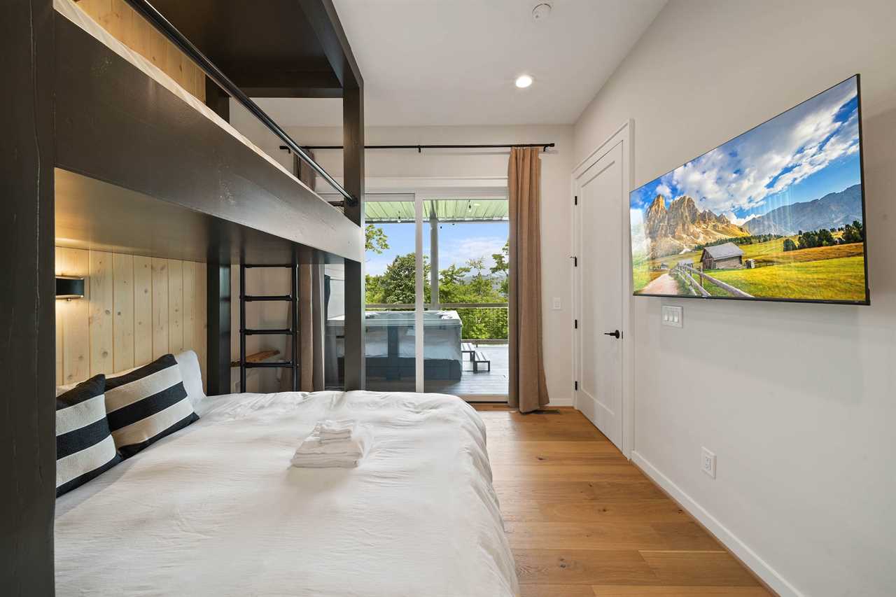- Lower Level: A playful bunk room with twin beds suspended over queen beds (plus a massive TV for movie marathons) and a second bunk-style king room with a twin-over-king setup.