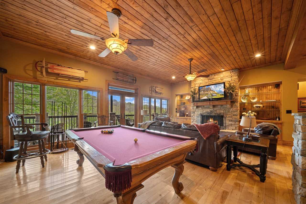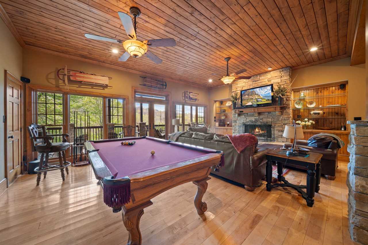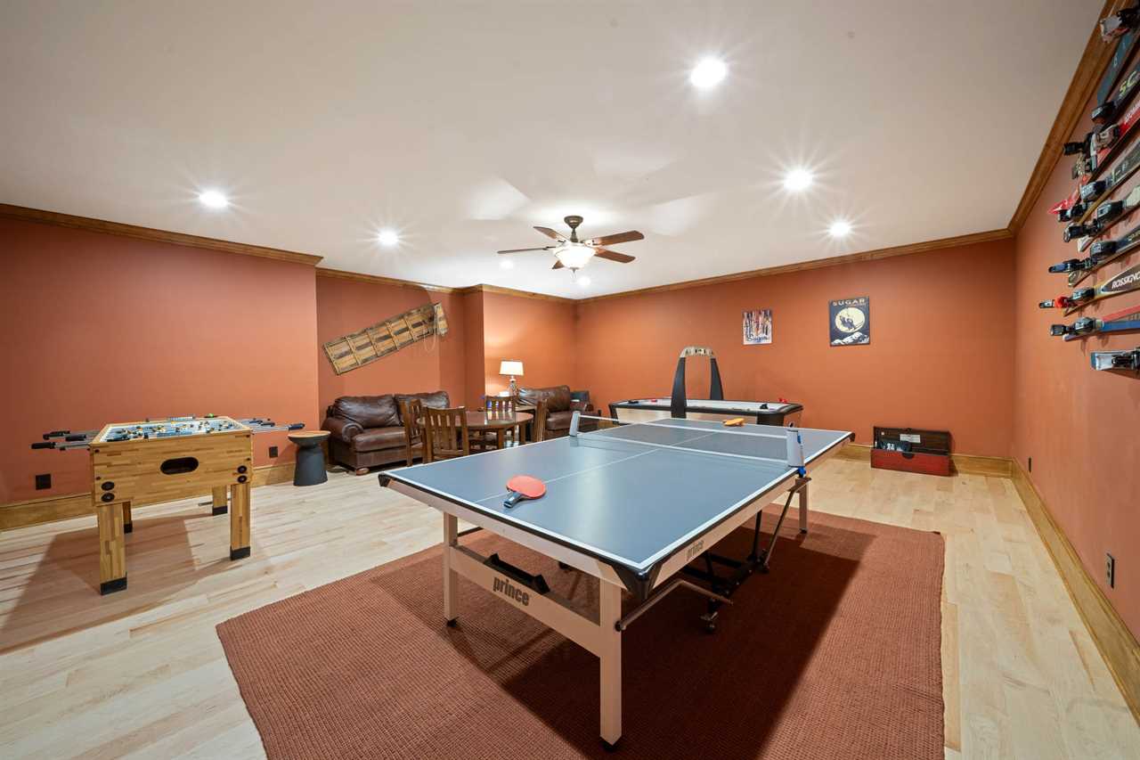 Downstairs, the fun continues with a second living room featuring a gas fireplace and pool table, a second fully stocked kitchen, a poker lounge, and a full game room. The game room includes a ping pong table, foosball table, and a card table—guaranteed entertainment for kids, teens, and fun-loving adults alike.