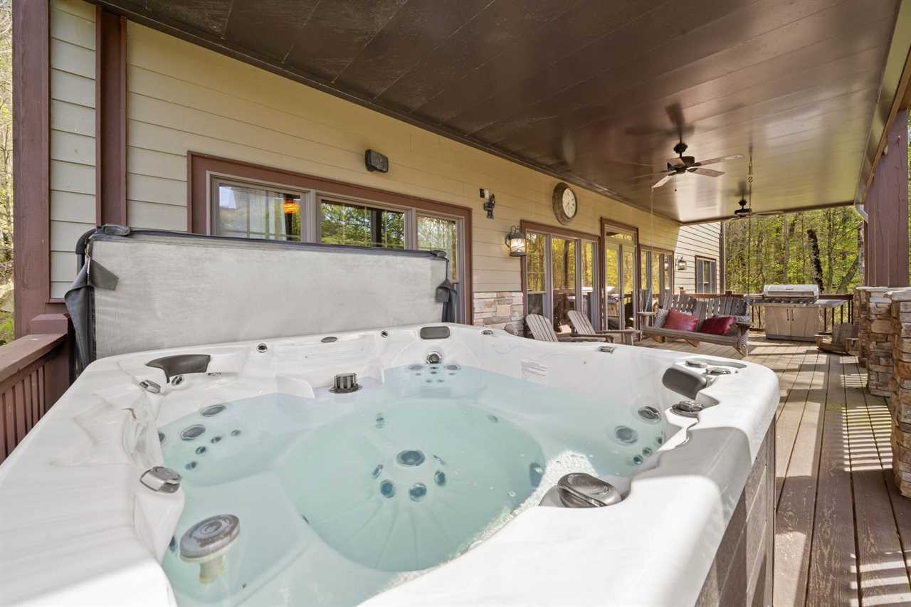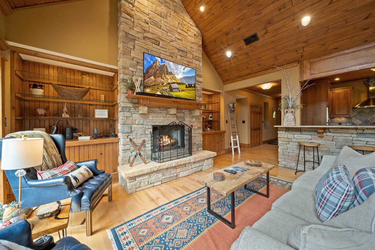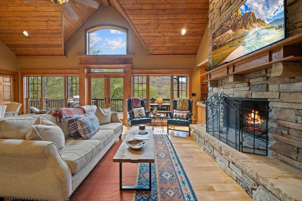 The main level boasts a wall of windows, soaring vaulted ceilings, and a cozy stacked stone gas fireplace with a large TV mounted above. For those needing to stay connected, a private office with a desk and high-speed internet makes working remotely easy and convenient. Step outside to the main deck where you'll find a brand-new 6-person hot tub, plenty of seating, and a gas grill—ideal for relaxing and enjoying the fresh mountain air.