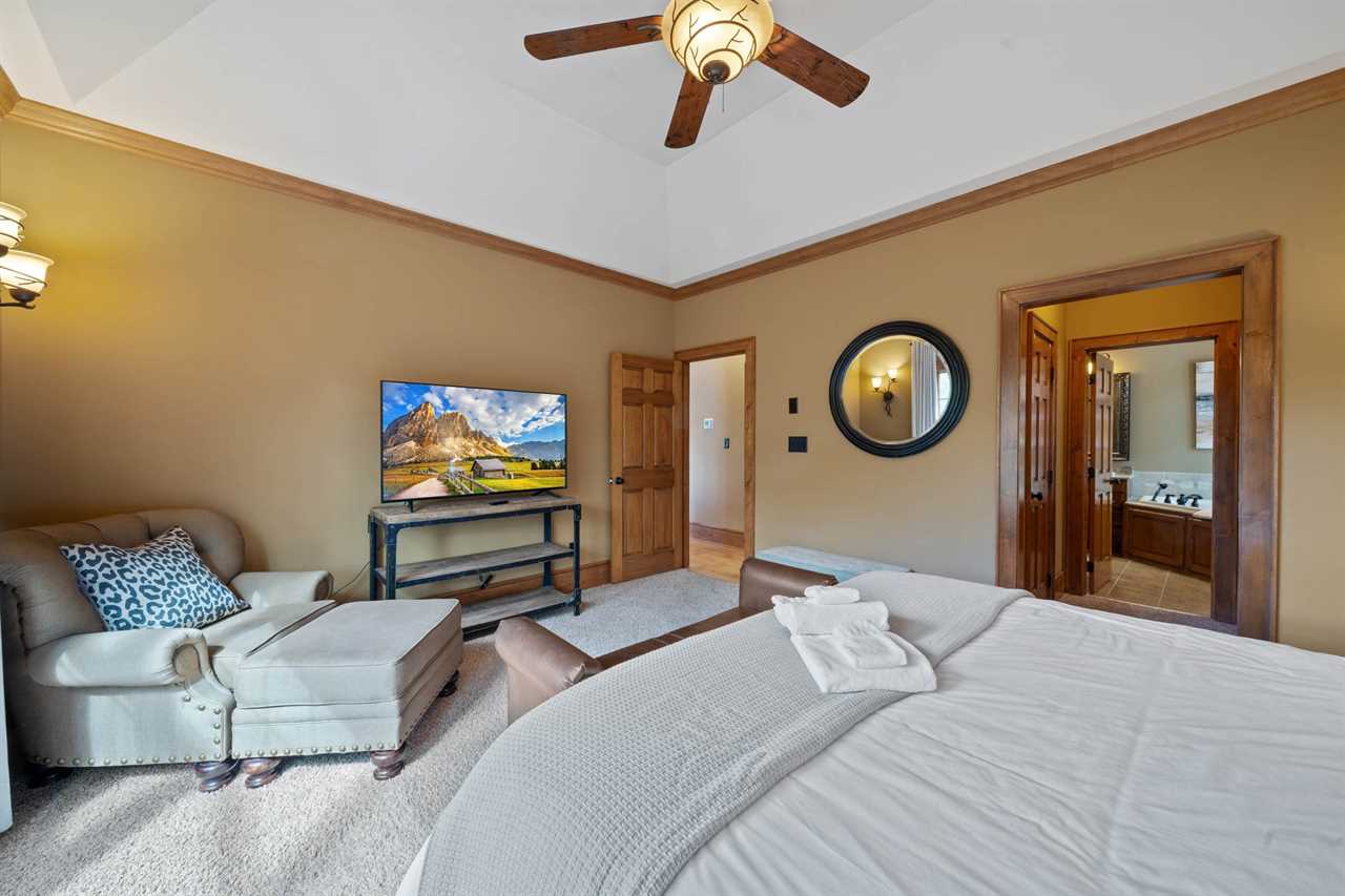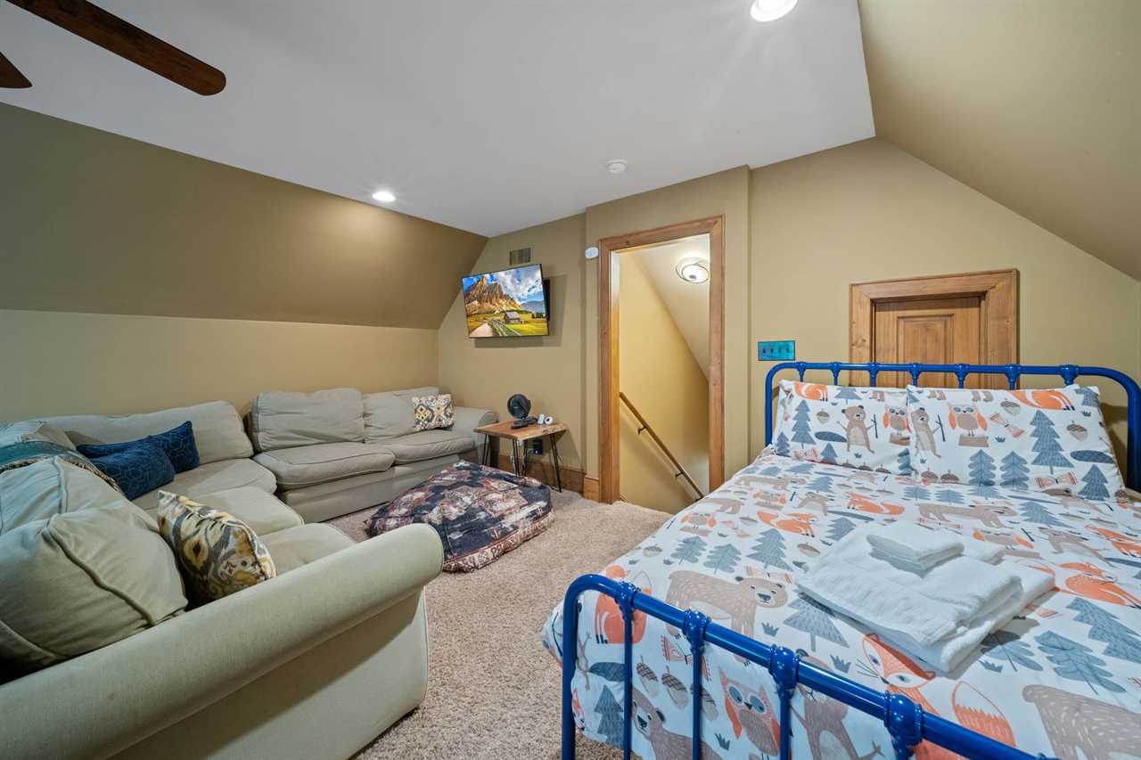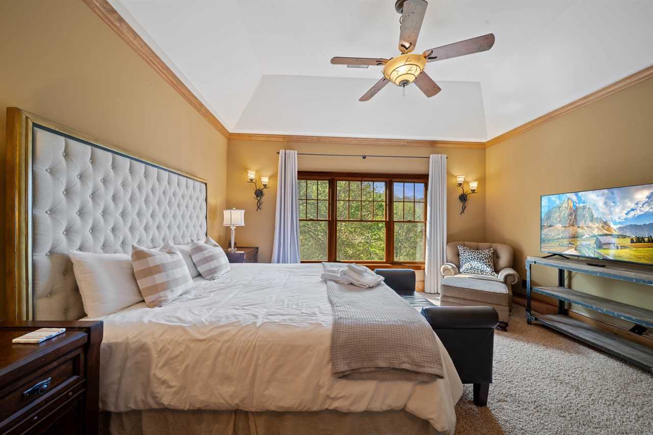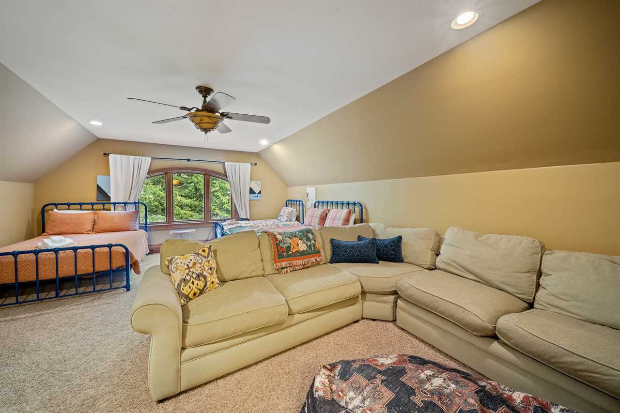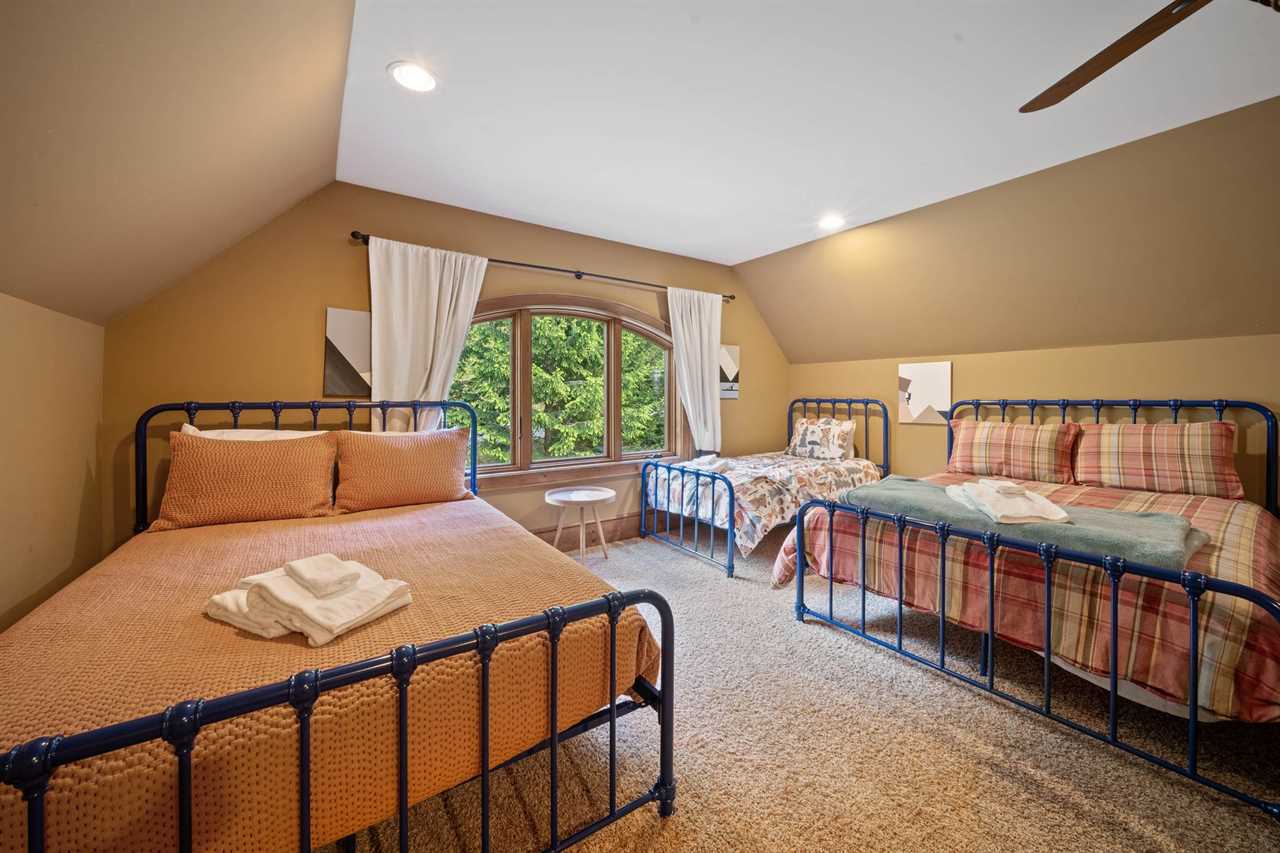 The Bird's Nest comfortably accommodates up to 10 adults and up to 7 children. On the main level, there are three bedrooms and two full bathrooms. The master suite includes a king bed and a large ensuite bathroom with dual sinks, a walk-in shower, and a jacuzzi tub. The second bedroom features a king bed, and the third bedroom includes two twin beds. These two rooms share a hallway bathroom. On the lower level, you'll find a second master suite with a king bed, TV, and a private bathroom with a walk-in shower. Another bedroom on this level features a queen bed and TV, with access to a full bathroom located in the hallway. The upper level offers an open bunk-style layout with a variety of beds, a large sectional, and a TV—perfect for kids. Please note that there is no bathroom on the upper level.