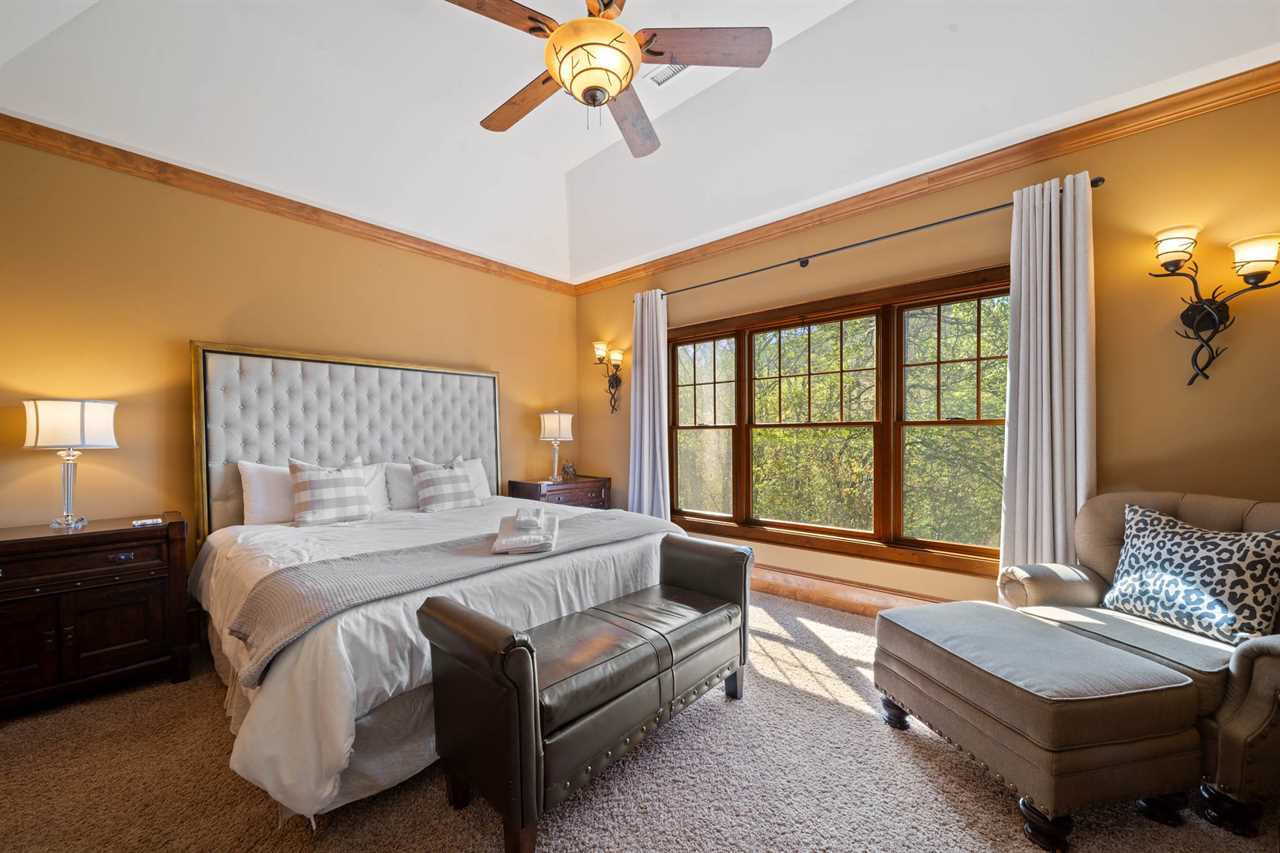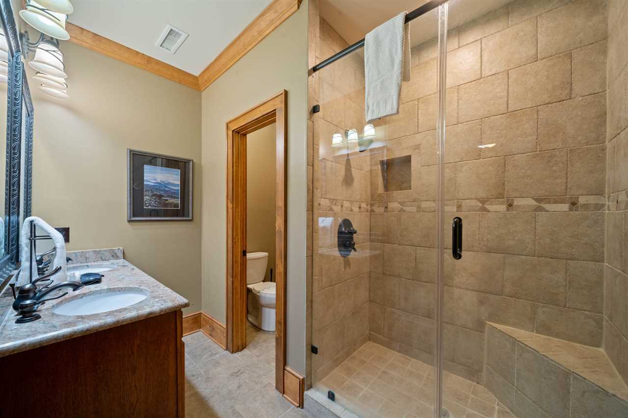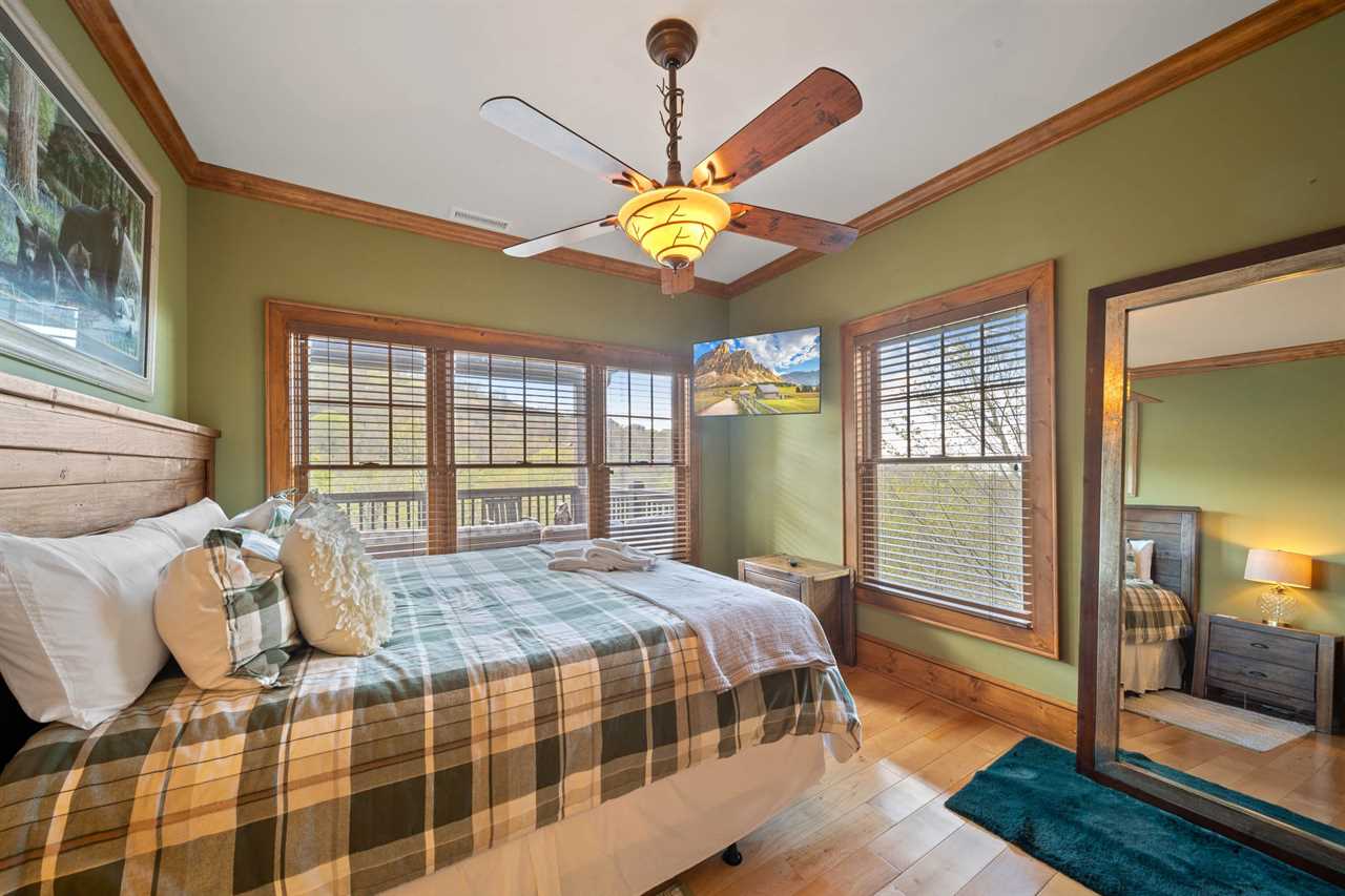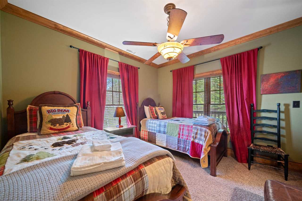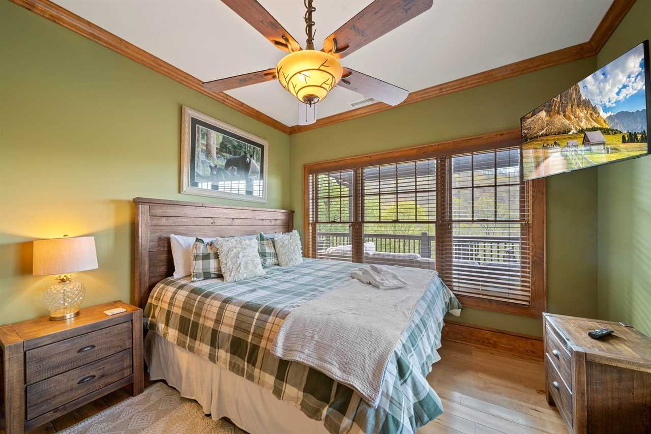 The Bird's Nest comfortably accommodates up to 10 adults and up to 7 children. On the main level, there are three bedrooms and two full bathrooms. The master suite includes a king bed and a large ensuite bathroom with dual sinks, a walk-in shower, and a jacuzzi tub. The second bedroom features a king bed, and the third bedroom includes two twin beds. These two rooms share a hallway bathroom. On the lower level, you'll find a second master suite with a king bed, TV, and a private bathroom with a walk-in shower. Another bedroom on this level features a queen bed and TV, with access to a full bathroom located in the hallway. The upper level offers an open bunk-style layout with a variety of beds, a large sectional, and a TV—perfect for kids. Please note that there is no bathroom on the upper level.