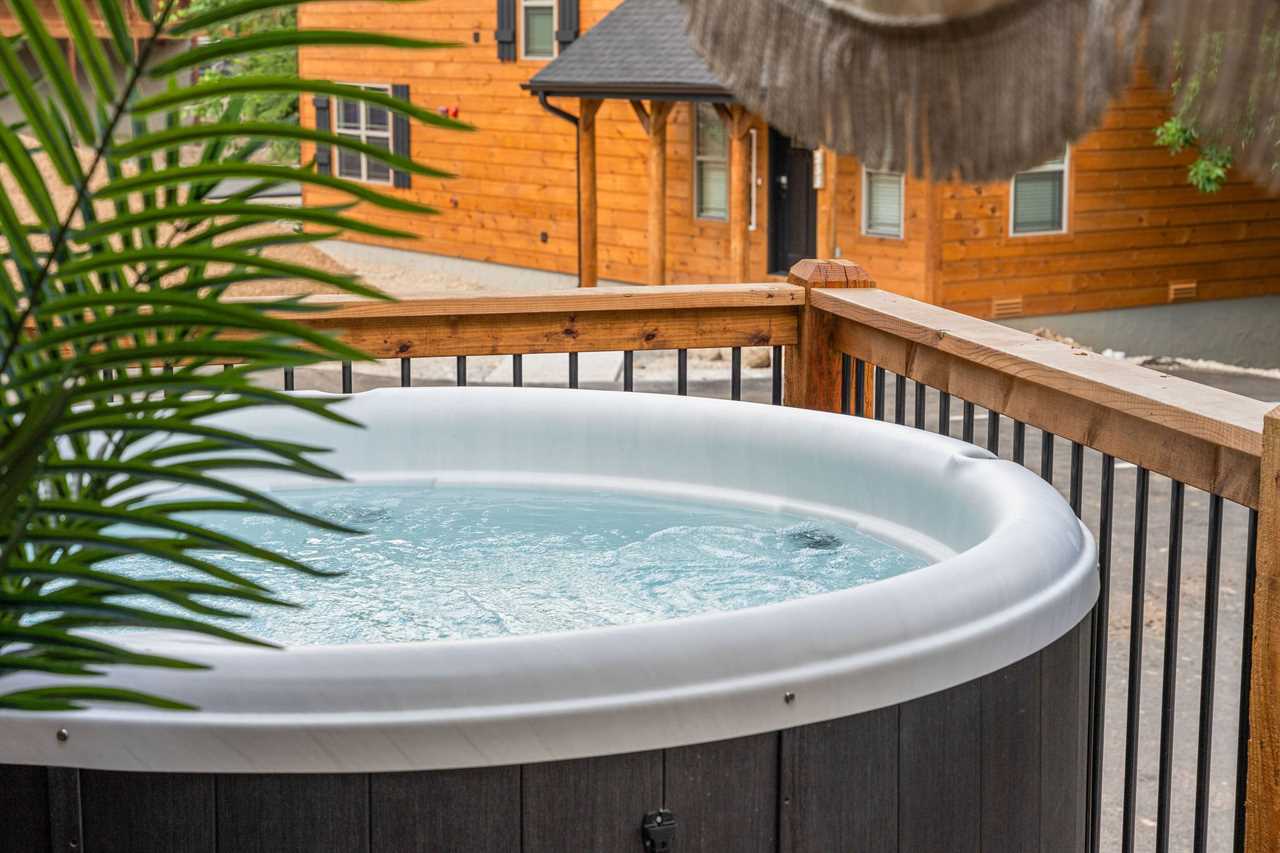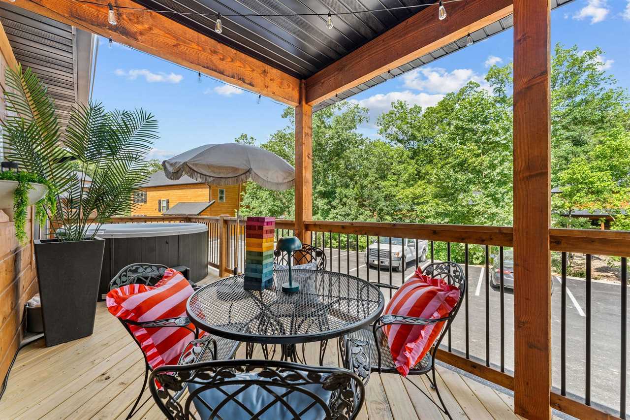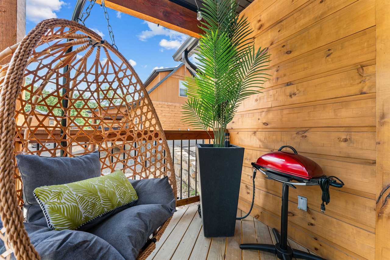 ✦ ✦ Partially covered patio with private hot tub, patio bistro set, hanging pod chair, electric grill, and string lights