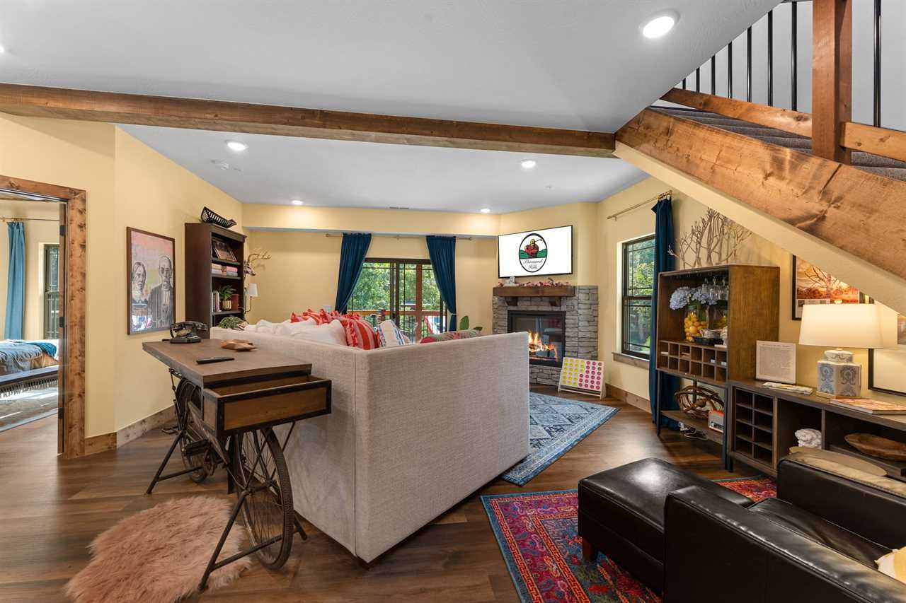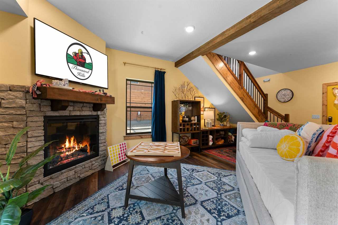 ✦ ✦ Open-concept great room with fireplace and Smart TV