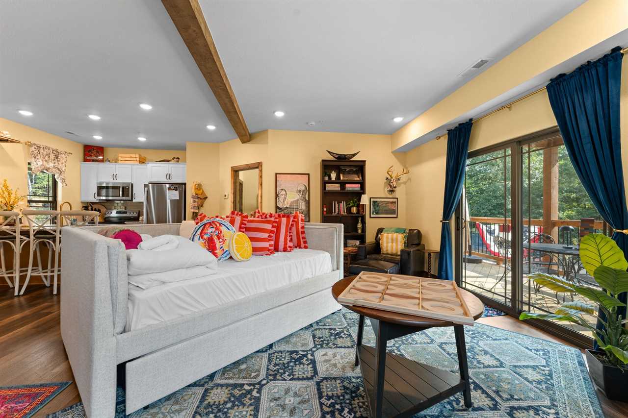 Inside, you'll find bright, open spaces with modern touches throughout — a fully equipped kitchen, an inviting living area with a smart TV, and cozy seating perfect for movie nights or quiet mornings. Bedrooms feature plush bedding and thoughtful details that make it easy to unwind after a full day of Branson adventures.
