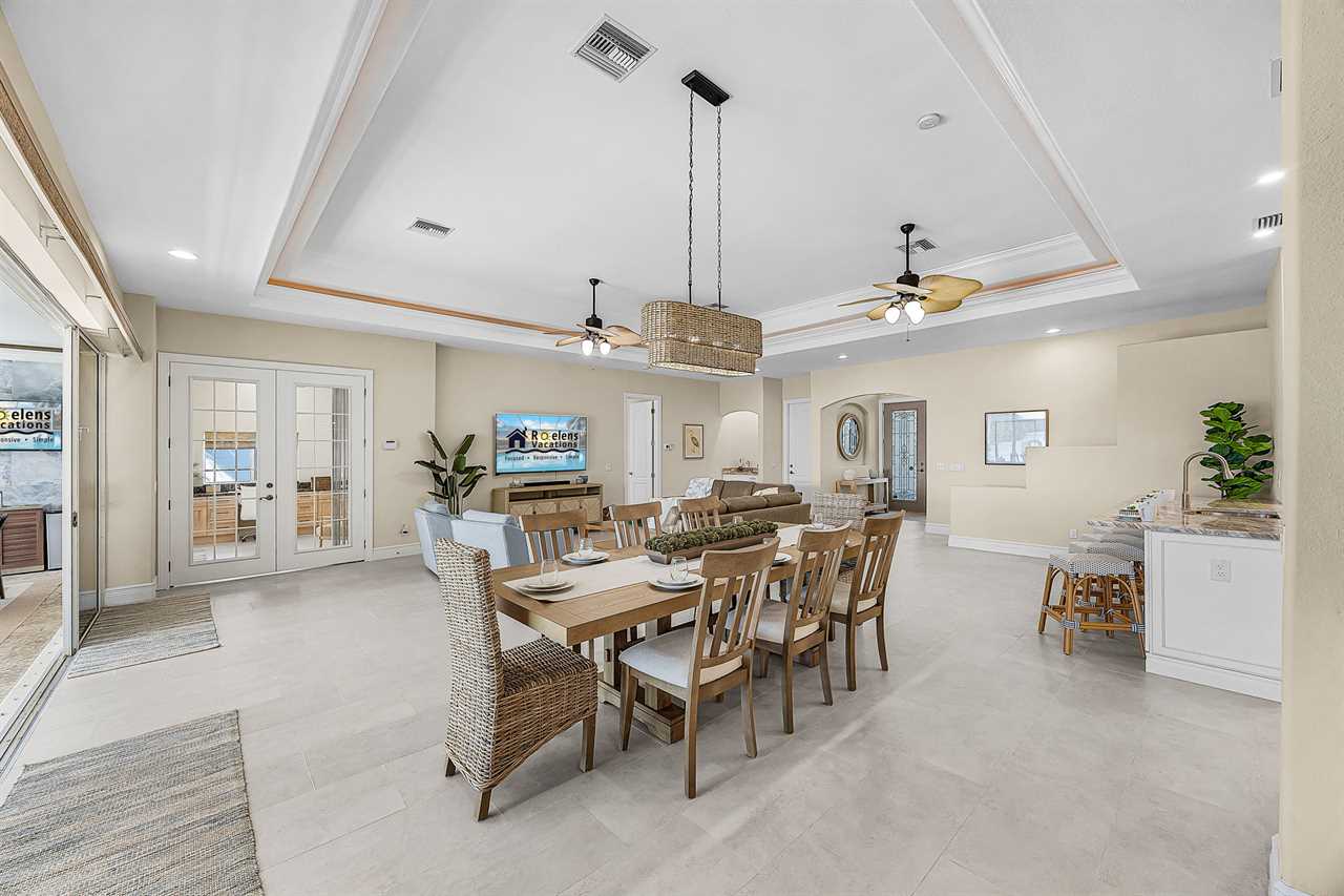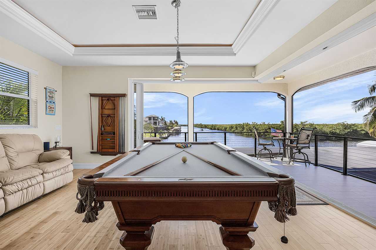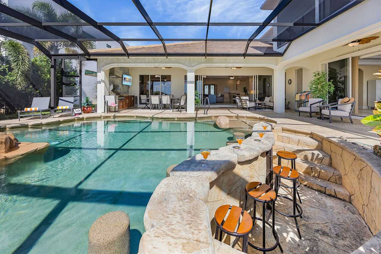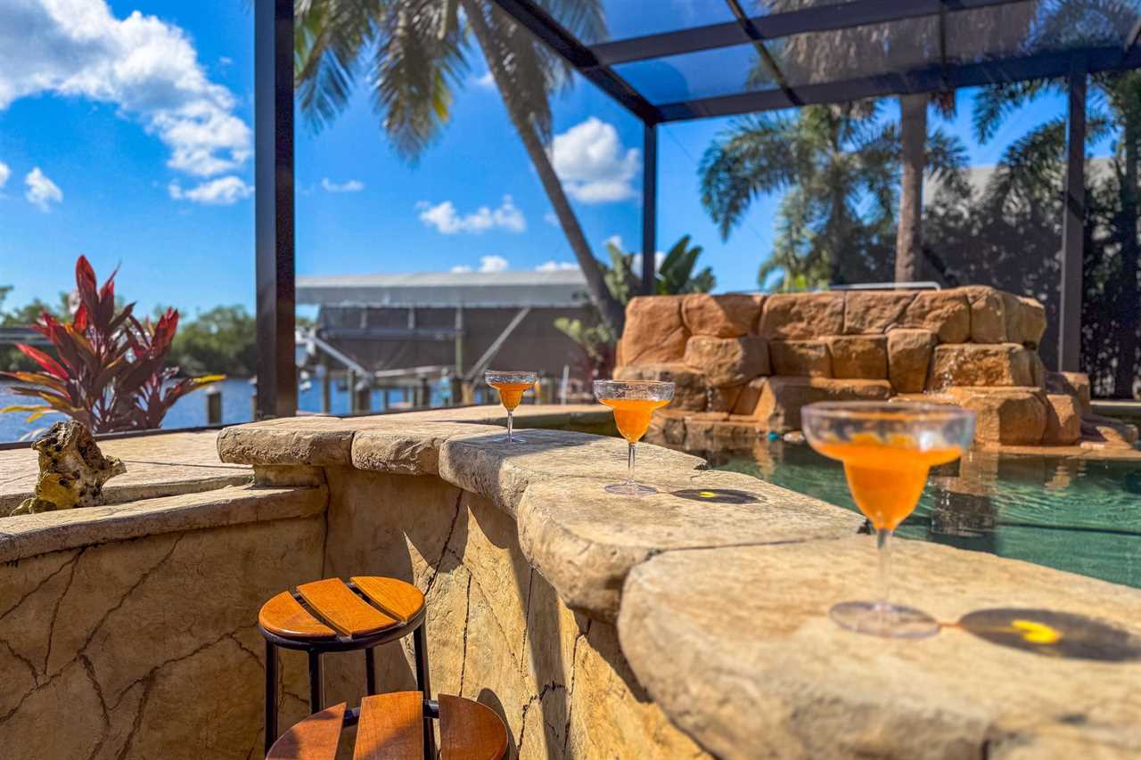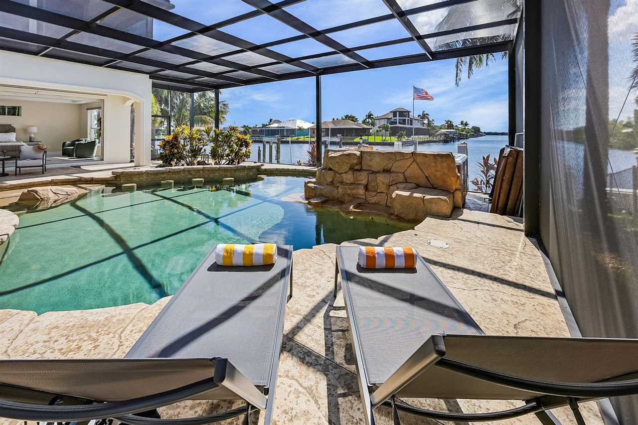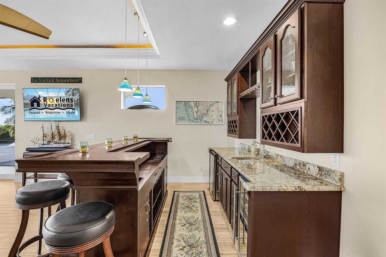 Coral Horizon Villa Where Luxury Meets the Horizon Welcome to Coral Horizon Villa, your ultimate Cape Coral escape where sunshine, style, and serenity come together. Designed for family gatherings and unforgettable getaways, this stunning home offers the perfect blend of comfort and waterfront adventure. From sunrise coffee on the lanai to sunset swims in the private pool, every moment here feels like a dream. Here's what makes this home so special: Bedding Arrangement: 5 Bedrooms: Master Suite 1: King-size bed, Smart TV, direct lanai access, ensuite bathroom Master Suite 2: King-size bed, Smart TV, ensuite bathroom, ensuite office with direct lanai access Guest Bedroom 1: Queen-size bed, Smart TV Guest Bedroom 2: Queen-size bed, Twin over Full bunkbeds Guest Bedroom 3: Two XL Twin-size beds Top Features Sleeps 13 Heated Pool & Spa with Swim-Up Bar: Spend your days soaking up the Florida sunshine in the heated pool or unwind in the bubbling spa. The swim-up bar adds a fun resort-style touch, making it easy to sip cocktails without ever leaving the water. It's the ultimate spot for both relaxation and celebration. Expansive Lanai with Grill: The spacious screened lanai offers the perfect blend of shade and sun. Fire up the grill for a family barbecue, dine al fresco at the outdoor table, or relax in the lounge area as the evening breeze sets in. This is Florida living at its finest. Spacious Living Room: With soaring ceilings, abundant natural light, and plush seating, the living room is designed to bring everyone together. Enjoy movie nights on the Smart TV, gather for games, or simply stretch out and relax after a day of adventure. Game Room with Pool Table & Bar: Keep the good times rolling even when indoors. Challenge friends to a game of pool, mix up drinks at the bar, or enjoy laughter-filled evenings in this dedicated entertainment space. Perfect for both adults and kids, rain or shine. Gulf Access & Private Dock: Launch your boat or kayak right from the private dock and set off on a Gulf adventure. Whether you're fishing, cruising through Cape Coral's scenic canals, or heading out to the open water, the dock makes it easy to embrace waterfront living. Bikes Included: Discover Cape Coral at a slower pace with complimentary bikes. Cruise along palm-lined streets, explore nearby parks, or ride out to grab a coffee or ice cream. It's the perfect way to enjoy the laid-back lifestyle of this coastal town Nestled in one of Cape Coral's most desirable neighborhoods, Coral Horizon Villa places you close to marinas, dining, shopping, and the best local beaches. Whether you're planning a family vacation, a reunion, or simply a relaxing retreat, this home has everything you need to create lasting memories. Book your stay at Coral Horizon Villa today and experience the perfect blend of relaxation and adventure! Roelens Vacations is proud to partner with the city to promote recycling and make our community more sustainable and greener. Thank you for your cooperation and for being part of a more sustainable future! DISCLAIMERS: This home does not allow pets. This home has a minimum age requirement of 25 to book. Smoking is not allowed on the property.