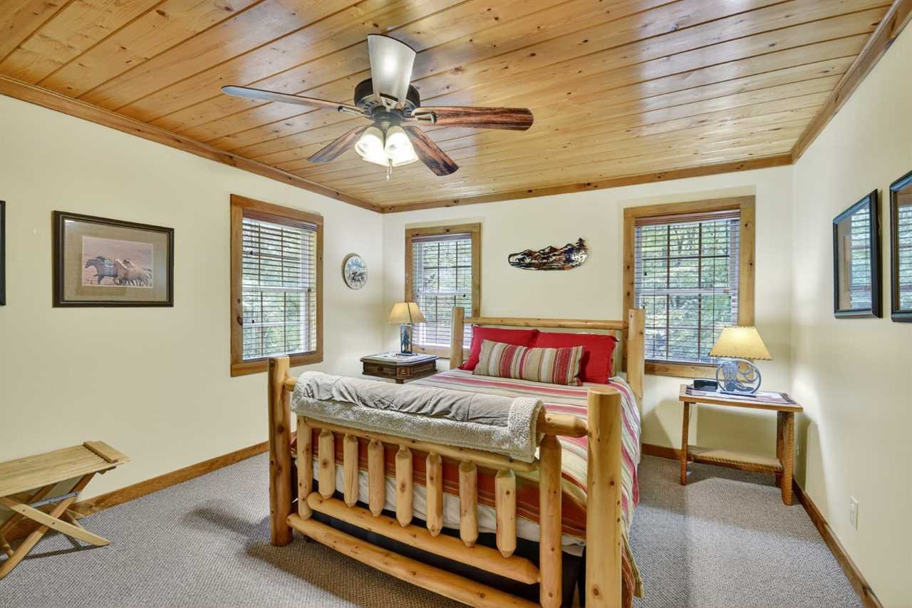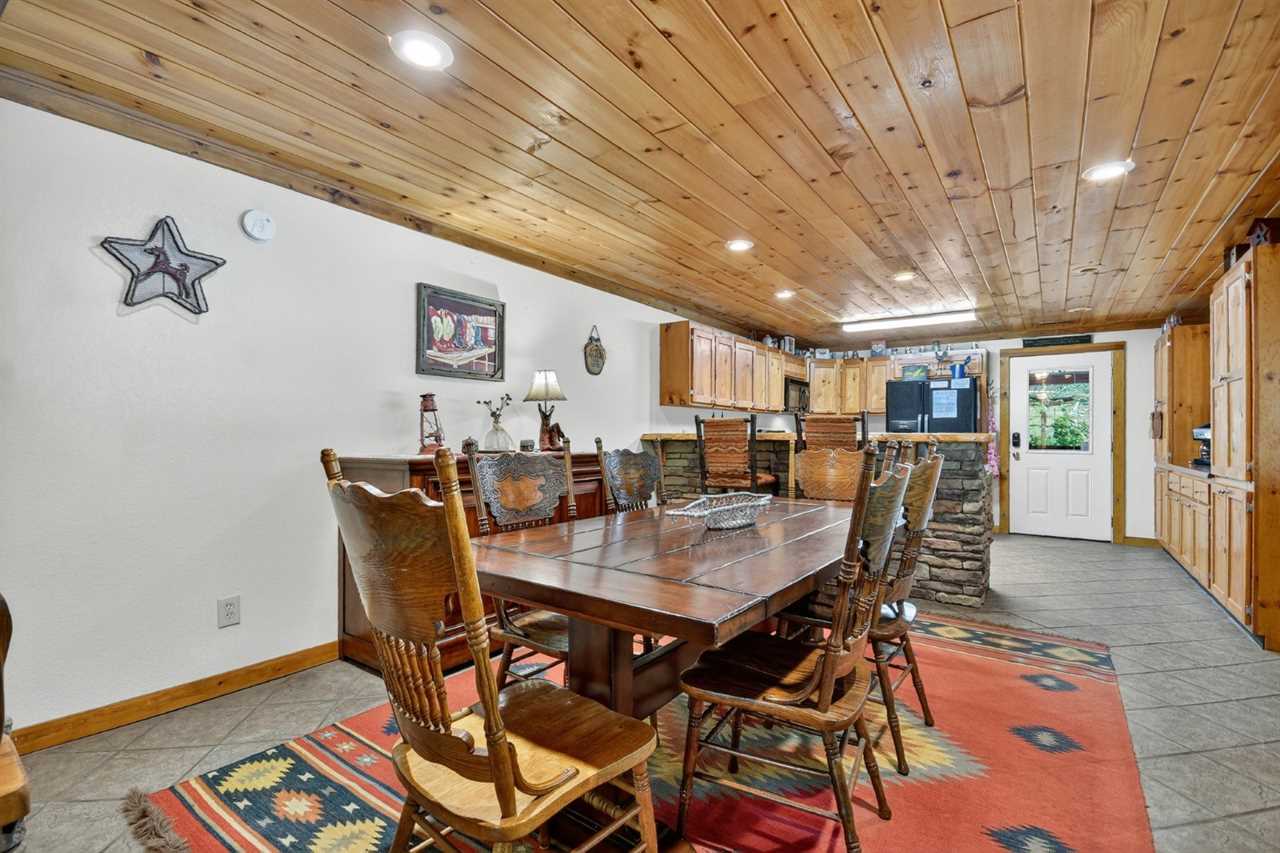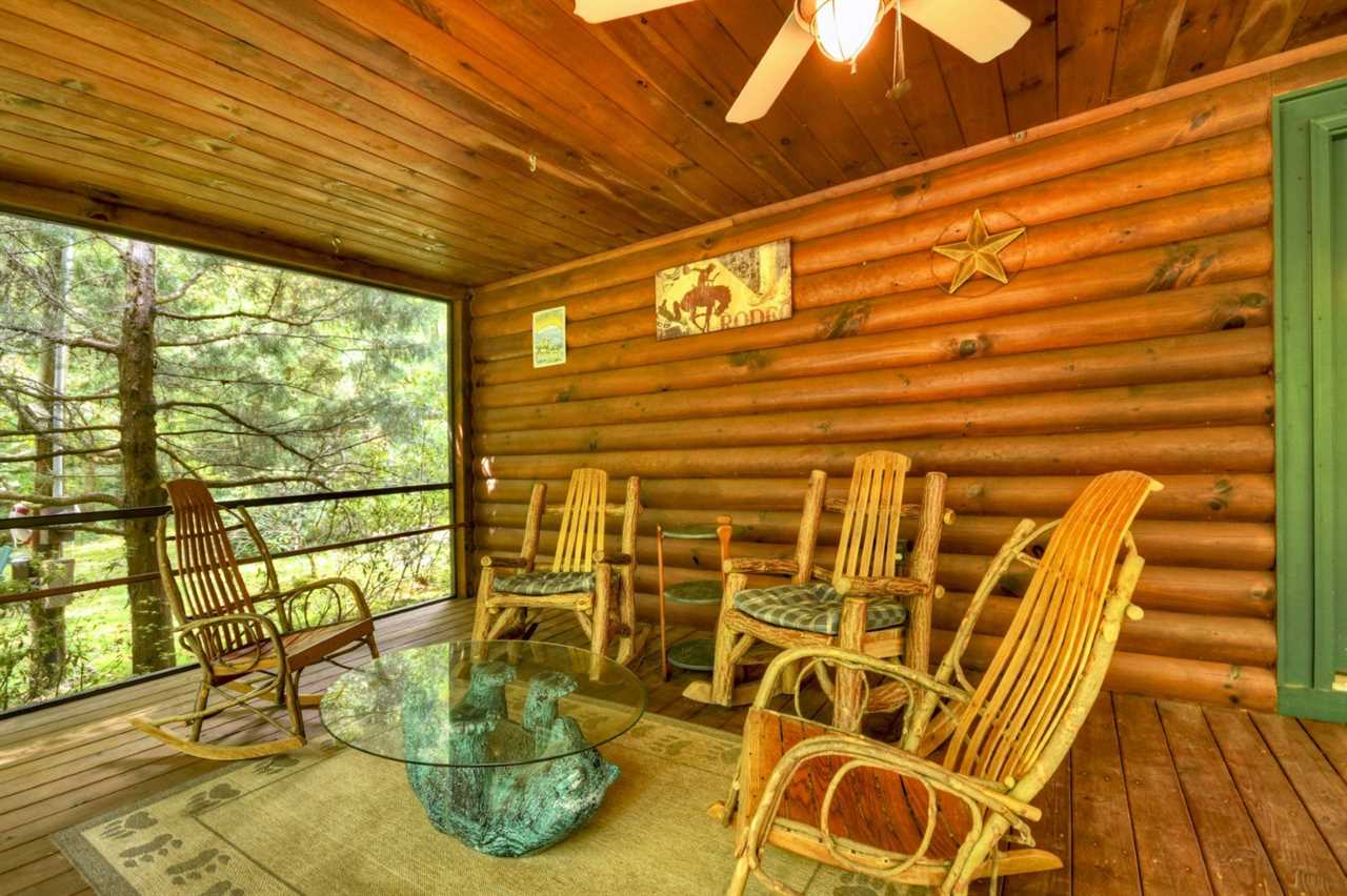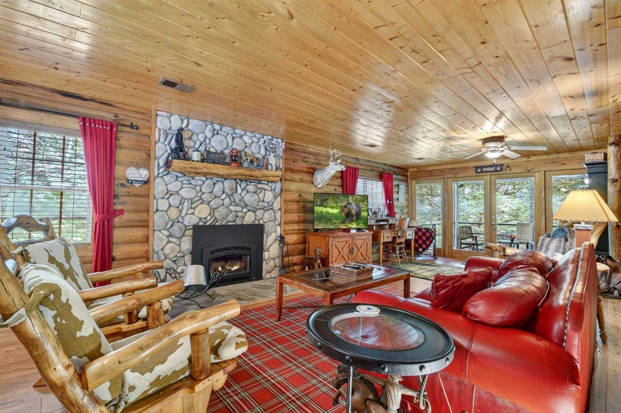Inside, rustic charm meets comfort with a wood-burning fireplace, log-style rockers, and cozy spaces to enjoy. For more fun, walk to the bonus cabin and set up friendly tournaments in the game room — with poker, pool, darts, and board games. A big screen TV with a movie library, a fully equipped kitchen with a breakfast bar, and a dining table for family meals make the main cabin perfect for togetherness. The screened porch and private deck off the primary suite give you even more options to unwind.