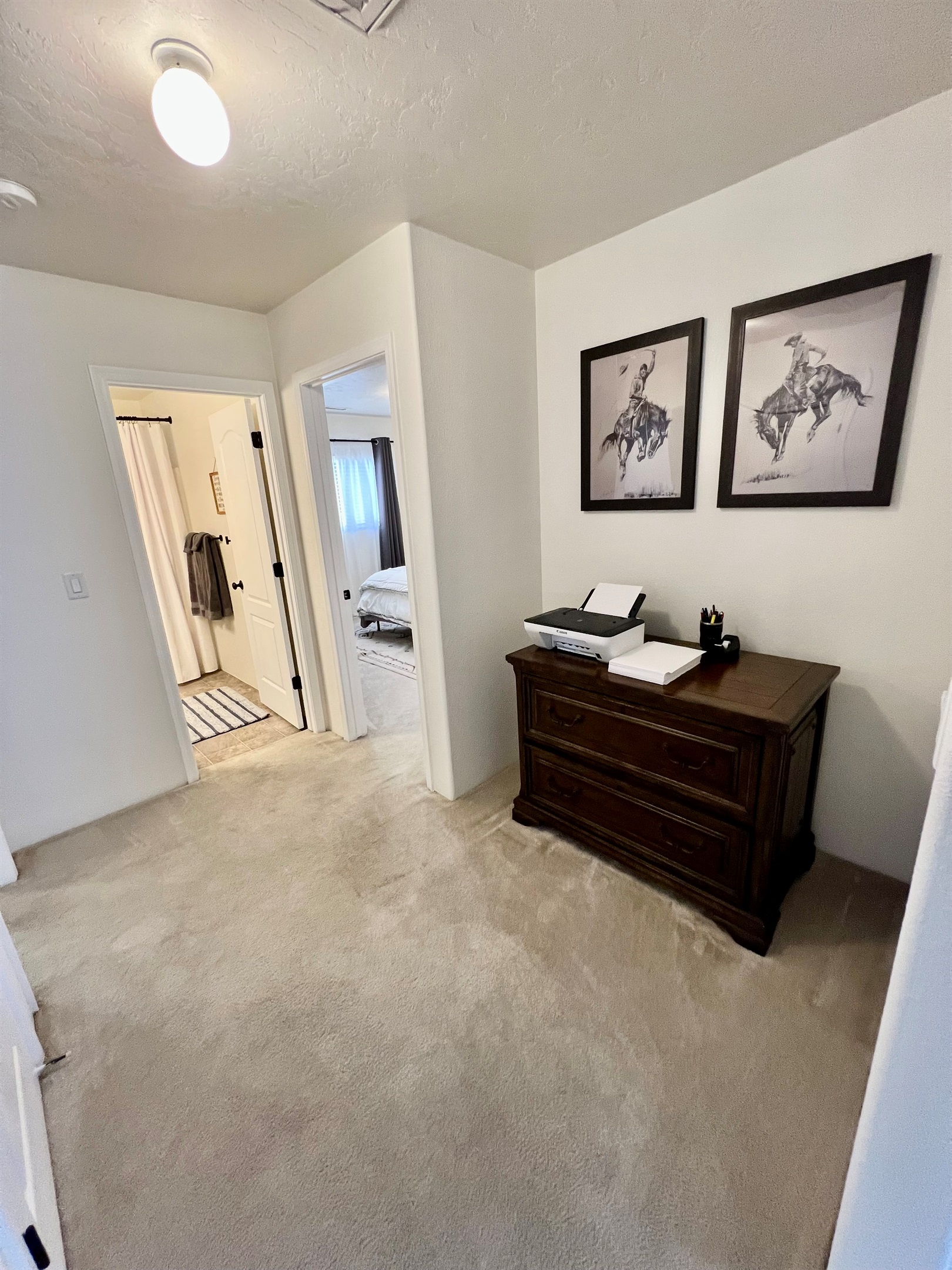 → Bedroom 3 (Flex Space): This versatile room features a comfortable Queen Bed and a dedicated workspace with a desk and chair, creating a perfect, quiet office for remote work.