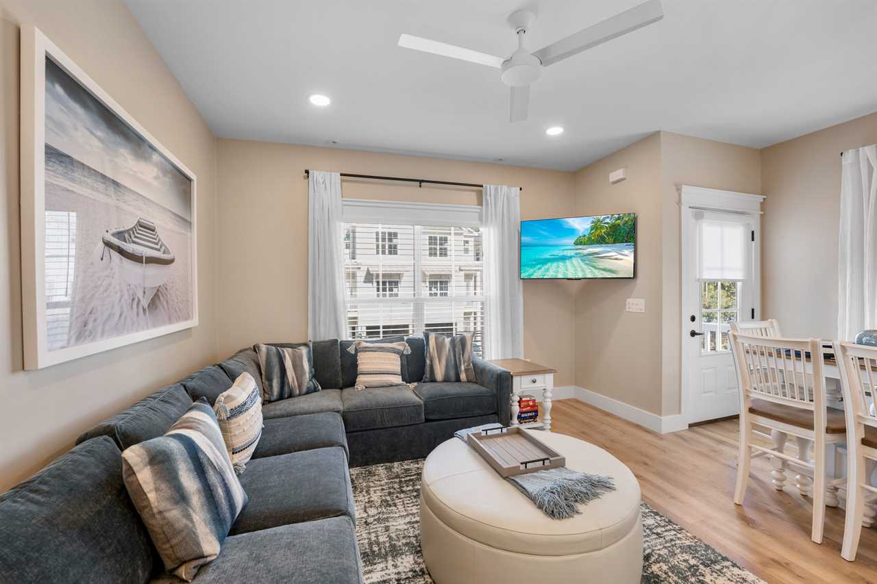 Relax in the inviting living area, thoughtfully designed for both comfort and entertainment. A plush gray sectional sofa, matching ottoman, large flat-screen Smart TV, and tasteful coastal décor create the ideal space to kick back after a day in the sun.