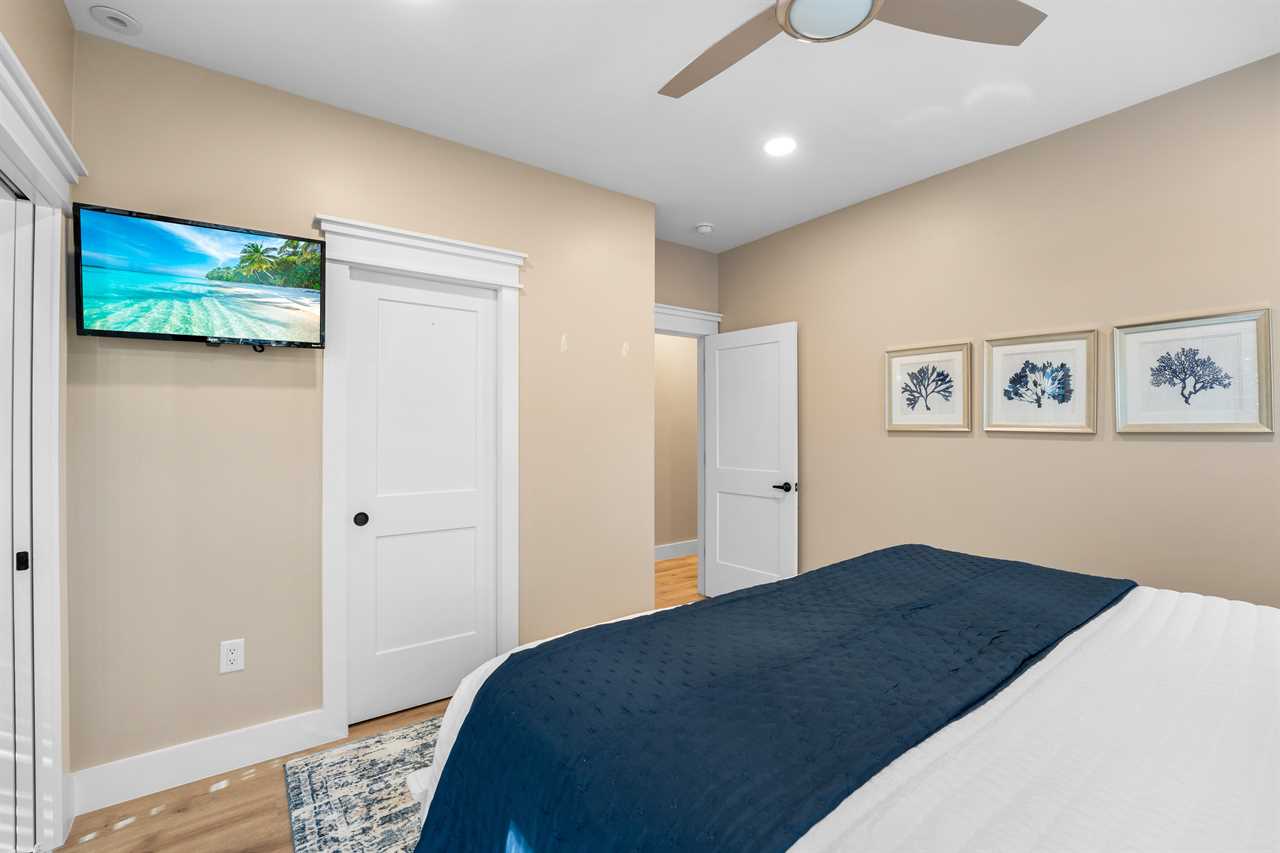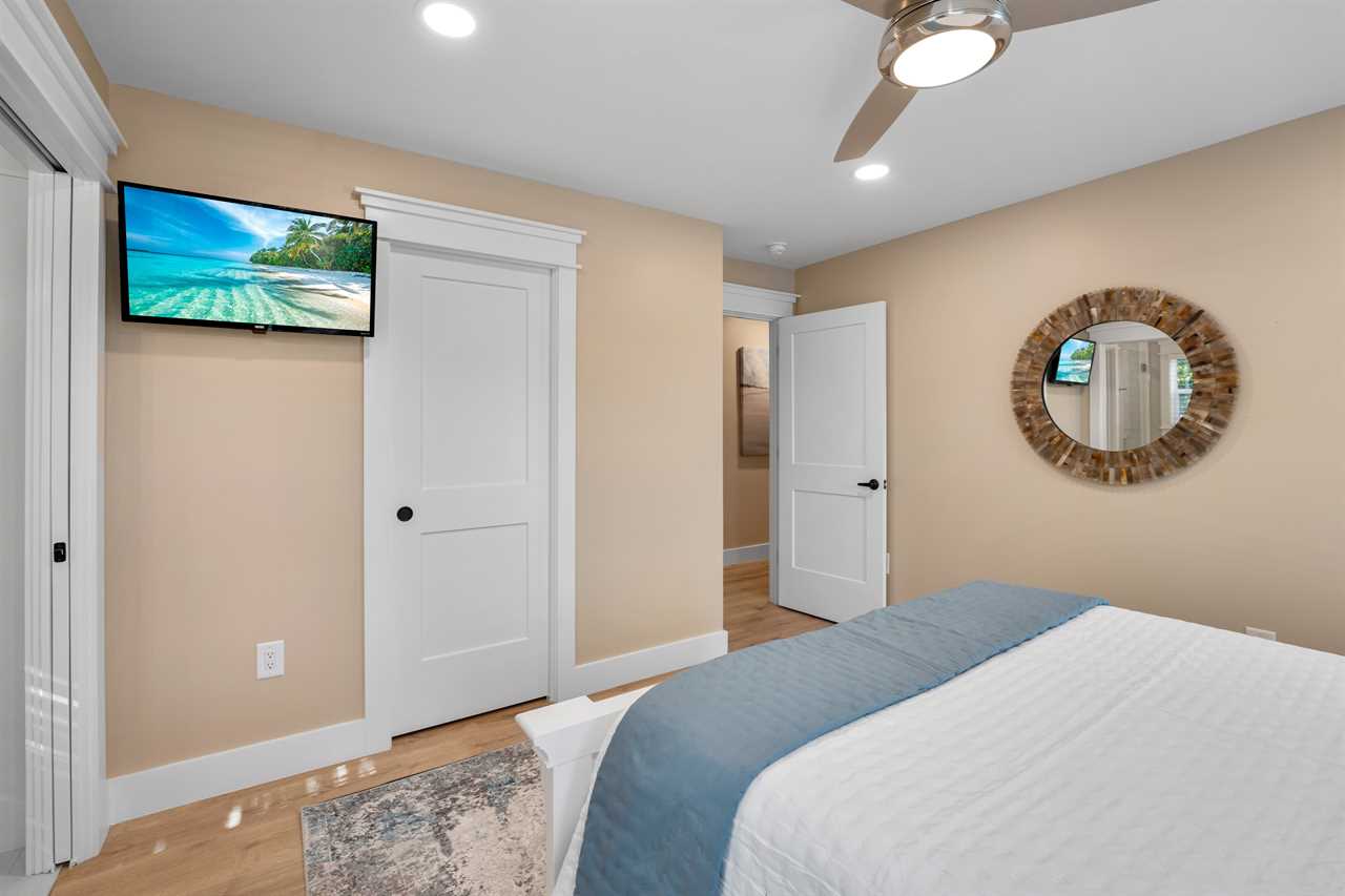 ✓ Bedroom 1: 1 King Bed, en-suite bathroom with double vanity, luxurious walk-in shower, access to private screened in porch deck, Smart TV