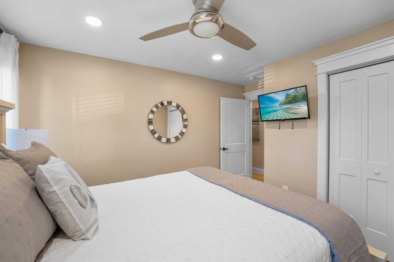 The second level is home to the Primary Bedroom, featuring a King bed, en-suite bathroom with a double vanity, a spacious walk-in shower, and access to a cozy screened porch—perfect for morning coffee or an evening unwind. A convenient half bath is also located nearby, just off the kitchen area.